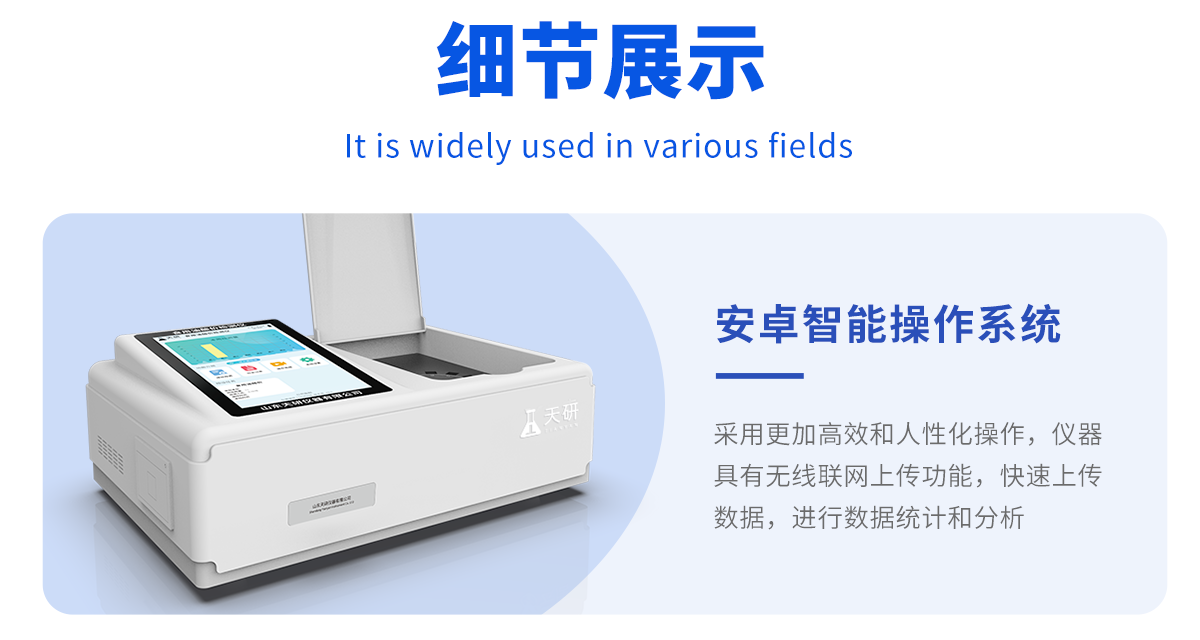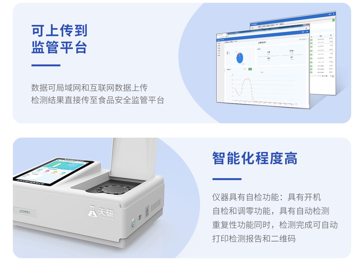 | 儀器采用臺式一體化系統(tǒng)檢測技術(shù),將分光光度模塊、新型農(nóng)殘檢測模塊、數(shù)字化管理模塊、無線通訊模塊高度集成于一體,支持檢測200種食品安全檢測項目,同時預(yù)留升級檢測方法。 | 儀器檢測模塊標(biāo)準(zhǔn)化、智能化,可隨意自由組合。檢測箱體內(nèi)置多個標(biāo)準(zhǔn)檢測單元,檢測模塊可以調(diào)整配置。 | 儀器采用全新安卓智能系統(tǒng),主控芯片采用 ARM Cortex-A7,RK3288/4核處理器,10.1寸高清液晶觸摸豎屏,更加**的UI交互界面,運轉(zhuǎn)快捷;儀器配備無線通信模塊: 4G(APN)通訊模塊、Wifi模塊,藍(lán)牙傳輸,同時具有雙USB接口以及RJ45接口能以多種方式實現(xiàn)數(shù)據(jù)保存和數(shù)據(jù)傳輸功能。 | 創(chuàng)新檢測模式: | ★檢測通道:≥12通道;采用精密旋轉(zhuǎn)比色池設(shè)計,使用同芯片同光源校準(zhǔn)精度,解決不同光源之間的誤差值。1-12通道間誤差0.1%。(**號:ZL202022821055.2) | ★儀器具有自動識別比色皿檢測功能,即:將樣品比色皿放入儀器后,點擊樣品檢測,儀器自動識別比色皿進(jìn)行通道檢測。 | 進(jìn)口高精光源: | 高精度進(jìn)口四波長冷光源,通道配置 410、520、590、630nm 波長光源,一個光源芯片驅(qū)動一個光源,誤差極小,每臺設(shè)備單獨**校準(zhǔn)光源,**比對,同時參照四種不同波段光源全方位覆蓋市面上99%的農(nóng)殘食品項目檢測。 | 智能化操作系統(tǒng): | 便捷操作系統(tǒng):設(shè)備檢測時可在同一檢測界面自動對應(yīng)相關(guān)檢測通道一次性選擇1-12個樣品名稱,無須退出界面,節(jié)省操作時間。 | 數(shù)據(jù)集成系統(tǒng):設(shè)備首頁自動統(tǒng)計檢測數(shù)據(jù)包含:周檢測數(shù)據(jù)、月檢測數(shù)據(jù),全部檢測總數(shù)量,均包含檢測總數(shù),合格數(shù),不合格數(shù),以及相關(guān)柱形分析圖,對各項檢測數(shù)據(jù)清晰掌握,無需電腦查詢,更加快捷直觀。 | 項目預(yù)設(shè)系統(tǒng):支持添加單個及多個相同或不相同的任務(wù)預(yù)設(shè),一鍵快速調(diào)取,每一個任務(wù)分別可以設(shè)置不同的樣品、批次、編號、來源、備注、抽樣信息、檢測信息、受檢信息、復(fù)核信息等更多信息。無縫鏈接平臺和APP實時查看下發(fā)任務(wù)。 | 數(shù)據(jù)監(jiān)管系統(tǒng):同步對接監(jiān)管平臺,數(shù)據(jù)可局域網(wǎng)和互聯(lián)網(wǎng)數(shù)據(jù)上傳,檢測結(jié)果可選擇直接傳至食品安全監(jiān)管平臺。集成OSS輸出存儲服務(wù)、區(qū)分設(shè)備定向管理應(yīng)用,進(jìn)行區(qū)域食品安全監(jiān)管及大數(shù)據(jù)分析處理與數(shù)據(jù)統(tǒng)計,檢測區(qū)域食品安全長短期動態(tài),達(dá)到食品安全問題預(yù)估、預(yù)警。 | 自定義打印系統(tǒng):內(nèi)置全新打印系統(tǒng),新創(chuàng)自定義打印方式,可按需靈活設(shè)置開啟或關(guān)閉:產(chǎn)品合格證(國家農(nóng)業(yè)部標(biāo)準(zhǔn)要求),二維碼,抽樣信息、檢測信息,受檢信息、復(fù)核信息、抽樣日期、檢測日期等信息的打印。 | 系統(tǒng)遠(yuǎn)程更新功能:可定向分客戶分儀器更新系統(tǒng),按照不同客戶后期實際需求添加項目,無需機器返廠,即可遠(yuǎn)程實時升級全新系統(tǒng),節(jié)省時間成本及避免運輸造成設(shè)備損壞。 | 儀器主機采用一體化防水、抗壓、防撞擊、防腐蝕箱體設(shè)計,同時配備交直流供電,可連接車載電源,可選配大容量充電鋰電池,滿足現(xiàn)場野外檢測需求。 | 安全證書,放心保障:儀器具有中國計量科學(xué)研究院校準(zhǔn)證書,**認(rèn)證。 |