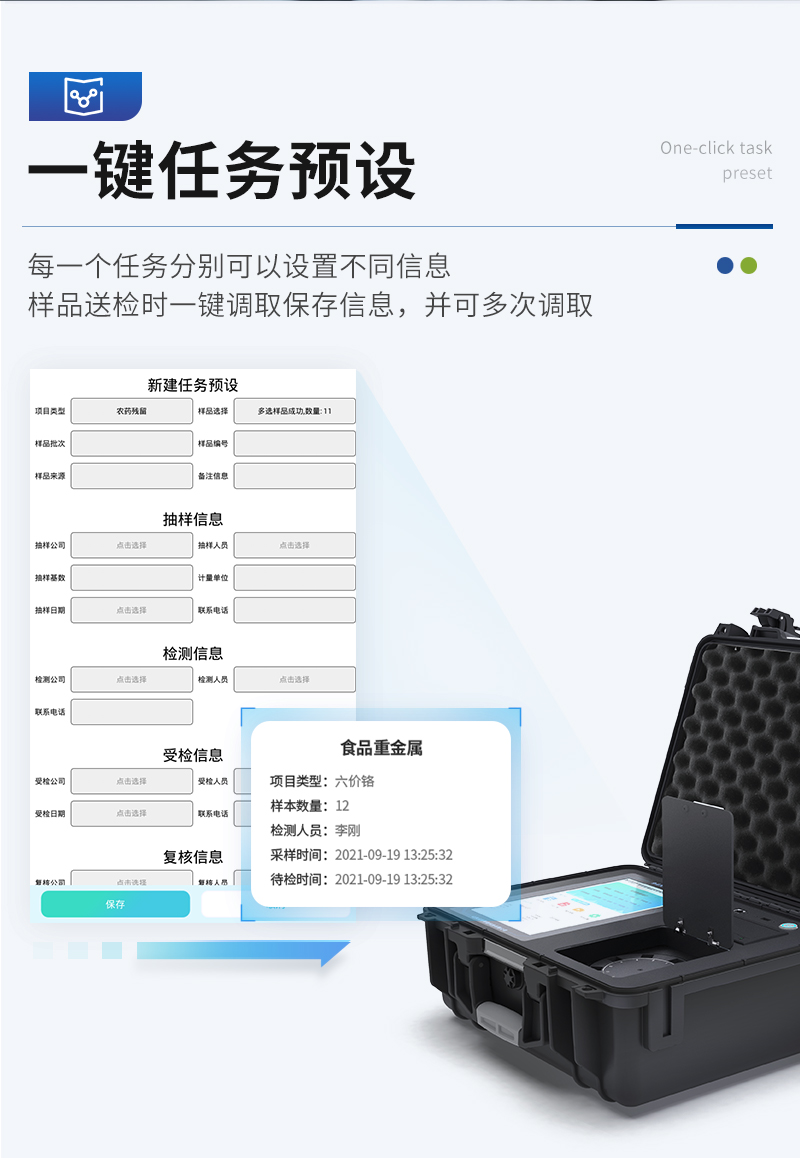 | 儀器采用手提一體化系統(tǒng)檢測技術(shù),將分光光度模塊、數(shù)字化管理模塊、無線通訊模塊高度集成于一體,可支持檢測60種食品安全檢測項目,同時預(yù)留升級檢測方法。 | 儀器檢測模塊標(biāo)準(zhǔn)化、智能化,檢測項目可隨意自由組合。檢測箱體內(nèi)置多個標(biāo)準(zhǔn)檢測單元,檢測模塊可以調(diào)整配置。 | 儀器采用全新安卓智能系統(tǒng),主控芯片采用 ARM Cortex-A7,RK3288/4核處理器,10.1寸高清液晶觸摸豎屏,更加**的UI交互界面,運(yùn)轉(zhuǎn)快捷;儀器配備無線通信模塊: 4G(APN)通訊模塊、Wifi模塊,藍(lán)牙傳輸,同時具有雙USB接口以及RJ45接口能以多種方式實(shí)現(xiàn)數(shù)據(jù)保存和數(shù)據(jù)傳輸功能。 | 顯示屏幕:儀器采用10.1英寸豎向液晶觸摸屏顯,搭配運(yùn)行安卓智能操作系統(tǒng),主控芯片采用ARM Cortex-A7,RK3288/4核處理器,主頻1.88Ghz,操作方便,性能更強(qiáng)。 | 檢測通道:≥12通道;采用精密旋轉(zhuǎn)比色池設(shè)計,使用同芯片同光源校準(zhǔn)精度,解決不同光源之間的誤差值,更加準(zhǔn)確**。(1-12通道間誤差0.1%,**號:ZL202022821055.2) | 儀器光源:高精度進(jìn)口四波長冷光源,每個通道均配置 410、520、590、630nm 波長光源,標(biāo)配**的光路切換裝置,**光路切換功能可實(shí)現(xiàn)64波長,并且所有檢測項目可實(shí)現(xiàn)所有通道同時檢測。 | 設(shè)備可一鍵校準(zhǔn),自動保存校準(zhǔn)數(shù)據(jù),自動對比校驗(yàn),得到精準(zhǔn)光源,采用Android SP存儲數(shù)據(jù),光源數(shù)據(jù)永不丟失,方便每一次使用。 | 通訊接口:配備無線通信模塊、4G(APN)通訊模塊、藍(lán)牙傳輸,同時具有雙USB接口以及RJ45網(wǎng)線接口,可以多方式實(shí)現(xiàn)數(shù)據(jù)保存及數(shù)據(jù)傳輸。 | 存儲方式:支持U盤存儲,標(biāo)準(zhǔn)USB接口,免驅(qū)動安裝。檢測結(jié)果存儲容量20萬條以上,可生成Excel表格進(jìn)行拷貝,并具有登錄保護(hù)功能。 | 智能化操作系統(tǒng): | 1、操作系統(tǒng):儀器可在同一檢測界面自動對應(yīng)相關(guān)檢測通道,一次性選擇1-12個樣品名稱,無需退出界面,節(jié)省操作時間。并可以對每個通道屬性和樣品信息單獨(dú)進(jìn)行編輯,例如送檢單位、人員,檢測人員等,打印時勾選打印顯示。 | 2、數(shù)據(jù)集成系統(tǒng):設(shè)備首頁自動匯總分析檢測數(shù)據(jù),包含:周檢測數(shù)據(jù)、月檢測數(shù)據(jù),全部檢測總數(shù)量,均包含檢測總數(shù),合格數(shù),不合格數(shù),以及相關(guān)柱形分析圖,各項檢測數(shù)據(jù)一目了然,無需電腦查詢,更加快捷直觀。 | 3、數(shù)據(jù)庫系統(tǒng):十幾項數(shù)據(jù)庫分類管理儀器:包含項目類型、項目數(shù)據(jù)、檢測數(shù)據(jù)、歷史記錄、國標(biāo)信息、曲線信息、采樣信息、檢測信息、受檢信息、復(fù)核信息、圖表信息、光源校準(zhǔn)信息、打印樣式信息、樣品庫信息等等,數(shù)據(jù)庫之間互相協(xié)調(diào)聯(lián)動保證數(shù)據(jù)的真實(shí)完整性。同時產(chǎn)品數(shù)據(jù)庫以及歷史檢測記錄支持一鍵檢索功能。 | 4、限量規(guī)判系統(tǒng):具有限量查詢、添加物質(zhì)合規(guī)判定系統(tǒng)。檢測出結(jié)果后,系統(tǒng)自動調(diào)用系統(tǒng)數(shù)據(jù)庫中相關(guān)國標(biāo)進(jìn)行比對判定,客觀顯示判定結(jié)果是否合格。 | 5、項目預(yù)設(shè)系統(tǒng):儀器具有任務(wù)預(yù)設(shè)模塊,一鍵提前預(yù)設(shè),給出方便快捷的新檢測方案,每一個任務(wù)分別可以設(shè)置不同的樣品、批次、編號、來源、備注、抽樣信息、檢測信息、受檢信息、復(fù)核信息等更多信息。樣品送檢時一鍵調(diào)取保存信息,并可多次調(diào)取,大大提高檢測效率。 | 6、數(shù)據(jù)監(jiān)管系統(tǒng):同步對接監(jiān)管平臺,數(shù)據(jù)可局域網(wǎng)和互聯(lián)網(wǎng)數(shù)據(jù)上傳,檢測結(jié)果可選擇直接傳至食品安全監(jiān)管平臺。進(jìn)行區(qū)域食品安全監(jiān)管及大數(shù)據(jù)分析處理與數(shù)據(jù)統(tǒng)計,檢測區(qū)域食品安全長短期動態(tài),達(dá)到食品安全問題預(yù)估、預(yù)警。 | 7、全新打印系統(tǒng):內(nèi)置全新打印機(jī),新創(chuàng)自定義打印方式,可按需靈活勾選控制:二維碼,抽樣信息、檢測信息,受檢信息、復(fù)核信息、抽樣日期、檢測日期等信息的打印。 | 8、A4紙版本報告打印功能(可選配):設(shè)備擁有兩種結(jié)果展示方式,可以自動生成A4打印模板和小票打印模板兩種樣式,可通過WiFi及網(wǎng)線等方式鏈接外置打印機(jī)可進(jìn)行打印。 | 供電模式:儀器交直流兩用,直流12V供電,可連接車載電源,可配6ah大容量充電鋰電池,電量可實(shí)時顯示,方便戶外流動測試。 | 儀器具備遠(yuǎn)程升級功能,可定向分客戶分儀器更新,開機(jī)后自動更新,并可持續(xù)性免費(fèi)更新系統(tǒng)版本,無需像傳統(tǒng)產(chǎn)品返廠更新,節(jié)省時間及人力成本并避免了物流運(yùn)輸返廠升級導(dǎo)致設(shè)備損壞的潛在風(fēng)險。 |