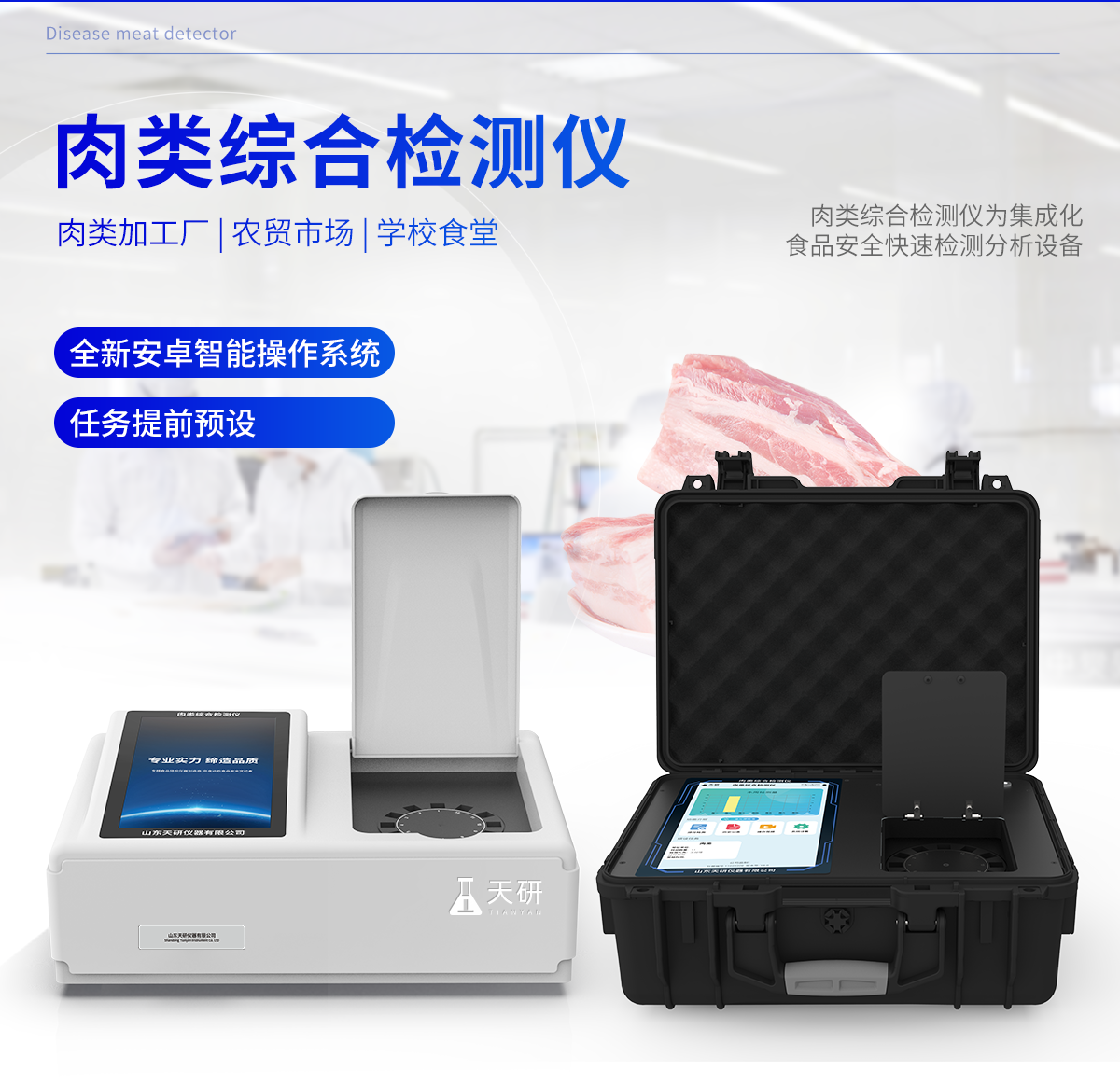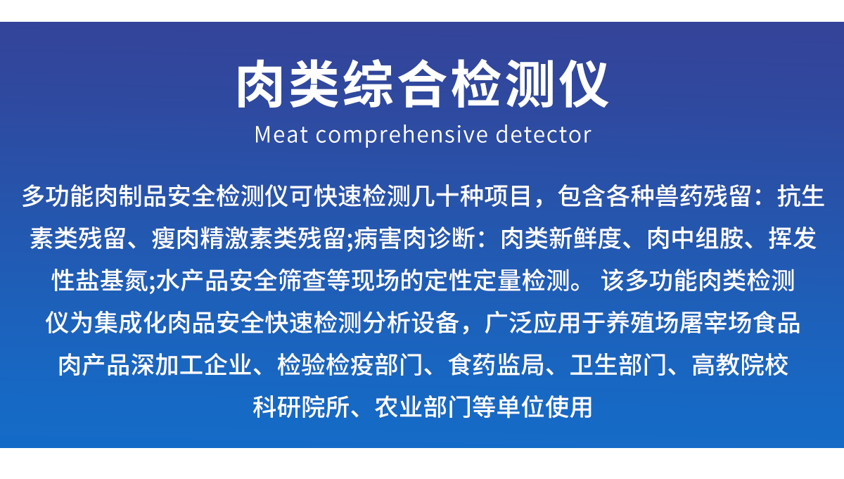 肉類綜合檢測儀可快速檢測幾十種項目,包含各種獸藥殘留:抗生素類殘留、瘦肉精激素類殘留;病害肉診斷:肉類新鮮度、肉中組胺、揮發性鹽基氮;水產品安全篩查等現場的定性定量檢測。