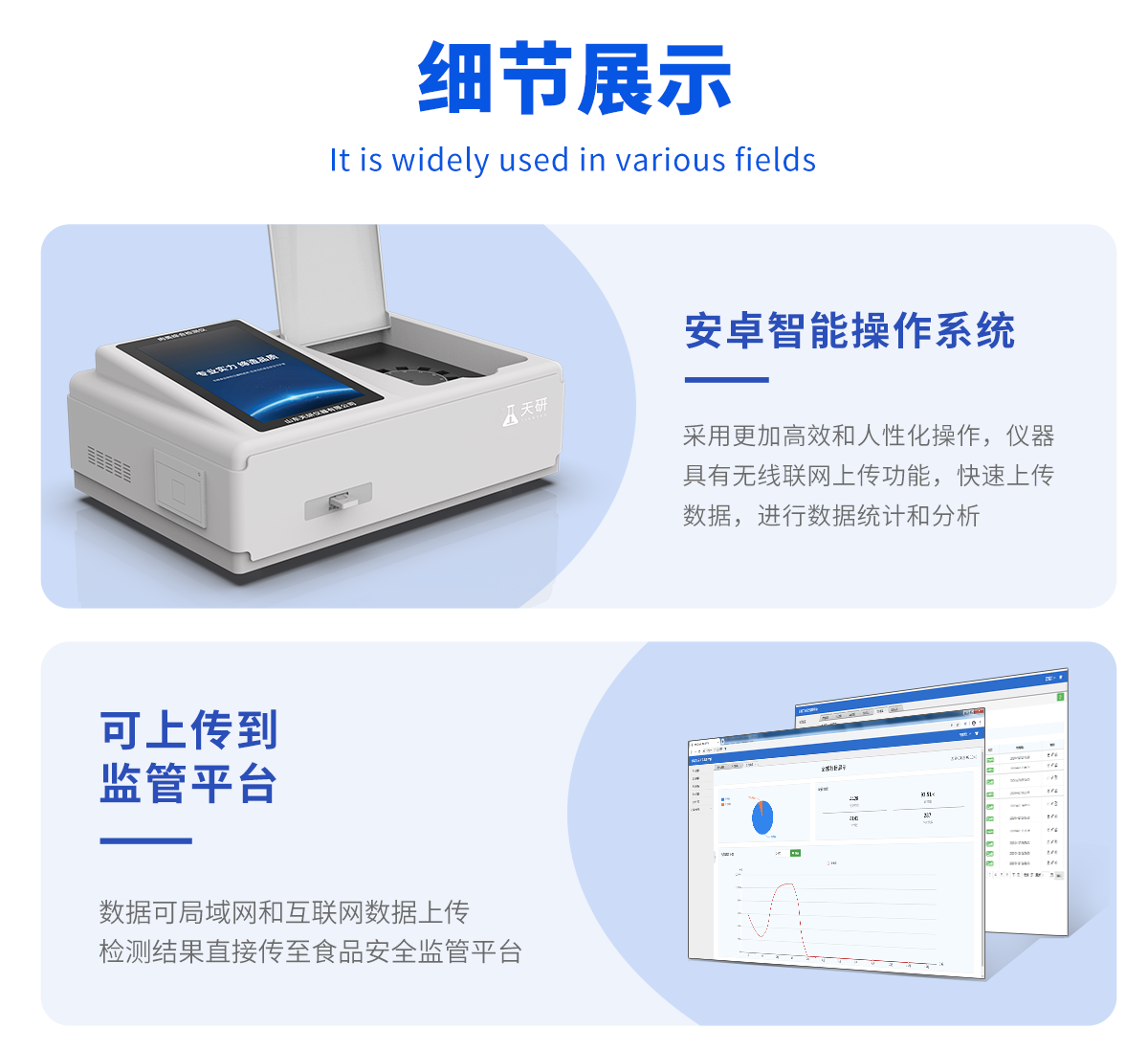 | 儀器采用臺式一體化系統檢測技術,將分光光度模塊、膠體金檢測模塊、新型農殘檢測模塊、數字化管理模塊、無線通訊模塊高度集成于一體,支持檢測200種食品安全檢測項目,同時預留升級檢測方法。 | 儀器檢測模塊標準化、智能化,可隨意自由組合。檢測箱體內置多個標準檢測單元,檢測模塊可以調整配置。 | 儀器采用全新安卓智能系統,主控芯片采用 ARM Cortex-A7,RK3288/4核處理器,10.1寸高清液晶觸摸豎屏,更加**的UI交互界面,運轉快捷;儀器配備無線通信模塊: 4G(APN)通訊模塊、Wifi模塊,藍牙傳輸,同時具有雙USB接口以及RJ45接口能以多種方式實現數據保存和數據傳輸功能。 | 創新檢測模式: | ★檢測通道:≥12通道;采用精密旋轉比色池設計,使用同芯片同光源校準精度,解決不同光源之間的誤差值。1-12通道間誤差0.1%。(**號:ZL202022821055.2) | ★儀器具有自動識別比色皿檢測功能,即:將樣品比色皿放入儀器后,點擊樣品檢測,儀器自動識別比色皿進行通道檢測。 | 進口高精光源: | 高精度進口四波長冷光源,通道配置 410、520、590、630nm 波長光源,一個光源芯片驅動一個光源,誤差極小,每臺設備單獨**校準光源,**比對,同時參照四種不同波段光源全方位覆蓋市面上99%的農殘食品項目檢測。 | 膠體金模塊檢測方式: | 采用COMS實時成像技術,可采集多個畫面,支持3個金標同時讀卡,通過不同顏色的灰度變化,一秒精準得出結果。 | 智能化操作系統: | 便捷操作系統:設備檢測時可在同一檢測界面自動對應相關檢測通道一次性選擇1-12個樣品名稱,無須退出界面,節省操作時間。 | 數據集成系統:設備首頁自動統計檢測數據包含:周檢測數據、月檢測數據,全部檢測總數量,均包含檢測總數,合格數,不合格數,以及相關柱形分析圖,對各項檢測數據清晰掌握,無需電腦查詢,更加快捷直觀。 | 項目預設系統:支持添加單個及多個相同或不相同的任務預設,一鍵快速調取,每一個任務分別可以設置不同的樣品、批次、編號、來源、備注、抽樣信息、檢測信息、受檢信息、復核信息等更多信息。無縫鏈接平臺和APP實時查看下發任務。 | 數據監管系統:同步對接監管平臺,數據可局域網和互聯網數據上傳,檢測結果可選擇直接傳至食品安全監管平臺。集成OSS輸出存儲服務、區分設備定向管理應用,進行區域食品安全監管及大數據分析處理與數據統計,檢測區域食品安全長短期動態,達到食品安全問題預估、預警。 | 自定義打印系統:內置全新打印系統,新創自定義打印方式,可按需靈活設置開啟或關閉:產品合格證(國家農業部標準要求),二維碼,抽樣信息、檢測信息,受檢信息、復核信息、抽樣日期、檢測日期等信息的打印。 | 系統遠程更新功能:可定向分客戶分儀器更新系統,按照不同客戶后期實際需求添加項目,無需機器返廠,即可遠程實時升級全新系統,節省時間成本及避免運輸造成設備損壞。 | 儀器主機采用一體化防水、抗壓、防撞擊、防腐蝕箱體設計,同時配備交直流供電,可連接車載電源,可選配大容量充電鋰電池,滿足現場野外檢測需求。 | 安全證書,放心保障:儀器具有中國計量科學研究院校準證書,**認證。 |