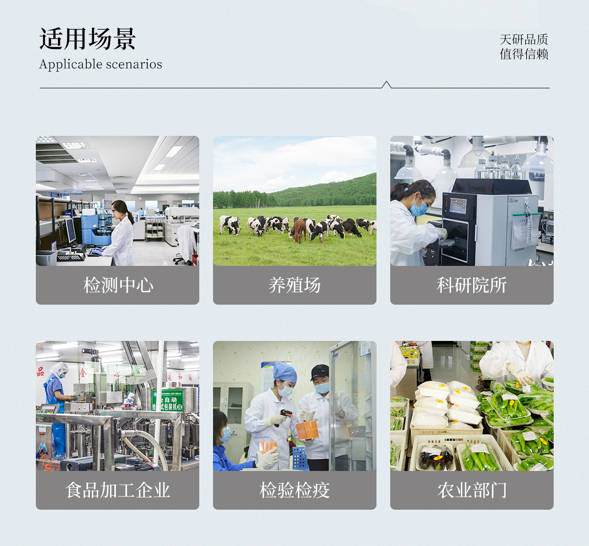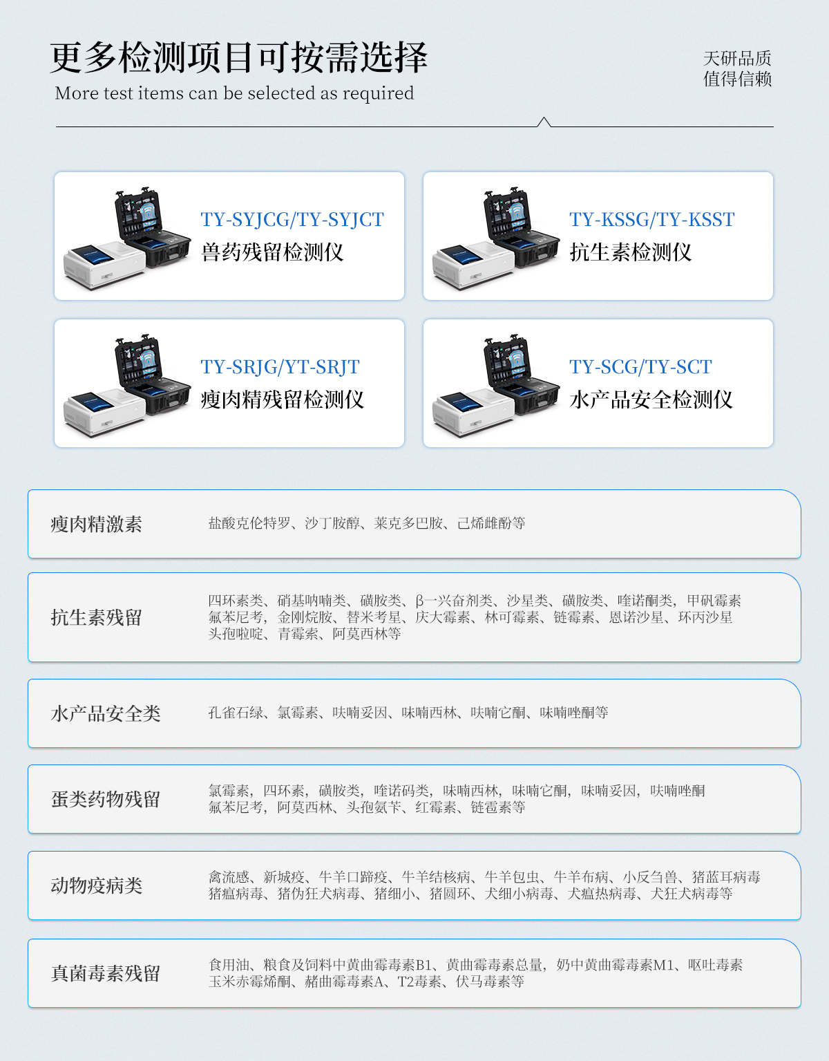 | 食品添加劑:二氧化硫、雙氧水、亞硝酸鹽、硝酸鹽、苯甲酸鈉、山梨酸鉀、糖精鈉、甜蜜素、木耳硫酸鎂等 | 有毒有害物質:甲醛、吊白塊、硼砂、過氧化苯甲酰、溴酸鉀、羅丹明B、三聚氰胺、蘇丹紅、工業堿、尿素、明礬等 | 果蔬:農藥殘留(酶抑制率法) | 病害肉診斷:組胺、揮發性鹽基氮; | 重金屬含量:鉛、鎘、鉻、汞、砷、錫、鎳、鋁等; | 食用油脂: 過氧化值、酸價等 | 瘦肉精激素類(獸藥):鹽酸克倫特羅、沙丁胺醇、萊克多巴胺、己烯雌酚等 | 抗生素殘留類(獸藥):四環素類、硝基呋喃類、磺胺類、β-興奮劑類、沙星類、磺胺類、喹諾酮類,甲砜霉素,氟苯尼考,金剛烷胺、替米考星、慶大霉素、林可霉素、鏈霉素、恩諾沙星、環丙沙星、頭孢啦啶、青霉素、阿莫西林等 | 真菌毒素類:食用油、糧食及飼料中黃曲霉毒素B1、黃曲霉毒素總量,奶中黃曲霉毒素M1、嘔吐毒素、玉米赤霉烯酮、赭曲霉毒素A、T2毒素、伏馬毒素等; | 水酒飲品分析:酒中甲醇、乙醇、乳品及牛奶中蛋白質, | 調味品成分:食醋的總酸、醬油的總酸、芝麻油純度、谷氨酸鈉、醬油氨基酸態氮、食鹽中亞鐵氰化鉀、食鹽中碘等 | 食用色素類:紅色色素(胭脂紅、莧菜紅、赤蘚紅、誘惑紅)、黃色色素(檸檬黃、日落黃)、藍色色素(亮藍)等 | 動物疫病類:禽流感、新城疫、牛羊口蹄疫、牛羊結核病、牛羊包蟲、牛羊布病、小反芻獸、豬藍耳病毒、豬瘟病毒、豬偽狂犬病毒、豬細小、豬圓環、犬細小病毒、犬瘟熱病毒、犬狂犬病毒等; | 蜂蜜成分:果糖和葡萄糖、蔗糖、淀粉酶、酸度等 | 水產品安全類:孔雀石綠、氯霉素、呋喃妥因、呋喃西林、呋喃它酮、呋喃唑酮等 | 蛋類藥物殘留:氯霉素,四環素,磺胺類,喹諾酮類,呋喃西林,呋喃它酮,呋喃妥因,呋喃唑酮,氟苯尼考,阿莫西林、頭孢氨芐、紅霉素、鏈霉素等 |