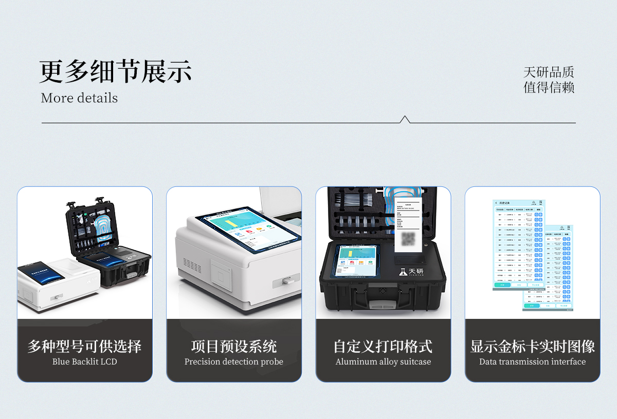 山東天研儀器有限公司生產的箱式抗生素檢測儀為集成化食品安全快速檢測分析設備,采用臺式一體化設計,可快速檢測200多種食品安全項目,包含非食用化學物質、濫用食品添加劑、農藥殘留、獸藥殘留、重金屬、病害肉、營養強化劑、抗生素類殘留、激素類殘留、真菌毒素類殘留、化學類殘留等項目的定性定量檢測。該高智能食品安全檢測儀為集成化食品安全快速檢測分析設備,目前已于食藥監局、衛生部門、高教院校、科研院所、農業部門、養殖場、屠宰場、食品肉產品深加工企業及檢驗檢疫部門等單位廣泛使用。