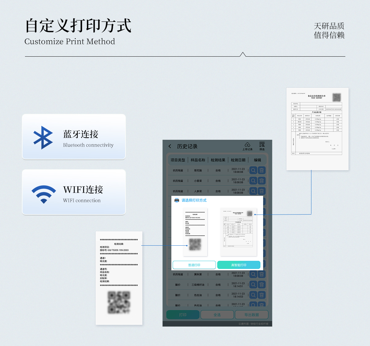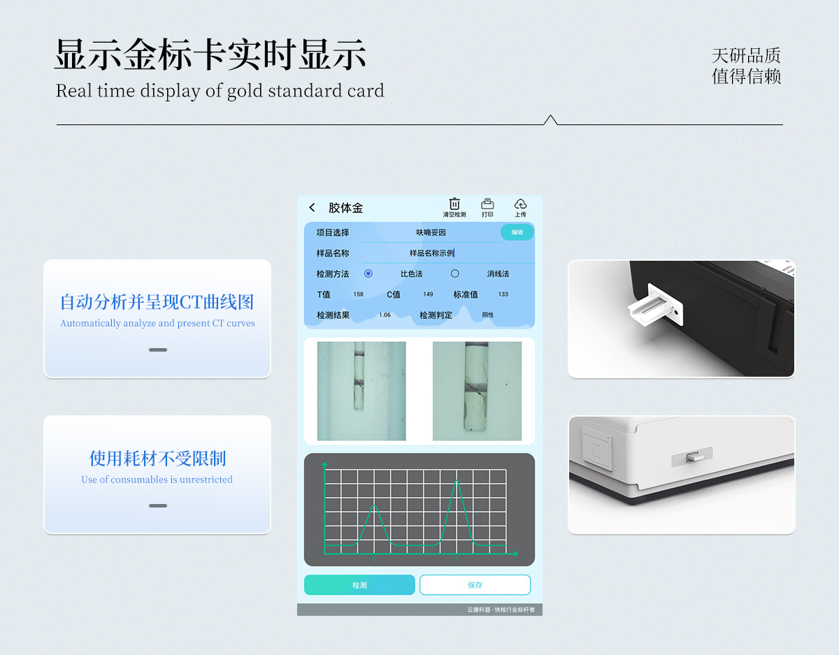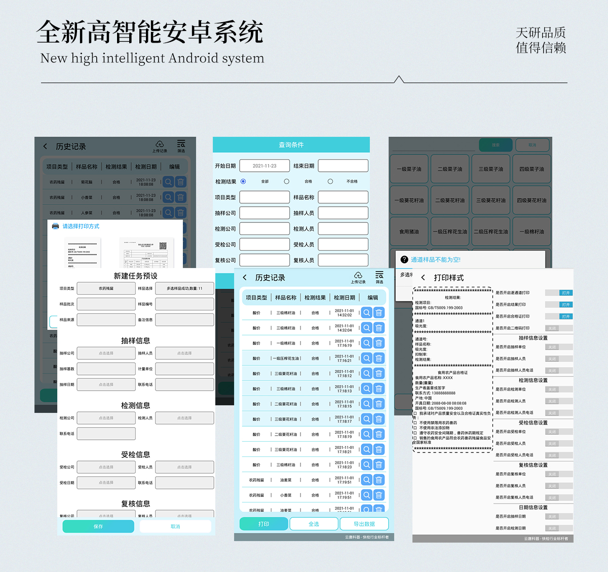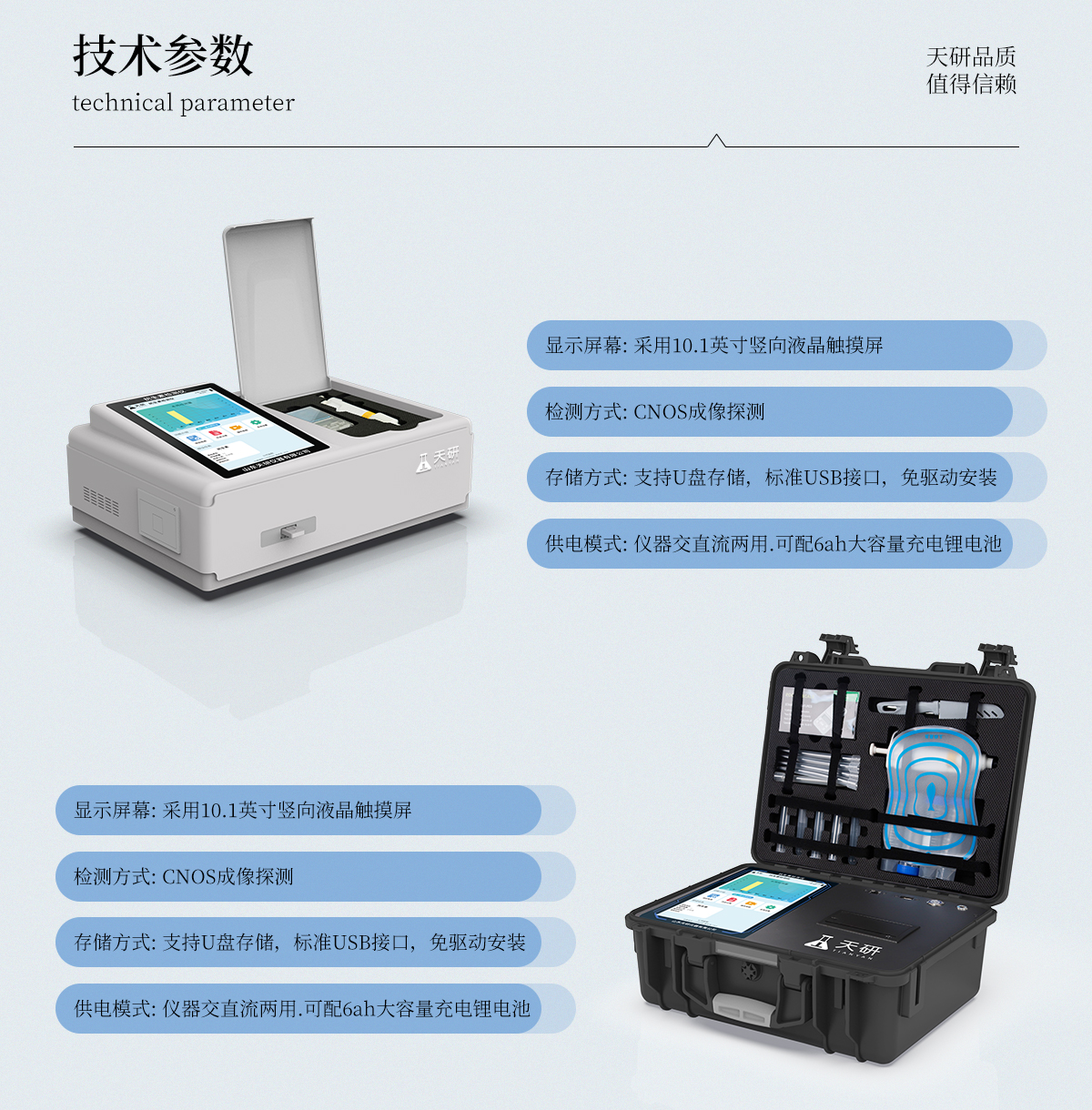 | 儀器采用手提一體化系統檢測技術,將分光光度模塊、膠體金檢測模塊、新型農殘檢測模塊、數字化管理模塊、無線通訊模塊高度集成于一體,支持檢測200種食品安全檢測項目,同時預留升級檢測方法。 | 儀器檢測模塊標準化、智能化,檢測項目可隨意自由組合。檢測箱體內置多個標準檢測單元,檢測模塊可以調整配置。 | 顯示屏幕:儀器采用10.1英寸豎向液晶觸摸屏顯,搭配運行安卓智能操作系統,主控芯片采用ARM Cortex-A7,RK3288/4核處理器,主頻1.88Ghz,操作方便,性能更強。 | 檢測通道:≥12通道;采用精密旋轉比色池設計,使用同芯片同光源校準精度,解決不同光源之間的誤差值,更加準確**。(1-12通道間誤差0.1%,**號:ZL202022821055.2) | 儀器光源:高精度進口四波長冷光源,每個通道均配置 410、520、590、630nm 波長光源,標配**的光路切換裝置,**光路切換功能可實現64波長,并且所有檢測項目可實現所有通道同時檢測。 | 設備可一鍵校準,自動保存校準數據,自動對比校驗,得到精準光源,采用Android SP存儲數據,光源數據永不丟失,方便每一次使用。 | 通訊接口:配備無線通信模塊、4G(APN)通訊模塊、藍牙傳輸,同時具有雙USB接口以及RJ45網線接口,可以多方式實現數據保存及數據傳輸。 | 存儲方式:支持U盤存儲,標準USB接口,免驅動安裝。檢測結果存儲容量20萬條以上,可生成Excel表格進行拷貝,并具有登錄保護功能。 | 智能化操作系統:: ★操作系統:儀器可在同一檢測界面自動對應相關檢測通道,一次性選擇1-12個樣品名稱,無需退出界面,節省操作時間。并可以對每個通道屬性和樣品信息單獨進行編輯,例如送檢單位、人員,檢測人員等,打印時勾選打印顯示。 | ★數據集成系統:設備首頁自動匯總分析檢測數據,包含:周檢測數據、月檢測數據,全部檢測總數量,均包含檢測總數,合格數,不合格數,以及相關柱形分析圖,各項檢測數據一目了然,無需電腦查詢,更加快捷直觀。 | ★數據庫系統:十幾項數據庫分類管理儀器:包含項目類型、項目數據、檢測數據、歷史記錄、國標信息、曲線信息、采樣信息、檢測信息、受檢信息、復核信息、圖表信息、光源校準信息、打印樣式信息、樣品庫信息等等,數據庫之間互相協調聯動保證數據的真實完整性。同時產品數據庫以及歷史檢測記錄支持一鍵檢索功能。 | ★限量規判系統:具有限量查詢、添加物質合規判定系統。檢測出結果后,系統自動調用系統數據庫中相關國標進行比對判定,客觀顯示判定結果是否合格 | ★項目預設系統:儀器具有任務預設模塊,一鍵提前預設,給出方便快捷的新檢測方案,每一個任務分別可以設置不同的樣品、批次、編號、來源、備注、抽樣信息、檢測信息、受檢信息、復核信息等更多信息。樣品送檢時一鍵調取保存信息,并可多次調取,大大提高檢測效率。 | ★數據監管系統:同步對接監管平臺,數據可局域網和互聯網數據上傳,檢測結果可選擇直接傳至食品安全監管平臺。進行區域食品安全監管及大數據分析處理與數據統計,檢測區域食品安全長短期動態,達到食品安全問題預估、預警。 | ★打印系統:內置全新打印機,新創自定義打印方式,可按需靈活勾選控制:產品合格證(國家農業部標準要求),二維碼,抽樣信息、檢測信息,受檢信息、復核信息、抽樣日期、檢測日期等信息的打印。 | 供電模式:儀器交直流兩用,直流12V供電,可連接車載電源,可配6ah大容量充電鋰電池,電量可實時顯示,方便戶外流動測試。 | 膠體金檢測模塊:采用雙通道CMOS成像處理技術及膠體金免疫層析技術,可同時讀取雙膠體金卡數據,自動采集、處理分析,將檢測結果顯示,并可根據參考限值自動判斷檢測結果,可檢測常見的獸藥殘留、生物毒素、抗生素、違禁添加物等。 | ★探測技術:CMOS成像探測; | ★檢測通道:1個通道; | ★檢測方式:消線法和比色法; | ★顯示模式:陰性或陽性; | 曲線形式:軌道式掃描方式,顯示金標卡圖像,實時生成、識別CT曲線圖,無需手動調整,完成檢測后自動退出檢測卡。兼容市場上其他金標卡,使用耗材不受限制。 | 儀器具備遠程升級功能,可定向分客戶分儀器更新,開機后自動更新,并可持續性免費更新系統版本,無需像傳統產品返廠更新,節省時間及人力成本并避免了物流運輸返廠升級導致設備損壞的潛在風險。 |