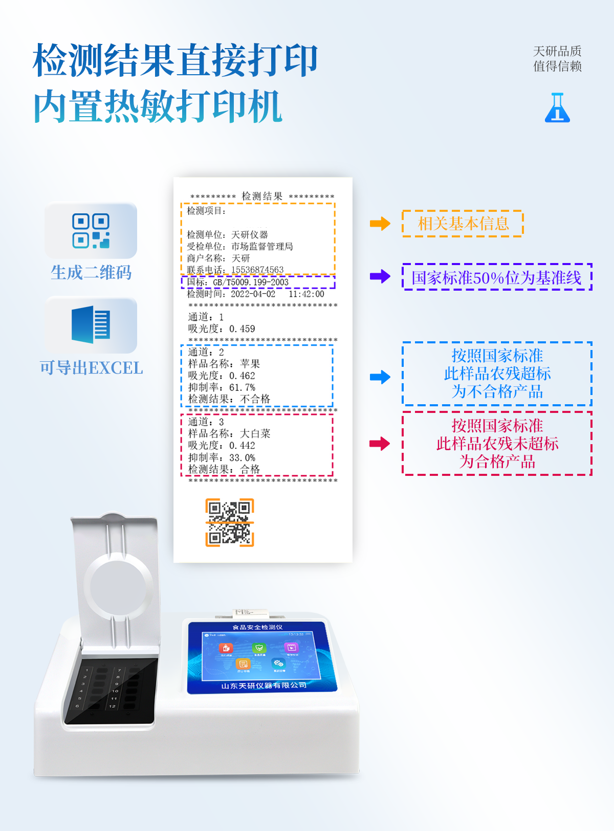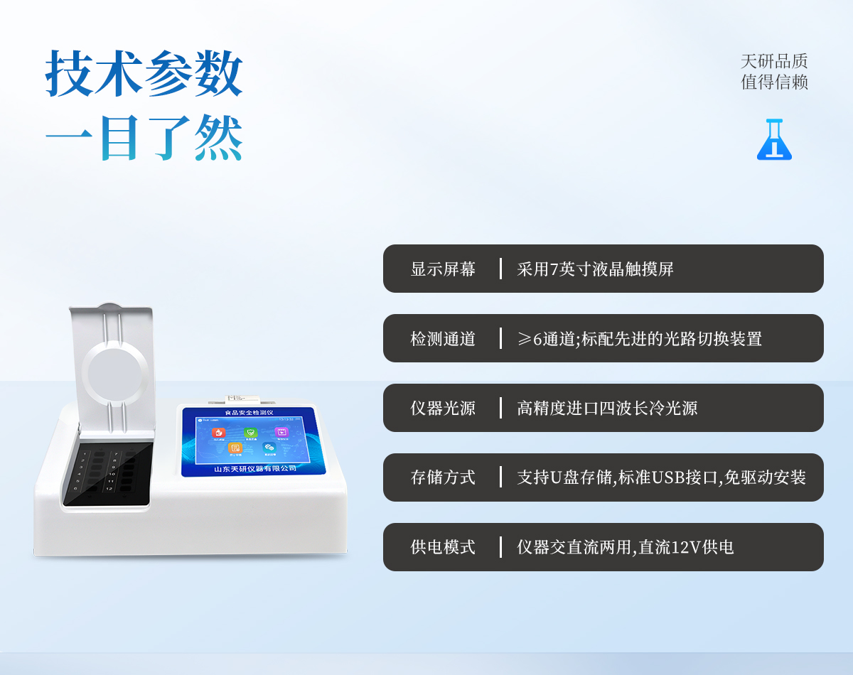 | 安卓智能操作系統(tǒng),采用更加**和人性化操作,儀器具有網線連接、wifi聯(lián)網上傳、GPRS無線遠傳功能,快速上傳數(shù)據(jù)。 | 智能化程度高,儀器具有自檢功能:具有開機自檢和調零功能,具有自動檢測重復性功能。 | 檢測通道:≥12個檢測通道,可以同時測試多個樣品,每個樣品由程序控制分別獨立工作,不會互相干擾。 | 顯示方式:≥8英寸液晶觸摸屏顯示,人性化中文操作界面,讀數(shù)直觀、簡單。 | 配備新一代嵌入式熱敏打印機,可選擇手動打印或者自動打印,檢測完成可自動打印檢測報告和二維碼。 | 光源采用進口超高亮發(fā)光二極管,高精度、穩(wěn)定性強、光源可控、可以關掉不使用的光源,功耗更低。 | 采用USB2.0接口設計,方便數(shù)據(jù)的存貯和移動,并可隨時與計算機直接相連,并且可用計算機控制儀器。實現(xiàn)數(shù)據(jù)查詢、瀏覽、分析、統(tǒng)計、打印等。 | 儀器帶有監(jiān)管平臺。數(shù)據(jù)可局域網和互聯(lián)網數(shù)據(jù)上傳,檢測結果直接傳至食品安全監(jiān)管平臺。進行區(qū)域食品安全監(jiān)管及大數(shù)據(jù)分析處理,檢測區(qū)域食品安全長短期動態(tài),達到食品安全問題預估、預警 | 一體化便攜式快檢設備,滿足現(xiàn)場及流動檢測使用需求,能夠在同一軟件下實現(xiàn)所有檢測項目的檢測,并可通過同一窗口直觀顯示檢測結果。 | 儀器具有多品類多種類樣品菜單庫,可靈活選擇檢測樣品,不同的檢測通道可同時檢測不同的樣品項目。也可在儀器上直接編輯錄入樣品名稱、檢測指標、送檢單位等信息并保存進樣品數(shù)據(jù)庫。 | 樣品處理簡單省力,整體操作快速、安全、便捷。 | 儀器具有自身保護功能,可設置用戶名及密碼,防止非工作人員操作等。 | 高靈敏度,高檢測精度,高重復性精度,掃描式高精度光學傳感器。 | 儀器具有重新校準、鎖定、恢復出廠設置功能。 | 支持U盤存儲。 結果判定線可修改,對照值標定值可保存,斷電不丟失數(shù)據(jù)。 |