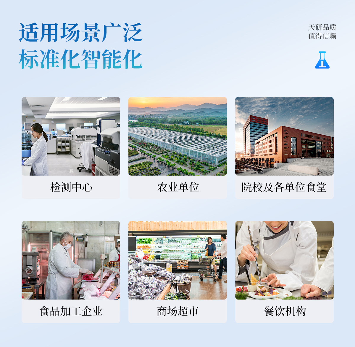 多功能食品安全檢測(cè)儀可快速檢測(cè)200多項(xiàng)目,包含非食用化學(xué)物質(zhì)、濫用食品添加劑、農(nóng)藥殘留、獸藥殘留、重金屬、病害肉、營(yíng)養(yǎng)強(qiáng)化劑、抗生素類殘留、激素類殘留、真菌毒素類殘留、化學(xué)類殘留等現(xiàn)場(chǎng)的定性定量檢測(cè)。該多功能食品安全檢測(cè)儀為集成化食品安全快速檢測(cè)分析設(shè)備,廣泛應(yīng)用于市場(chǎng)監(jiān)管局、檢測(cè)中心、衛(wèi)生監(jiān)督部門、農(nóng)業(yè)部門、院校及各單位食堂、食品肉產(chǎn)品深加工企業(yè)、商超市場(chǎng)、司法部門、餐飲機(jī)構(gòu)、養(yǎng)殖場(chǎng)、屠宰場(chǎng)、檢驗(yàn)檢疫部門等單位使用。
