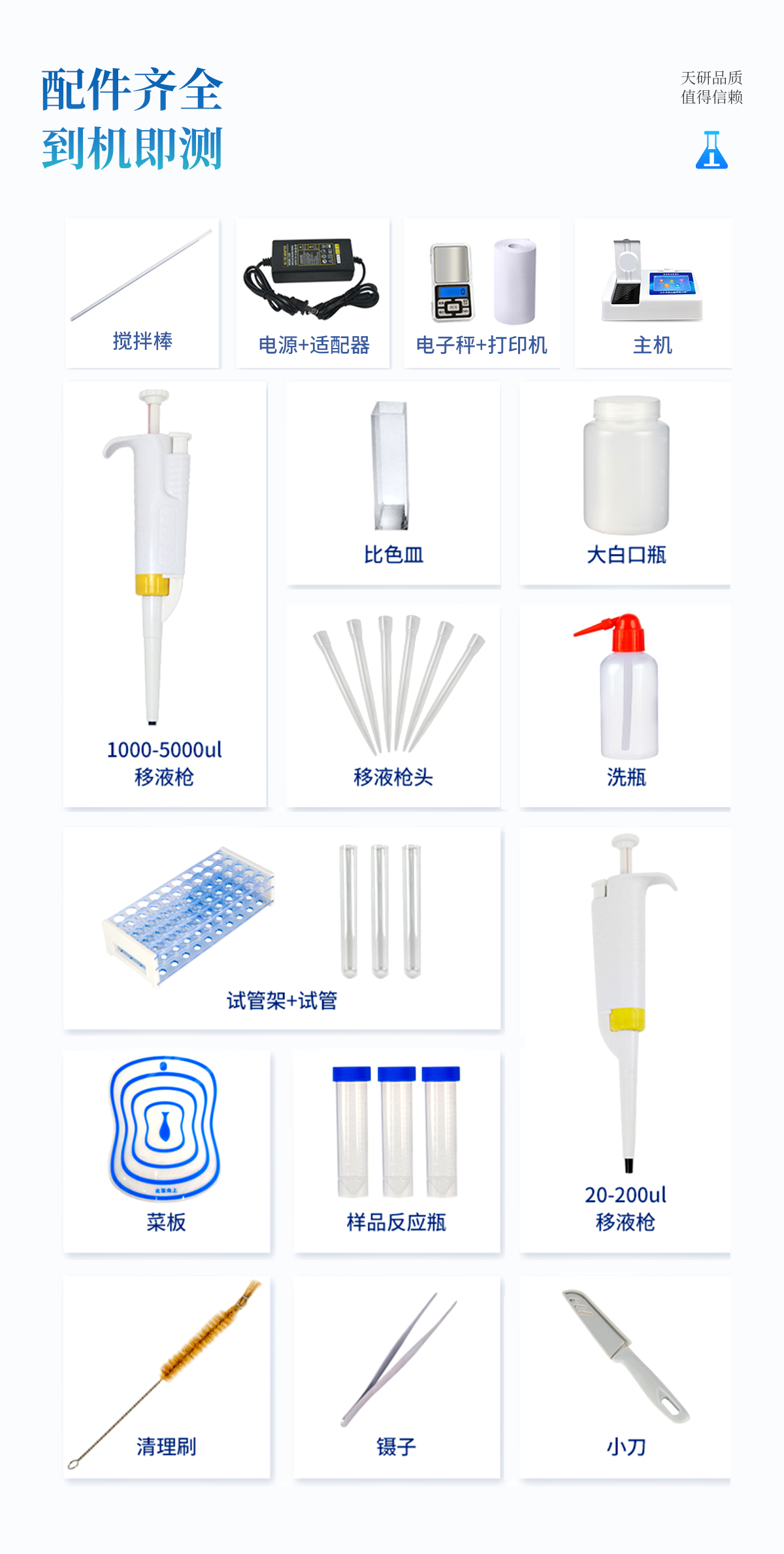 可快速檢測(cè)各類食品中的甲醛、二氧化硫、亞硝酸鹽、吊白塊的含量,儀器預(yù)留其他項(xiàng)目檢測(cè)程序和端口,根據(jù)日后需求可方便的自主增加檢測(cè)項(xiàng)目。