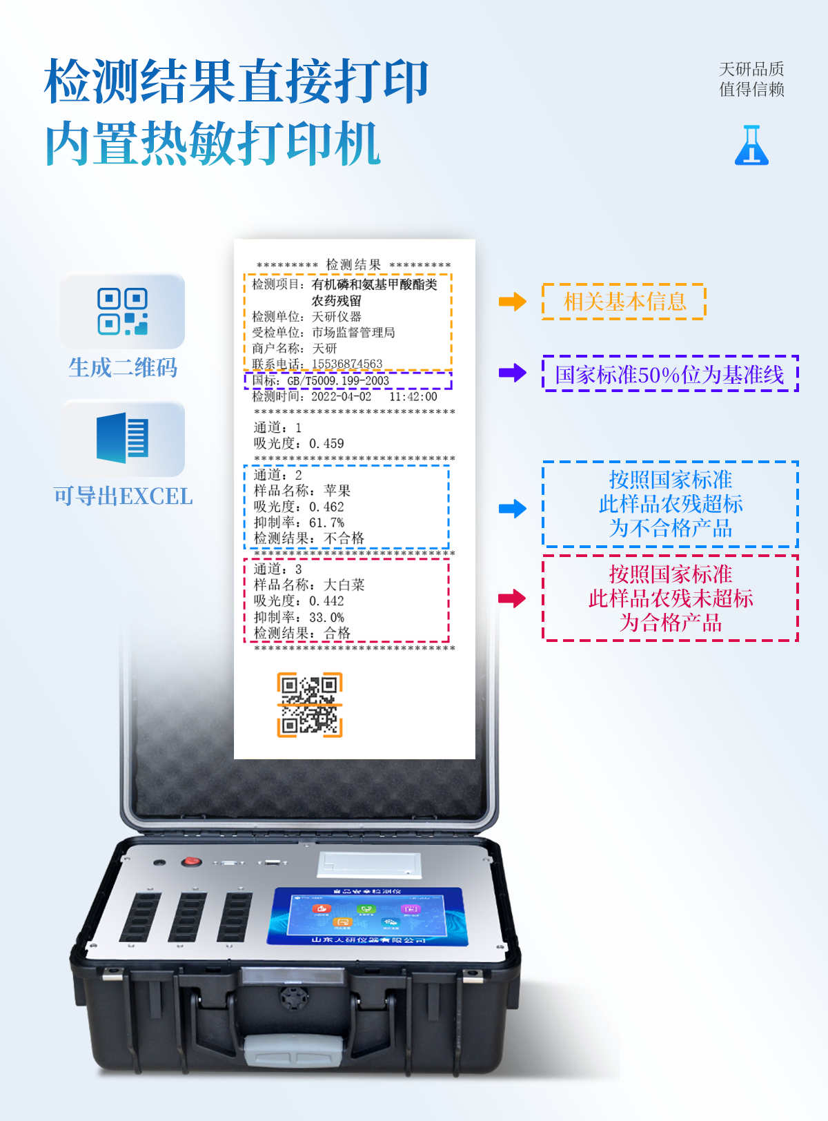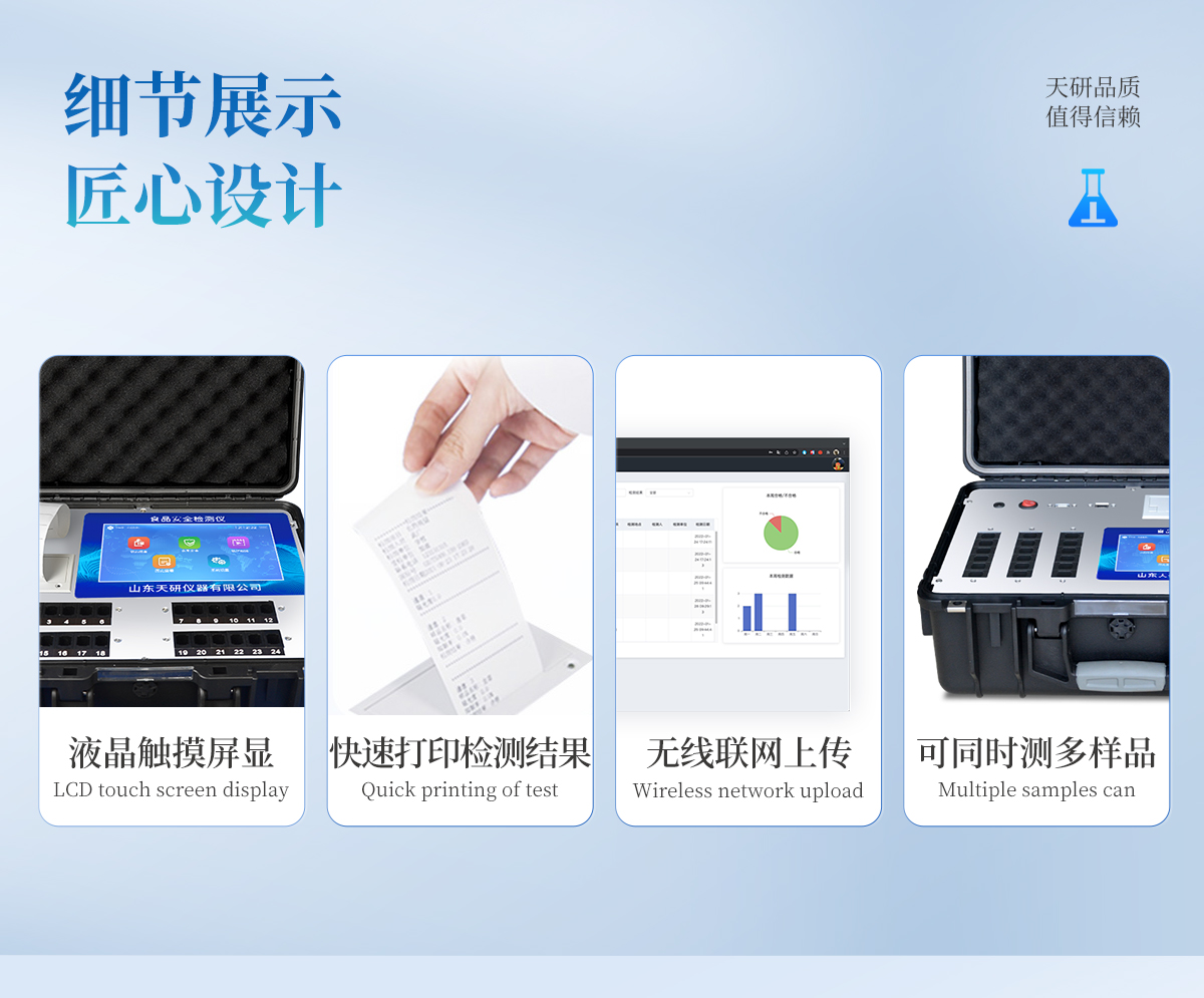 | 安卓智能操作系統(tǒng),采用更加**的UI交互界面,儀器具有wifi聯(lián)網(wǎng)上傳、4G聯(lián)網(wǎng)傳輸、GPRS無線遠(yuǎn)傳、網(wǎng)線連接功能,快速批量上傳數(shù)據(jù)。 | 智能化程度高,儀器具有自檢功能:具有開機(jī)自檢和調(diào)零功能,具有自動(dòng)檢測(cè)重復(fù)性功能。 | 新一代高速熱敏打印機(jī),檢測(cè)完成可自動(dòng)打印或批量打印檢測(cè)報(bào)告和二維碼。 | 儀器帶有監(jiān)管平臺(tái),數(shù)據(jù)可局域網(wǎng)和互聯(lián)網(wǎng)數(shù)據(jù)上傳,檢測(cè)結(jié)果直接傳至食品安全監(jiān)管平臺(tái)。進(jìn)行區(qū)域食品安全監(jiān)管及大數(shù)據(jù)分析處理與數(shù)據(jù)統(tǒng)計(jì),檢測(cè)區(qū)域食品安全長短期動(dòng)態(tài),達(dá)到食品安全問題預(yù)估、預(yù)警 | 一體化主機(jī),包含食品安全檢測(cè)模塊、多通道農(nóng)藥殘留檢測(cè)模塊、膠體金免疫層析檢測(cè)模塊。 | 一體化便攜式快檢設(shè)備,滿足現(xiàn)場(chǎng)及流動(dòng)檢測(cè)使用需求,能夠在同一軟件下實(shí)現(xiàn)所有檢測(cè)項(xiàng)目的檢測(cè),并可通過同一窗口直觀顯示檢測(cè)結(jié)果。 | 膠體金模塊檢測(cè)方式:軌道式自動(dòng)傳輸掃描,檢測(cè)完成后自動(dòng)退出檢測(cè)卡。 | CT線自動(dòng)識(shí)別,無需手動(dòng)調(diào)整。 | 內(nèi)置強(qiáng)大的數(shù)據(jù)庫,具有多品類多種類樣品菜單功能,可靈活選擇檢測(cè)樣品,不同的檢測(cè)通道可同時(shí)檢測(cè)不同的樣品項(xiàng)目。也可在儀器上直接編輯錄入樣品名稱、檢測(cè)指標(biāo)、送檢單位等信息并保存進(jìn)樣品數(shù)據(jù)庫。 | 產(chǎn)品內(nèi)置操作演示視頻,是您身邊的化驗(yàn)指導(dǎo)專家。 | 樣品處理簡(jiǎn)單省力,整體操作快速、安全、便捷。 | 儀器具有自身保護(hù)功能,可設(shè)置用戶名及密碼,防止非工作人員操作等。 | 高靈敏度,高檢測(cè)精度,高重復(fù)性精度,掃描式高精度光學(xué)傳感器。 | 結(jié)果判定線可修改,對(duì)照值標(biāo)定值可保存,斷電不丟失數(shù)據(jù)。 | 兼容市場(chǎng)上所有的膠體金卡,使用耗材不受限制,極大增強(qiáng)用戶使用體驗(yàn)。 | 儀器具有重新校準(zhǔn)、鎖定、恢復(fù)出廠設(shè)置功能。 |