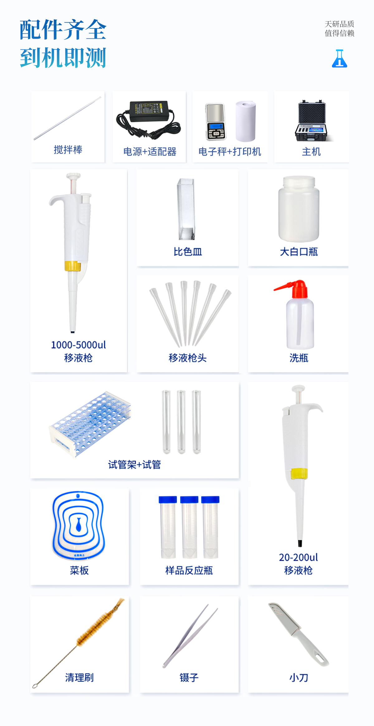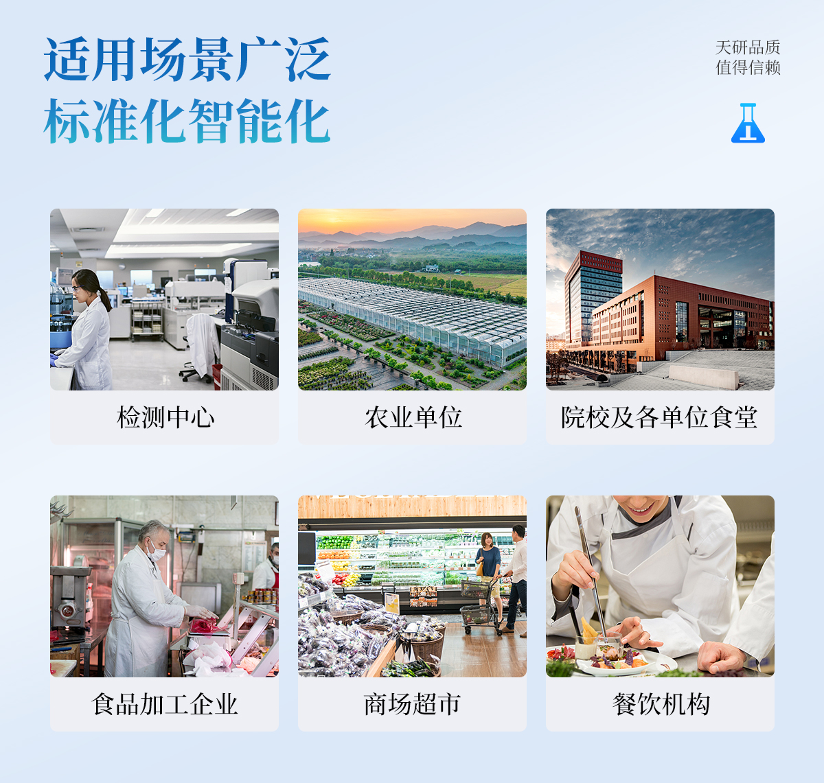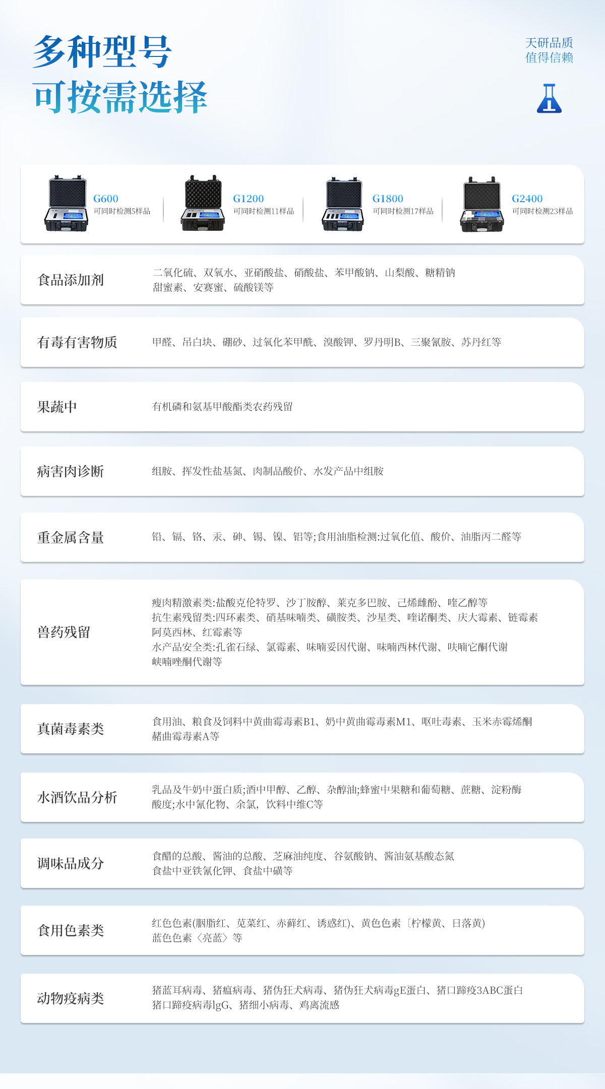 | 食品添加劑:二氧化硫、雙氧水、亞硝酸鹽、硝酸鹽、苯甲酸鈉、山梨酸、糖精鈉、甜蜜素、安賽蜜、硫酸鎂等 | 有毒有害物質:甲醛、吊白塊、硼砂、過氧化苯甲酰、溴酸鉀、羅丹明B、三聚氰胺、蘇丹紅等 | 果蔬中:有機磷和氨基甲酸酯類農藥殘留; | 病害肉診斷:組胺、揮發性鹽基氮、肉制品酸價、水發產品中組胺 | 重金屬含量:鉛、鎘、鉻、汞、砷、錫、鎳、鋁等;食用油脂檢測:過氧化值、酸價、油脂丙二醛等。 | 瘦肉精激素類(獸藥):鹽酸克倫特羅、沙丁胺醇、萊克多巴胺、己烯雌酚、喹乙醇等 | 抗生素殘留類(獸藥):四環素類、硝基呋喃類、磺胺類、沙星類、喹諾酮類、慶大霉素、鏈霉素、阿莫西林、紅霉素等 | 水產品安全類:孔雀石綠、氯霉素、呋喃妥因代謝、呋喃西林代謝、呋喃它酮代謝、呋喃唑酮代謝等 | 真菌毒素類:食用油、糧食及飼料中黃曲霉毒素B1、奶中黃曲霉毒素M1、嘔吐毒素、玉米赤霉烯酮、赭曲霉毒素A等 | 水酒飲品分析:乳品及牛奶中蛋白質;酒中甲醇、乙醇、雜醇油;蜂蜜中果糖和葡萄糖、蔗糖、淀粉酶、酸度;水中氰化物、余氯,飲料中維C等 | 調味品成分:食醋的總酸、醬油的總酸、芝麻油純度、谷氨酸鈉、醬油氨基酸態氮、食鹽中亞鐵氰化鉀、食鹽中碘等 | 食用色素類:紅色色素(胭脂紅、莧菜紅、赤蘚紅、誘惑紅)、黃色色素(檸檬黃、日落黃)、藍色色素(亮藍)等 | 動物疫病類:豬藍耳病毒、豬瘟病毒、豬偽狂犬病毒、豬偽狂犬病毒gE蛋白、豬口蹄疫3ABC蛋白、豬口蹄疫病毒IgG、豬細小病毒、雞禽流感等 |