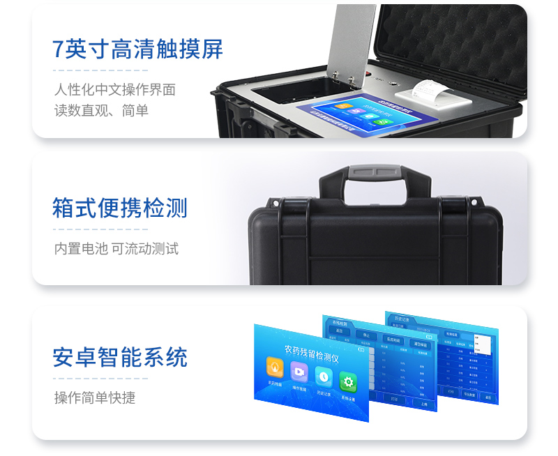| 機(jī)器采用全新安卓智能系統(tǒng),主控芯片采用 ARM Cortex-A7,RK3288/4核處理器,主頻1.88Ghz,運(yùn)轉(zhuǎn)速度更快速,穩(wěn)定性更強(qiáng)。 | 創(chuàng)新檢測(cè)模式: *儀器采用精密旋轉(zhuǎn)比色池設(shè)計(jì),使用光源一致,可以解決各通道間由于光源誤差帶來的檢測(cè)結(jié)果誤差問題,檢測(cè)結(jié)果更加精準(zhǔn)。 *儀器具有自動(dòng)識(shí)別比色皿檢測(cè)功能,即:將樣品比色皿放入儀器后,點(diǎn)擊樣品檢測(cè),儀器自動(dòng)識(shí)別比色皿進(jìn)行通道檢測(cè)。  | 供電方式:交直流兩用,直流 12V 供電,可連接車載電源,可配 6ah 大容量充電鋰電池,方便戶外流動(dòng)測(cè)試。 | 顯示方式:7英寸液晶觸摸屏顯示,人性化中文操作界面,讀數(shù)直觀、簡(jiǎn)單。 | 檢測(cè)通道:8個(gè)檢測(cè)通道,可以同時(shí)測(cè)試多個(gè)樣品,循環(huán)檢測(cè),即放即檢,每個(gè)樣品由程序控制分別獨(dú)立工作,不會(huì)互相干擾。 | 高精光源系統(tǒng): ①儀器光源采用進(jìn)口超高亮發(fā)光二極管,光源亮度可以自動(dòng)調(diào)節(jié)與校準(zhǔn) ②智能恒流穩(wěn)壓,光強(qiáng)自動(dòng)校準(zhǔn),長(zhǎng)時(shí)間連續(xù)工作光源無溫漂現(xiàn)象。  | 智能操作分析系統(tǒng): ①儀器具有100多種蔬菜名稱菜單庫,分類管理,并可按需添加或刪除、編輯蔬菜名稱;可在同一檢測(cè)界面自動(dòng)對(duì)應(yīng)相關(guān)檢測(cè)通道一次性選擇1-24個(gè)樣品名稱,無需退出界面,節(jié)省操作時(shí)間。 ②內(nèi)置新國(guó)家限量標(biāo)準(zhǔn),與所測(cè)結(jié)果進(jìn)行現(xiàn)場(chǎng)比對(duì),并持續(xù)更新標(biāo)準(zhǔn)。  | 完善的配套硬件: ①采用串口5v打印機(jī),可選擇手動(dòng)打印或者自動(dòng)打印,三分鐘出打印結(jié)果,打印格式為檢測(cè)人姓名、吸光度差值、檢測(cè)時(shí)間、檢測(cè)機(jī)構(gòu)、樣品名稱及結(jié)果判定。 ②儀器具有無線上傳模塊,檢測(cè)結(jié)果可批量打印,批量上傳。  | 數(shù)據(jù)調(diào)用: ①儀器可存儲(chǔ)20萬條檢測(cè)結(jié)果, ②檢測(cè)結(jié)果為Excel表格,方便后期進(jìn)行數(shù)據(jù)分析與匯總報(bào)告 ③儀器采用USB2.0接口設(shè)計(jì),支持 U 盤存儲(chǔ),方便數(shù)據(jù)的存貯和移動(dòng),并可隨時(shí)與計(jì)算機(jī)直接相連,實(shí)現(xiàn)數(shù)據(jù)查詢、瀏覽、分析、統(tǒng)計(jì)、打印等。  | 后期產(chǎn)品固件可升級(jí)。 | 安全證書,放心保障:儀器具有中國(guó)計(jì)量科學(xué)研究院校準(zhǔn)證書,**認(rèn)證,使用放心。 | 機(jī)箱采用工業(yè)級(jí)ABS工程塑料箱,方便攜帶,穩(wěn)固耐用,便于流動(dòng)測(cè)試。 |