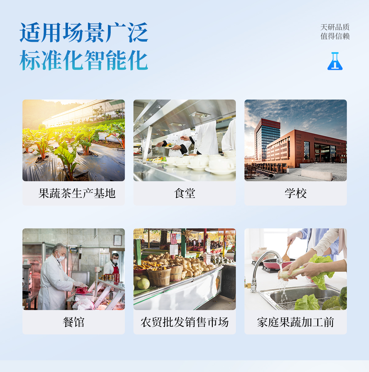 廣泛應用于主要用于蔬菜、水果、茶葉、糧食、農副產品等食品中有機磷和氨基甲酸酯類農藥殘留的快速檢測;此外還可用于果蔬茶生產基地和農貿批發銷售市場現場檢測,餐館、學校、食堂、家庭果蔬加工前的安全速測等。