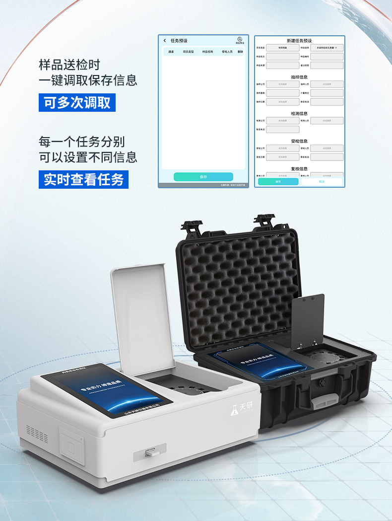 | 儀器采用手提式一體化系統(tǒng)檢測技術(shù),將分光光度模塊、膠體金檢測模塊、新型農(nóng)殘檢測模塊、數(shù)字化管理模塊、無線通訊模塊高度集成于一體,支持檢測200種食品安全檢測項目,同時預(yù)留升級檢測方法。 | 儀器檢測模塊標(biāo)準(zhǔn)化、智能化,檢測項目可隨意自由組合。檢測箱體內(nèi)置多個標(biāo)準(zhǔn)檢測單元,檢測模塊可以調(diào)整配置。 | 顯示屏幕:儀器采用10.1英寸豎向液晶觸摸屏顯,搭配運行安卓智能操作系統(tǒng),主控芯片采用ARM Cortex-A7,RK3288/4核處理器,主頻1.88Ghz,操作方便,性能更強(qiáng)。 | 檢測通道:≥12通道;采用精密旋轉(zhuǎn)比色池設(shè)計,使用同芯片同光源校準(zhǔn)精度,解決不同光源之間的誤差值,更加準(zhǔn)確**。(1-12通道間誤差0.1%,**號:ZL202022821055.2) | 儀器光源:高精度進(jìn)口四波長冷光源,每個通道均配置 410、520、590、630nm 波長光源,標(biāo)配**的光路切換裝置,**光路切換功能可實現(xiàn)64波長,并且所有檢測項目可實現(xiàn)所有通道同時檢測。 | 設(shè)備可一鍵校準(zhǔn),自動保存校準(zhǔn)數(shù)據(jù),自動對比校驗,得到精準(zhǔn)光源,采用Android SP存儲數(shù)據(jù),光源數(shù)據(jù)永不丟失,方便每一次使用。 | 通訊接口:配備無線通信模塊、4G(APN)通訊模塊、藍(lán)牙傳輸,同時具有雙USB接口以及RJ45網(wǎng)線接口,可以多方式實現(xiàn)數(shù)據(jù)保存及數(shù)據(jù)傳輸 | 存儲方式:支持U盤存儲,標(biāo)準(zhǔn)USB接口,免驅(qū)動安裝。檢測結(jié)果存儲容量20萬條以上,可生成Excel表格進(jìn)行拷貝,并具有登錄保護(hù)功能。 | 智能化操作系統(tǒng): | 1)操作系統(tǒng):儀器可在同一檢測界面自動對應(yīng)相關(guān)檢測通道,一次性選擇1-12個樣品名稱,無需退出界面,節(jié)省操作時間。并可以對每個通道屬性和樣品信息單獨進(jìn)行編輯,例如送檢單位、人員,檢測人員等,打印時勾選打印顯示。 | 2)數(shù)據(jù)集成系統(tǒng):設(shè)備首頁自動匯總分析檢測數(shù)據(jù),包含:周檢測數(shù)據(jù)、月檢測數(shù)據(jù),全部檢測總數(shù)量,均包含檢測總數(shù),合格數(shù),不合格數(shù),以及相關(guān)柱形分析圖,各項檢測數(shù)據(jù)一目了然,無需電腦查詢,更加快捷直觀。 | 3)數(shù)據(jù)庫系統(tǒng):十幾項數(shù)據(jù)庫分類管理儀器:包含項目類型、項目數(shù)據(jù)、檢測數(shù)據(jù)、歷史記錄、國標(biāo)信息、曲線信息、采樣信息、檢測信息、受檢信息、復(fù)核信息、圖表信息、光源校準(zhǔn)信息、打印樣式信息、樣品庫信息等等,數(shù)據(jù)庫之間互相協(xié)調(diào)聯(lián)動保證數(shù)據(jù)的真實完整性。同時產(chǎn)品數(shù)據(jù)庫以及歷史檢測記錄支持一鍵檢索功能。 | 4)限量規(guī)判系統(tǒng):具有限量查詢、添加物質(zhì)合規(guī)判定系統(tǒng)。檢測出結(jié)果后,系統(tǒng)自動調(diào)用系統(tǒng)數(shù)據(jù)庫中相關(guān)國標(biāo)進(jìn)行比對判定,客觀顯示判定結(jié)果是否合格。 | 5)項目預(yù)設(shè)系統(tǒng):儀器具有任務(wù)預(yù)設(shè)模塊,一鍵提前預(yù)設(shè),給出方便快捷的新檢測方案,每一個任務(wù)分別可以設(shè)置不同的樣品、批次、編號、來源、備注、抽樣信息、檢測信息、受檢信息、復(fù)核信息等更多信息。樣品送檢時一鍵調(diào)取保存信息,并可多次調(diào)取,大大提高檢測效率。 | 6)數(shù)據(jù)監(jiān)管系統(tǒng):同步對接監(jiān)管平臺,數(shù)據(jù)可局域網(wǎng)和互聯(lián)網(wǎng)數(shù)據(jù)上傳,檢測結(jié)果可選擇直接傳至食品安全監(jiān)管平臺。進(jìn)行區(qū)域食品安全監(jiān)管及大數(shù)據(jù)分析處理與數(shù)據(jù)統(tǒng)計,檢測區(qū)域食品安全長短期動態(tài),達(dá)到食品安全問題預(yù)估、預(yù)警。 | 7)打印系統(tǒng):內(nèi)置全新打印機(jī),新創(chuàng)自定義打印方式,可按需靈活勾選控制:產(chǎn)品合格證(國家農(nóng)業(yè)部標(biāo)準(zhǔn)要求),二維碼,抽樣信息、檢測信息,受檢信息、復(fù)核信息、抽樣日期、檢測日期等信息的打印。 | 供電模式:儀器交直流兩用,直流12V供電,可連接車載電源,可配6ah大容量充電鋰電池,電量可實時顯示,方便戶外流動測試。 | 膠體金檢測模塊:采用雙通道CMOS成像處理技術(shù)及膠體金免疫層析技術(shù),可同時讀取雙膠體金卡數(shù)據(jù),自動采集、處理分析,將檢測結(jié)果顯示,并可根據(jù)參考限值自動判斷檢測結(jié)果,可檢測常見的獸藥殘留、生物毒素、抗生素、違禁添加物等。 | 1)探測技術(shù):CMOS成像探測; | 2)檢測通道:1個通道; | 3)檢測方式:消線法和比色法; | 4)顯示模式:陰性或陽性; | 5)曲線形式:軌道式掃描方式,顯示金標(biāo)卡圖像,實時生成、識別CT曲線圖,無需手動調(diào)整,完成檢測后自動退出檢測卡。兼容市場上其他金標(biāo)卡,使用耗材不受限制。 | 儀器加入遠(yuǎn)程升級功能,可定向分客戶分儀器更新,開機(jī)后自動更新,客戶無需任何操作,即可升級全新項目。做到了無需退換機(jī)器即可實現(xiàn)實時遠(yuǎn)程升級檢測儀器。 |