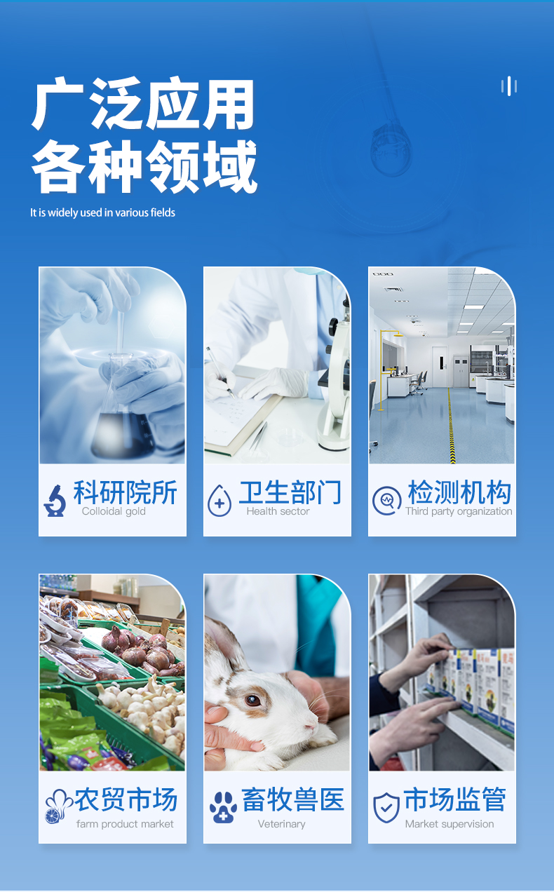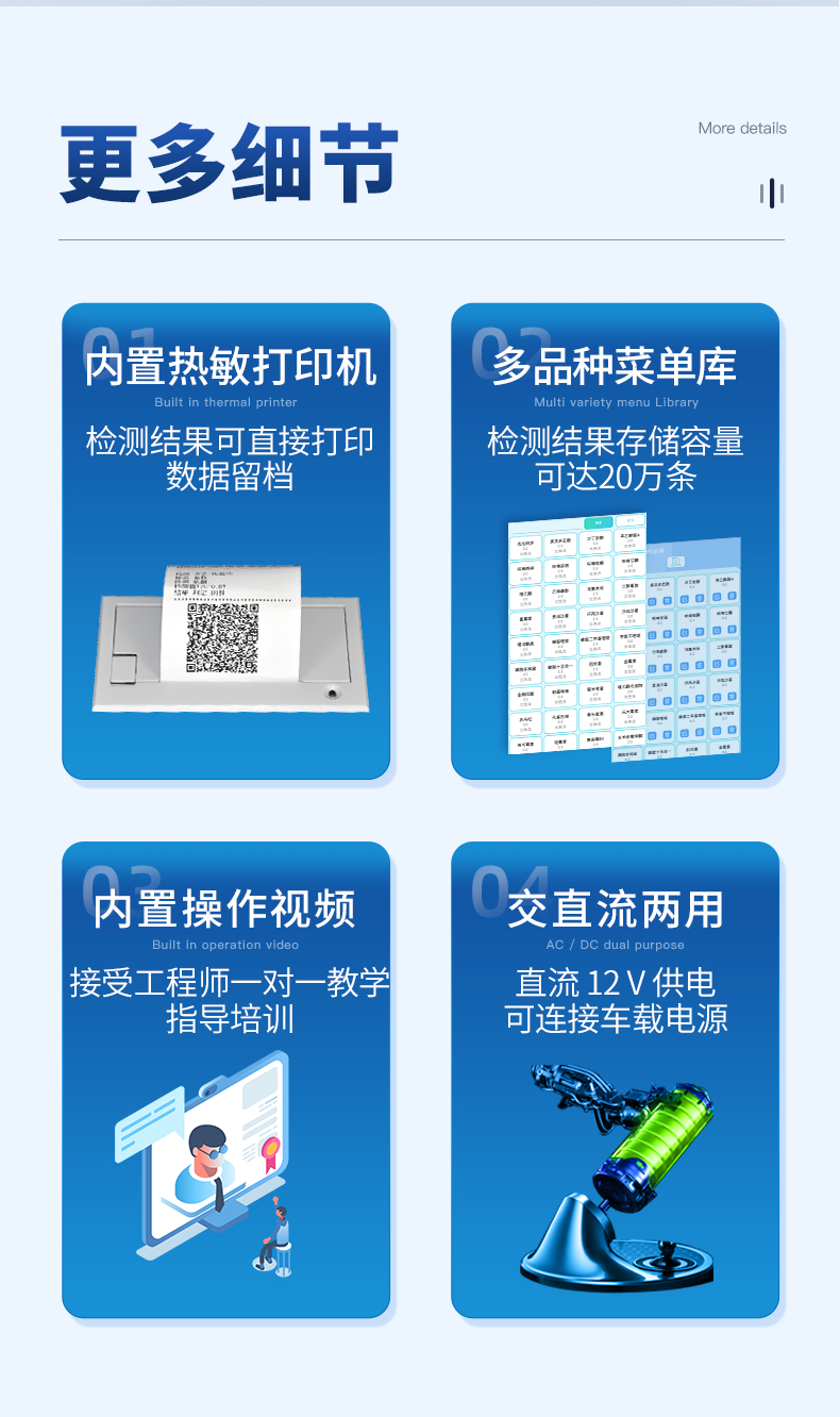 | 儀器采用10.1英寸液晶觸摸屏顯,搭配運行安卓智能操作系統,主控芯片采用ARM Cortex-A7,RK3288/4核處理器,主頻1.88Ghz,運轉速度更快速,性能更強。 | 儀器功能包括:膠體金檢測模塊、數字化管理模塊、無線通訊模塊等,可以滿足同一軟件下實現所有檢測項目的檢測,并在同一窗口展示檢測結果。 | 一體化便攜式快檢設備,采用交直流兩用供電方式,可連接車載電源,配備6ah大容量充電鋰電池,可以滿足現場及流動檢測使用的需求。儀器尺寸:43×35×20cm, 主機凈重:5.1kg | 系統自帶數據集成模塊,設備首頁自動統計檢測數據包含:周檢測數據、月檢測數據,全部檢測總數量,均包含檢測總數,合格數,不合格數,以及相關柱形分析圖,對各項檢測數據清晰掌握,無需電腦查詢,更加快捷直觀。 | 儀器具有任務預設模塊,可在樣品送檢前提前預設樣品名稱、檢測指標、送檢單位等信息,樣品送檢時一鍵調取保存信息,檢測更加方便快捷。 | 膠體金檢測模塊:軌道式自動傳輸掃描方式,可實時顯示金標卡實時圖像,系統自動分析并呈現出CT曲線圖,CT線自動識別,無需手動調整,完成檢測后自動退出檢測卡。 結果判定線可修改,對照值標定值可保存,斷電不丟失數據。 兼容市場上其他膠體金卡,使用耗材不受限制,極大增強用戶使用體驗。 | 儀器檢測系統擁有龐大數據庫,并且構建了完善的檢索、修訂功能。食品庫涵蓋多種樣品名稱,可按需添加或刪除、編輯樣品名稱;產品數據庫以及歷史檢測記錄支持一鍵檢索功能。 | 系統打印自定義化,打印格式多樣化,產品合格證(國家標準要求),二維碼,抽樣信息、檢測信息,受檢信息、復核信息、抽樣日期、檢測日期等信息結果,可按需求自行設置打印內容。 | A4紙版本報告打印功能(可選配):設備擁有兩種結果展示方式,可以自動生成A4打印模板和小票打印模板兩種樣式,可通過WiFi及網線等方式鏈接外置打印機可進行打印 | 儀器具有 wifi 聯網上傳、RJ45網線連接功能,可以快速上傳數據。同步對接監管平臺,數據可局域網和互聯網數據上傳,檢測結果直接傳至食品安全監管平臺。進行區域食品安全監管及大數據分析處理與數據統計,檢測區域食品安全長短期動態,達到食品安全問題預估、預警。 | 設備支持U盤存儲,標準USB接口,免驅動安裝。檢測結果存儲容量20萬條以上,可生成Excel表格,進行一鍵拷貝,并具有登錄保護功能,可設置用戶名及密碼,規范不同人員操作權限,防止非工作人員操作,并且可以進行重新校準、鎖定、恢復出廠設置功能。儀器固件可升級,后期檢測項目可擴充。 | 儀器具備遠程升級功能,可定向分客戶分儀器更新,開機后自動更新,并可持續性免費更新系統版本,無需像傳統產品返廠更新,節省時間及人力成本并避免了物流運輸返廠升級導致設備損壞的潛在風險。 |