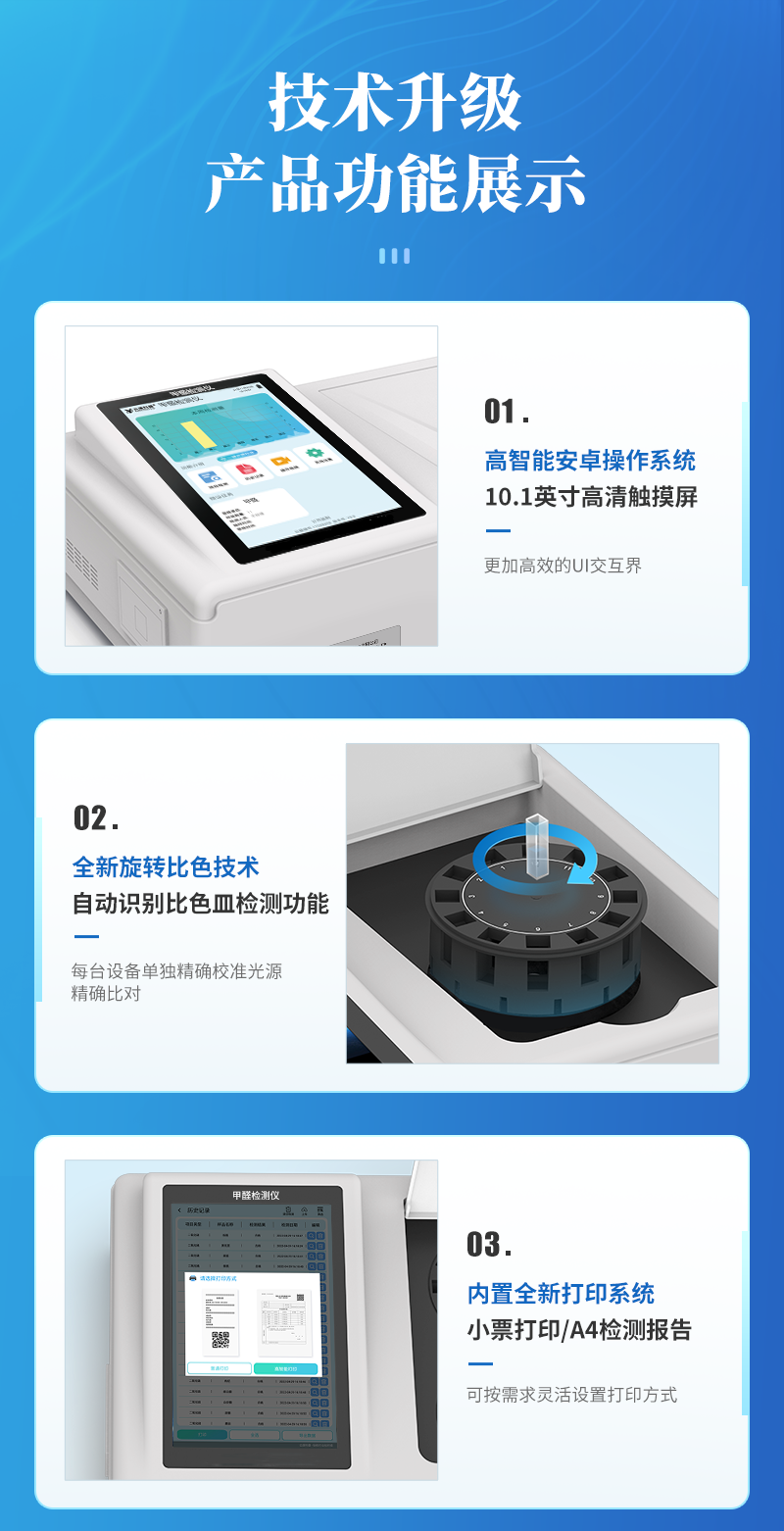 | 儀器采用臺式一體化系統(tǒng)檢測技術(shù),將分光光度模塊、新型農(nóng)殘檢測模塊、數(shù)字化管理模塊、無線通訊模塊高度集成于一體,支持檢測200種食品安全檢測項目,同時預(yù)留升級檢測方法。 | 儀器檢測模塊標準化、智能化,可隨意自由組合。檢測箱體內(nèi)置多個標準檢測單元,檢測模塊可以調(diào)整配置。 | 儀器采用全新安卓智能系統(tǒng),主控芯片采用 ARM Cortex-A7,RK3288/4核處理器,10.1寸高清液晶觸摸豎屏,更加**的UI交互界面,運轉(zhuǎn)快捷;儀器配備無線通信模塊: 4G(APN)通訊模塊、Wifi模塊,藍牙傳輸,同時具有雙USB接口以及RJ45接口能以多種方式實現(xiàn)數(shù)據(jù)保存和數(shù)據(jù)傳輸功能。 | 創(chuàng)新檢測模式: | ★檢測通道:≥12通道;采用精密旋轉(zhuǎn)比色池設(shè)計,使用同芯片同光源校準精度,解決不同光源之間的誤差值。1-12通道間誤差0.1%。(**號:ZL202022821055.2) | ★儀器具有自動識別比色皿檢測功能,即:將樣品比色皿放入儀器后,點擊樣品檢測,儀器自動識別比色皿進行通道檢測。 | 進口高精光源: | 高精度進口四波長冷光源,通道配置 410、520、590、630nm 波長光源,一個光源芯片驅(qū)動一個光源,誤差極小,每臺設(shè)備單獨**校準光源,**比對,同時參照四種不同波段光源全方位覆蓋市面上99%的農(nóng)殘食品項目檢測。 | 智能化操作系統(tǒng): | 便捷操作系統(tǒng):設(shè)備檢測時可在同一檢測界面自動對應(yīng)相關(guān)檢測通道一次性選擇1-12個樣品名稱,無須退出界面,節(jié)省操作時間。 | 數(shù)據(jù)集成系統(tǒng):設(shè)備首頁自動統(tǒng)計檢測數(shù)據(jù)包含:周檢測數(shù)據(jù)、月檢測數(shù)據(jù),全部檢測總數(shù)量,均包含檢測總數(shù),合格數(shù),不合格數(shù),以及相關(guān)柱形分析圖,對各項檢測數(shù)據(jù)清晰掌握,無需電腦查詢,更加快捷直觀。 | 項目預(yù)設(shè)系統(tǒng):支持添加單個及多個相同或不相同的任務(wù)預(yù)設(shè),一鍵快速調(diào)取,每一個任務(wù)分別可以設(shè)置不同的樣品、批次、編號、來源、備注、抽樣信息、檢測信息、受檢信息、復(fù)核信息等更多信息。無縫鏈接平臺和APP實時查看下發(fā)任務(wù)。 | 數(shù)據(jù)監(jiān)管系統(tǒng):同步對接監(jiān)管平臺,數(shù)據(jù)可局域網(wǎng)和互聯(lián)網(wǎng)數(shù)據(jù)上傳,檢測結(jié)果可選擇直接傳至食品安全監(jiān)管平臺。集成OSS輸出存儲服務(wù)、區(qū)分設(shè)備定向管理應(yīng)用,進行區(qū)域食品安全監(jiān)管及大數(shù)據(jù)分析處理與數(shù)據(jù)統(tǒng)計,檢測區(qū)域食品安全長短期動態(tài),達到食品安全問題預(yù)估、預(yù)警。 | 自定義打印系統(tǒng):內(nèi)置全新打印系統(tǒng),新創(chuàng)自定義打印方式,可按需靈活設(shè)置開啟或關(guān)閉:產(chǎn)品合格證(國家農(nóng)業(yè)部標準要求),二維碼,抽樣信息、檢測信息,受檢信息、復(fù)核信息、抽樣日期、檢測日期等信息的打印。 | 系統(tǒng)遠程更新功能:可定向分客戶分儀器更新系統(tǒng),按照不同客戶后期實際需求添加項目,無需機器返廠,即可遠程實時升級全新系統(tǒng),節(jié)省時間成本及避免運輸造成設(shè)備損壞。 | 儀器主機采用一體化防水、抗壓、防撞擊、防腐蝕箱體設(shè)計,同時配備交直流供電,可連接車載電源,可選配大容量充電鋰電池,滿足現(xiàn)場野外檢測需求。 | 安全證書,放心保障:儀器具有中國計量科學(xué)研究院校準證書,**認證。 |