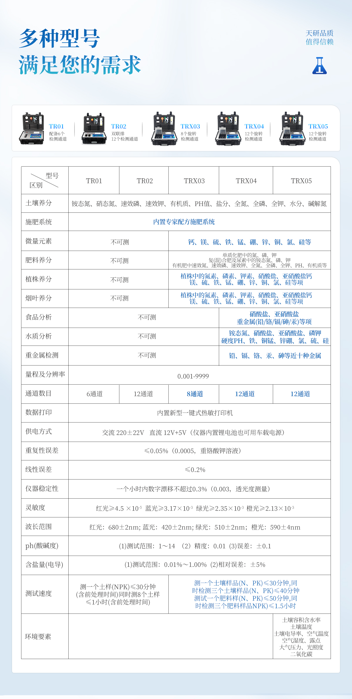 產(chǎn)品簡介:(新開發(fā),農(nóng)資經(jīng)銷商、農(nóng)技體系普及型)(新一代智能型,內(nèi)置測土配方施肥功能,圖譜診斷,二維碼打印,數(shù)據(jù)上傳,及測試用到的所有配件,保證用戶只需提供純凈水即可完成氮磷鉀有機質(zhì)pH含鹽量的準確測定!)品牌:天研? 型號:TY-TR01產(chǎn)品簡介:配套齊全:該儀器集藥、器、儀為一體,攜帶方便,相當于一個