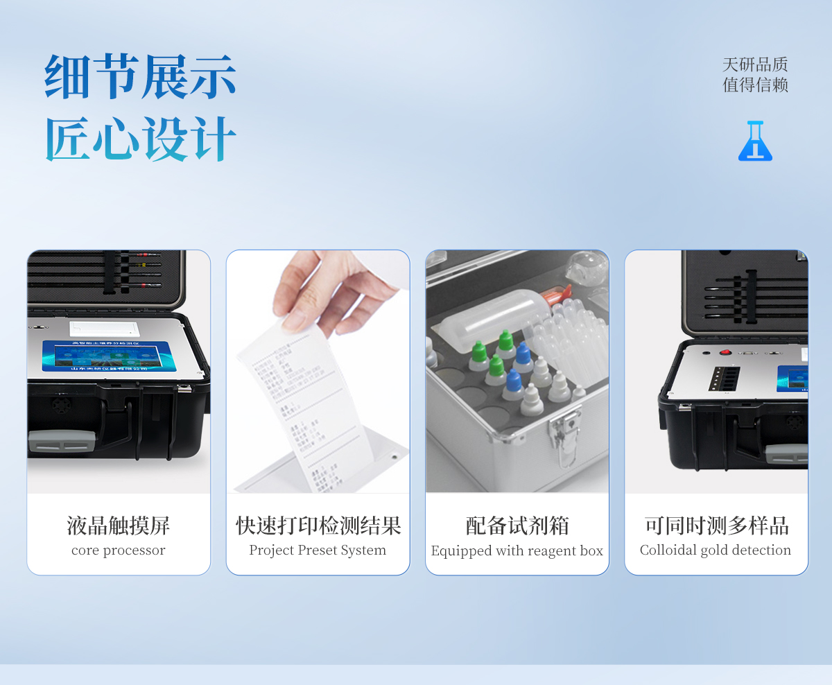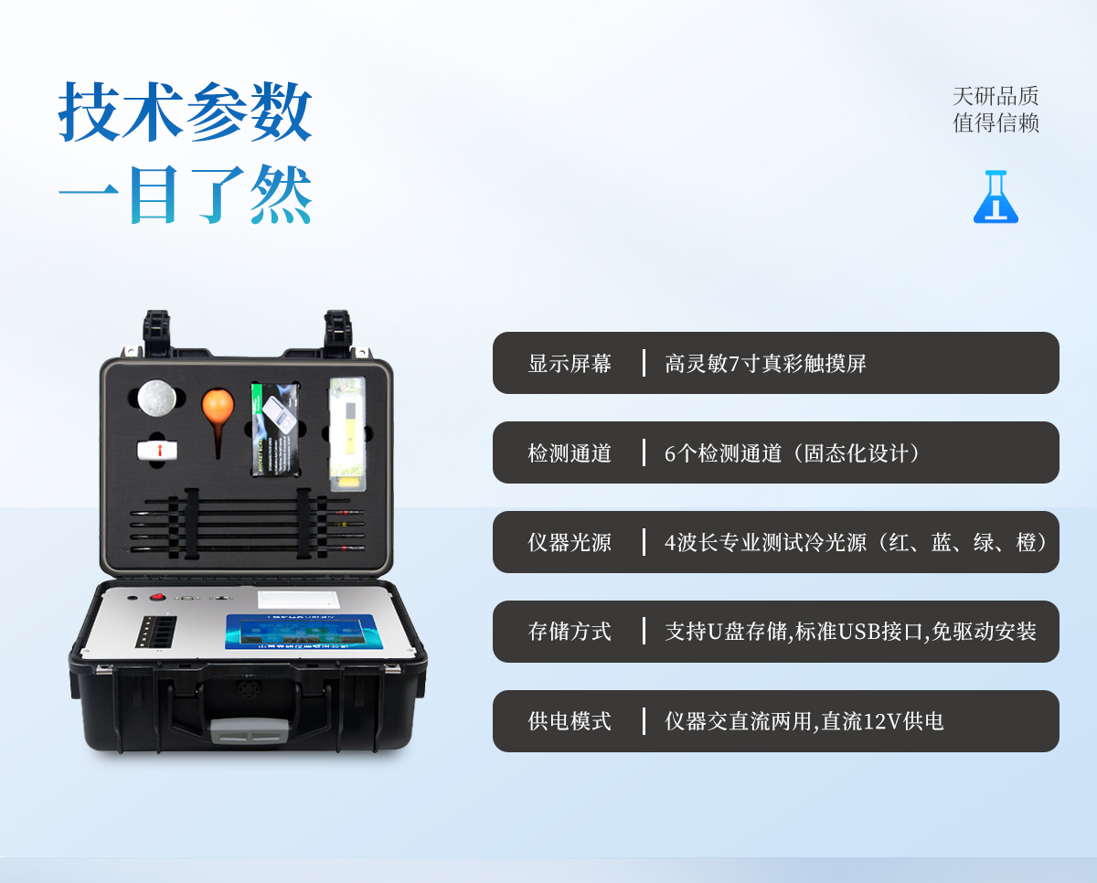 | 1、本儀器集各功能于一身,無需用戶自配附件,可靈活流動檢測。 | 2、安卓智能操作系統(tǒng),主控芯片采用ARM Cortex-A7,RK3288/4核處理器,主頻1.88Ghz,運轉(zhuǎn)速度更快速,穩(wěn)定性更強。 | 3、6個檢測通道(固態(tài)化設計),一次性可快速檢測6個樣品,極大提升檢測效率,降低檢測成本。 | 4、檢測過程中內(nèi)置校準功能,智能恒流穩(wěn)壓,光強自動校準,確保檢測準確度。 | 5、內(nèi)置作物專家施肥系統(tǒng),可對百余種全國農(nóng)業(yè)經(jīng)濟作物、果樹等的目標產(chǎn)量計算推薦施肥量,依據(jù)施肥配方科學指導農(nóng)業(yè)生產(chǎn)。測土配方施肥結果可打印,打印內(nèi)容包含:作物種類、肥料種類、目標產(chǎn)量、需求總量、建議施肥方案。 | 6、儀器標配wifi無線上傳、4G聯(lián)網(wǎng)傳輸、GPRS無線遠傳功能,快速上傳數(shù)據(jù)。 | 7、儀器內(nèi)置大容量內(nèi)存,支持查看全部歷史檢測記錄,以及傳輸所有檢測數(shù)據(jù)。 | 8、配有智慧云農(nóng)業(yè)平臺,儀器連入無線網(wǎng)絡后,可將檢測數(shù)據(jù)可選擇性或批量無線上傳,方便用戶進行長期數(shù)據(jù)管理和可視化分析 | 9、儀器同時具有USB接口、以太網(wǎng)接口,并可隨時用U盤拷貝出數(shù)據(jù)。 | 10、可用手機隨時登錄云平臺在線移動查看歷史數(shù)據(jù) | 11、內(nèi)置植物營養(yǎng)診斷標準圖譜,根據(jù)各農(nóng)作物營養(yǎng)缺失的圖片,進行葉面對比,診斷豐缺。 | 12、4波長專業(yè)測試冷光源(紅、藍、綠、橙),光源波長穩(wěn)定,長時間連續(xù)工作光源無溫漂現(xiàn)象,壽命長達10萬小時級別,重現(xiàn)性好,準確度高。 | 13、比色池部分采用標準1cm比色皿,無機械位移及磨損,光路測試定位**,有效屏蔽外光干擾,保證檢測結果優(yōu)于國標要求。 | 14、儀器系統(tǒng)內(nèi)帶有樣品前處理操作視頻,各種樣品檢測方法點擊視頻模塊即可觀看,檢測人員無需自學說明書,指導教學方便快速,方便新手快速操作。 | 15、內(nèi)置新一代高速熱敏打印機(無需色帶),打印內(nèi)容包含:檢測單位、檢測人員、檢測項目、通道號、吸光度、養(yǎng)分含量(mg/kg)、檢測時間、以及二維碼等信息 | 16、高靈敏7寸真彩觸摸屏,采用更加**和人性化操作,高清晰高交互顯示,大程度降低傳統(tǒng)儀器的繁瑣操作和失誤。 | 17、內(nèi)置時鐘功能,方便操作時間記錄,長期歷史追溯。 | 18、可設置多賬戶賬號密碼登錄,**UI交互界面,不同的用戶可自由添加編輯檢測信息,保存后可長期使用。 | 19、GPS功能:可在野外作業(yè)時記錄經(jīng)緯度地點,滿足特殊用戶需求。 | 20、內(nèi)置低電壓提示功能,可在檢測時明確電量,避免測試數(shù)據(jù)偏移,同時具有斷電保護功能,斷電自動保存數(shù)據(jù),防止數(shù)據(jù)丟失。 | 21、交直流兩用供電方式,內(nèi)置大容量充電鋰電池,滿電狀態(tài)下可連續(xù)工作10余小時,同時可外接車載電源蓄電。 | 22、儀器具有中英文切換功能,可滿足出口要求。 | 23、高強度PVC工程塑料手提箱設計,堅固耐用,便于攜帶。 |