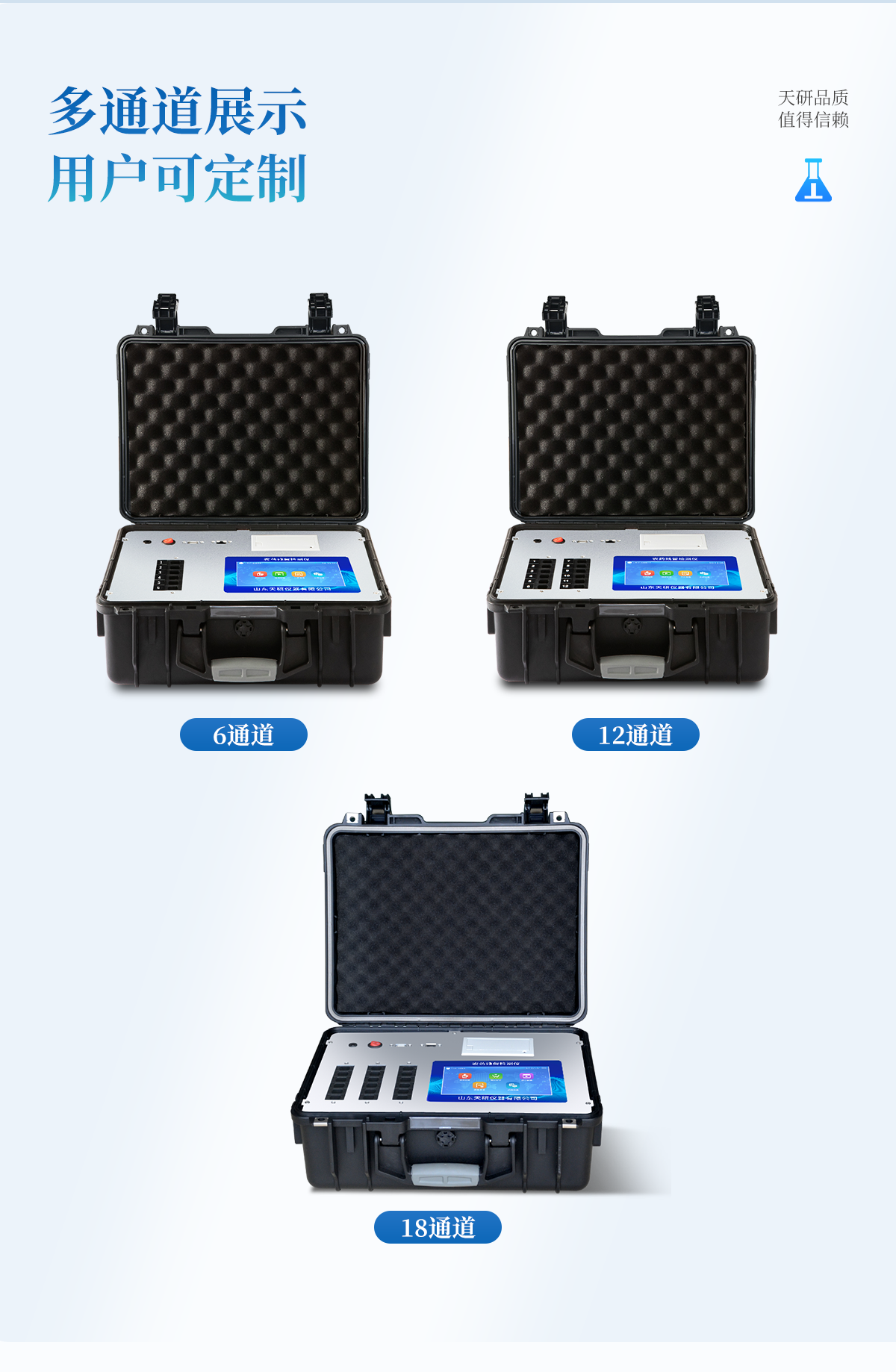 | 機箱采用工業(yè)級ABS工程塑料箱,方便攜帶,穩(wěn)固耐用,便于流動測試。 | 智能操作系統(tǒng),采用更加人性化操作,主控采用多核處理器,主頻1.88Ghz,運轉(zhuǎn)速度更快速,穩(wěn)定性更強。 | 自動判斷樣品是否合格,檢測結(jié)果更加直觀。 | 儀器具有100多種蔬菜名稱菜單庫,分類管理,并可按需添加或刪除蔬菜名,編輯蔬菜名稱,可直接打印出蔬菜名稱。 | 檢測通道:6個檢測通道,可以同時測試多個樣品,循環(huán)檢測,即放即檢,每個樣品由程序控制分別獨立工作,不會互相干擾。 | 儀器具有wifi聯(lián)網(wǎng)功能,可將數(shù)據(jù)快速上傳電腦,進行數(shù)據(jù)管理與統(tǒng)計,4G信號GPRS遠傳功能,可插手機卡實現(xiàn)數(shù)據(jù)遠傳平臺,。 | 顯示方式:7英寸高靈敏真彩觸摸屏顯示,人性化中文操作界面,讀數(shù)直觀、簡單。 | 打印機采用串口5v打印,可選擇手動打印或者自動打印,三分鐘出打印結(jié)果,打印格式為檢測人姓名、吸光度差值、檢測時間、檢測機構(gòu)、樣品名稱及結(jié)果判定。 | 光源采用進口超高亮發(fā)光二極管,具有低功耗、高精度、穩(wěn)定性強、光源可控可以關(guān)掉不使用的光源,響應(yīng)速度快等優(yōu)點。 | 智能恒流穩(wěn)壓,光強自動校準,長時間連續(xù)工作光源無溫漂現(xiàn)象。 | 采用USB2.0接口設(shè)計,方便數(shù)據(jù)的存貯和移動,并可隨時與計算機直接相連,并且可用計算機控制儀器。實現(xiàn)數(shù)據(jù)查詢、瀏覽、分析、統(tǒng)計、打印等。 | 智能化程度高,儀器具有自檢功能:具有開機自檢和調(diào)零功能,具有自動檢測重復(fù)性功能 | 儀器具有自身保護功能,可設(shè)置用戶名及密碼,防止非工作人員操作等。 | 采用DC12v直流供電,安全系統(tǒng)更高,并且配備6A鋰電池充電器。 | 儀器具有重新校準、鎖定、恢復(fù)出廠設(shè)置功能。 |