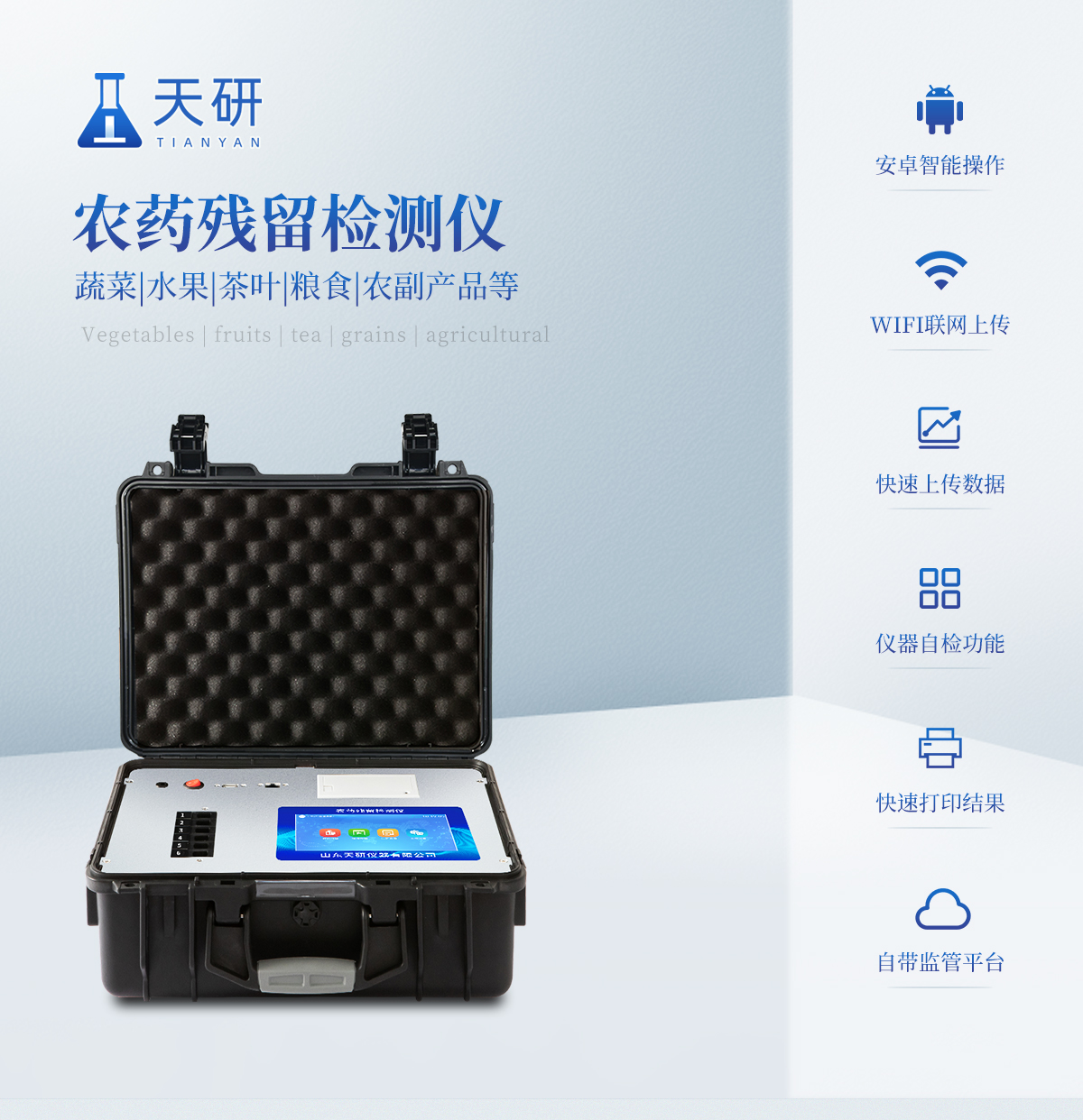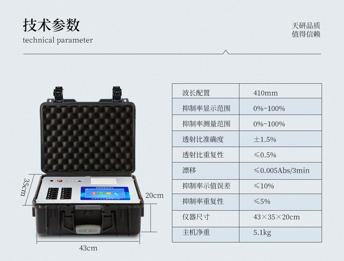 | 機箱采用工業級ABS工程塑料箱,方便攜帶,穩固耐用,便于流動測試。 | 智能操作系統,采用更加人性化操作,主控采用多核處理器,主頻1.88Ghz,運轉速度更快速,穩定性更強。 | 自動判斷樣品是否合格,檢測結果更加直觀。 | 儀器具有100多種蔬菜名稱菜單庫,分類管理,并可按需添加或刪除蔬菜名,編輯蔬菜名稱,可直接打印出蔬菜名稱。 | 檢測通道:12個檢測通道,可以同時測試多個樣品,循環檢測,即放即檢,每個樣品由程序控制分別獨立工作,不會互相干擾。 | 儀器具有wifi聯網功能,可將數據快速上傳電腦,進行數據管理與統計,4G信號GPRS遠傳功能,可插手機卡實現數據遠傳平臺,。 | 顯示方式:7英寸高靈敏真彩觸摸屏顯示,人性化中文操作界面,讀數直觀、簡單。 | 打印機采用串口5v打印,可選擇手動打印或者自動打印,三分鐘出打印結果,打印格式為檢測人姓名、吸光度差值、檢測時間、檢測機構、樣品名稱及結果判定。 | 光源采用進口超高亮發光二極管,具有低功耗、高精度、穩定性強、光源可控可以關掉不使用的光源,響應速度快等優點。 | 智能恒流穩壓,光強自動校準,長時間連續工作光源無溫漂現象。 | 采用USB2.0接口設計,方便數據的存貯和移動,并可隨時與計算機直接相連,并且可用計算機控制儀器。實現數據查詢、瀏覽、分析、統計、打印等。 | 智能化程度高,儀器具有自檢功能:具有開機自檢和調零功能,具有自動檢測重復性功能 | 儀器具有自身保護功能,可設置用戶名及密碼,防止非工作人員操作等。 | 采用DC12v直流供電,安全系統更高,并且配備6A鋰電池充電器。 | 儀器具有重新校準、鎖定、恢復出廠設置功能。 |