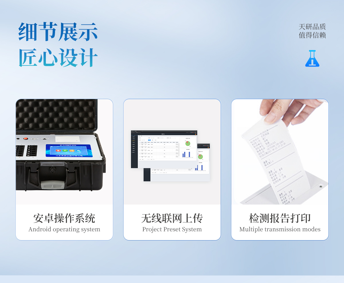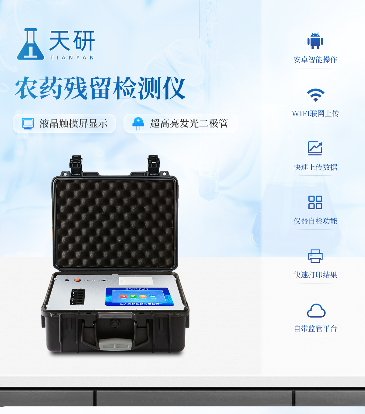 | 機箱采用工業級ABS工程塑料箱,方便攜帶,穩固耐用,便于流動測試。 | 智能操作系統,采用更加人性化操作,主控采用多核處理器,主頻1.88Ghz,運轉速度更快速,穩定性更強。 | 自動判斷樣品是否合格,檢測結果更加直觀。 | 儀器具有100多種蔬菜名稱菜單庫,分類管理,并可按需添加或刪除蔬菜名,編輯蔬菜名稱,可直接打印出蔬菜名稱。 | 檢測通道:18個檢測通道,可以同時測試多個樣品,循環檢測,即放即檢,每個樣品由程序控制分別獨立工作,不會互相干擾。 | 儀器具有wifi聯網功能,可將數據快速上傳電腦,進行數據管理與統計,4G信號GPRS遠傳功能,可插手機卡實現數據遠傳平臺,。 | 顯示方式:7英寸高靈敏真彩觸摸屏顯示,人性化中文操作界面,讀數直觀、簡單。 | 打印機采用串口5v打印,可選擇手動打印或者自動打印,三分鐘出打印結果,打印格式為檢測人姓名、吸光度差值、檢測時間、檢測機構、樣品名稱及結果判定。 | 光源采用進口超高亮發光二極管,具有低功耗、高精度、穩定性強、光源可控可以關掉不使用的光源,響應速度快等優點。 | 智能恒流穩壓,光強自動校準,長時間連續工作光源無溫漂現象。 | 采用USB2.0接口設計,方便數據的存貯和移動,并可隨時與計算機直接相連,并且可用計算機控制儀器。實現數據查詢、瀏覽、分析、統計、打印等。 | 智能化程度高,儀器具有自檢功能:具有開機自檢和調零功能,具有自動檢測重復性功能 | 儀器具有自身保護功能,可設置用戶名及密碼,防止非工作人員操作等。 | 采用DC12v直流供電,安全系統更高,并且配備6A鋰電池充電器。 | 儀器具有重新校準、鎖定、恢復出廠設置功能。 |