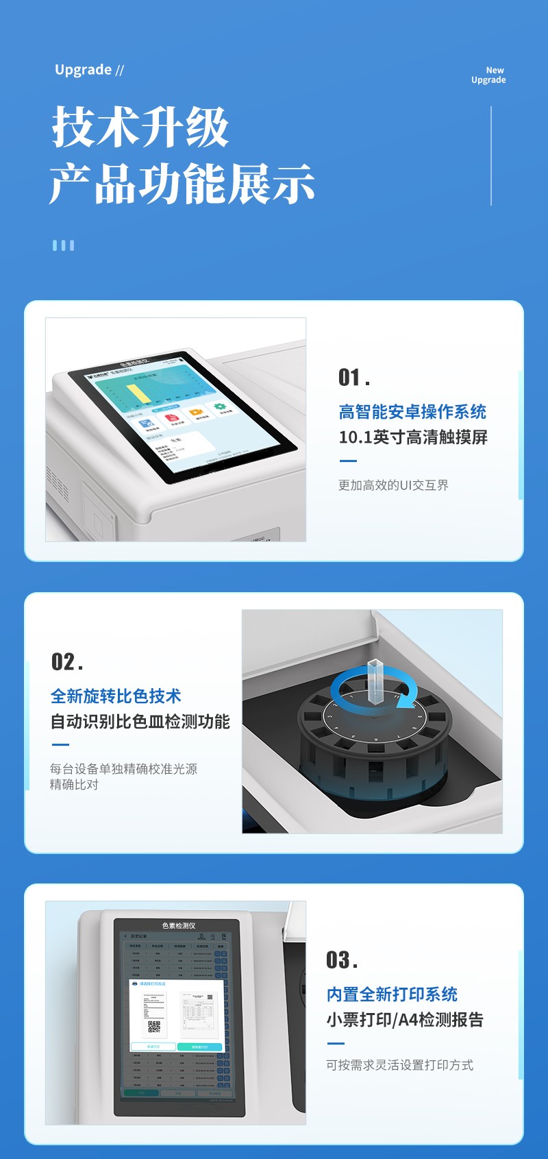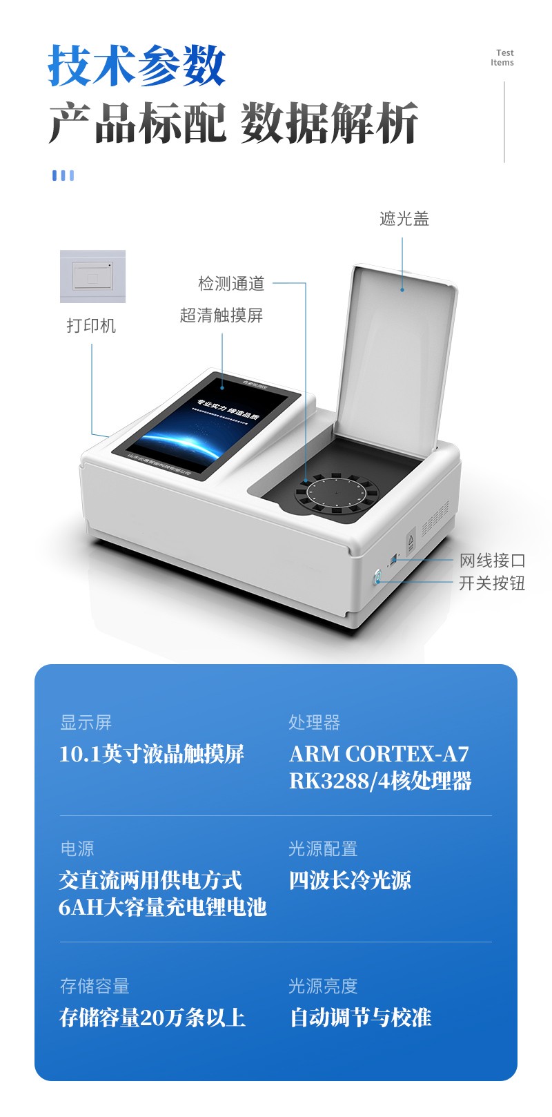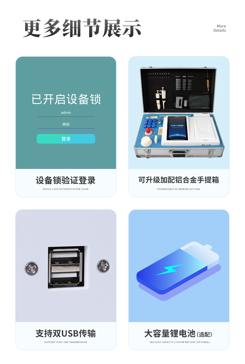 | 儀器采用臺式一體化系統(tǒng)檢測技術(shù),將分光光度模塊、新型農(nóng)殘檢測模塊、數(shù)字化管理模塊、無線通訊模塊高度集成于一體,支持檢測200種食品安全檢測項(xiàng)目,同時預(yù)留升級檢測方法。 | 儀器檢測模塊標(biāo)準(zhǔn)化、智能化,可隨意自由組合。檢測箱體內(nèi)置多個標(biāo)準(zhǔn)檢測單元,檢測模塊可以調(diào)整配置。 | 儀器采用全新安卓智能系統(tǒng),主控芯片采用 ARM Cortex-A7,RK3288/4核處理器,10.1寸高清液晶觸摸豎屏,更加**的UI交互界面,運(yùn)轉(zhuǎn)快捷;儀器配備無線通信模塊: 4G(APN)通訊模塊、Wifi模塊,藍(lán)牙傳輸,同時具有雙USB接口以及RJ45接口能以多種方式實(shí)現(xiàn)數(shù)據(jù)保存和數(shù)據(jù)傳輸功能。 | 創(chuàng)新檢測模式: | ★檢測通道:≥12通道;采用精密旋轉(zhuǎn)比色池設(shè)計,使用同芯片同光源校準(zhǔn)精度,解決不同光源之間的誤差值。1-12通道間誤差0.1%。(**號:ZL202022821055.2) | ★儀器具有自動識別比色皿檢測功能,即:將樣品比色皿放入儀器后,點(diǎn)擊樣品檢測,儀器自動識別比色皿進(jìn)行通道檢測。 | 進(jìn)口高精光源: | 高精度進(jìn)口四波長冷光源,通道配置 410、520、590、630nm 波長光源,一個光源芯片驅(qū)動一個光源,誤差極小,每臺設(shè)備單獨(dú)**校準(zhǔn)光源,**比對,同時參照四種不同波段光源全方位覆蓋市面上99%的農(nóng)殘食品項(xiàng)目檢測。 | 智能化操作系統(tǒng): | 便捷操作系統(tǒng):設(shè)備檢測時可在同一檢測界面自動對應(yīng)相關(guān)檢測通道一次性選擇1-12個樣品名稱,無須退出界面,節(jié)省操作時間。 | 數(shù)據(jù)集成系統(tǒng):設(shè)備首頁自動統(tǒng)計檢測數(shù)據(jù)包含:周檢測數(shù)據(jù)、月檢測數(shù)據(jù),全部檢測總數(shù)量,均包含檢測總數(shù),合格數(shù),不合格數(shù),以及相關(guān)柱形分析圖,對各項(xiàng)檢測數(shù)據(jù)清晰掌握,無需電腦查詢,更加快捷直觀。 | 項(xiàng)目預(yù)設(shè)系統(tǒng):支持添加單個及多個相同或不相同的任務(wù)預(yù)設(shè),一鍵快速調(diào)取,每一個任務(wù)分別可以設(shè)置不同的樣品、批次、編號、來源、備注、抽樣信息、檢測信息、受檢信息、復(fù)核信息等更多信息。無縫鏈接平臺和APP實(shí)時查看下發(fā)任務(wù)。 | 數(shù)據(jù)監(jiān)管系統(tǒng):同步對接監(jiān)管平臺,數(shù)據(jù)可局域網(wǎng)和互聯(lián)網(wǎng)數(shù)據(jù)上傳,檢測結(jié)果可選擇直接傳至食品安全監(jiān)管平臺。集成OSS輸出存儲服務(wù)、區(qū)分設(shè)備定向管理應(yīng)用,進(jìn)行區(qū)域食品安全監(jiān)管及大數(shù)據(jù)分析處理與數(shù)據(jù)統(tǒng)計,檢測區(qū)域食品安全長短期動態(tài),達(dá)到食品安全問題預(yù)估、預(yù)警。 | 自定義打印系統(tǒng):內(nèi)置全新打印系統(tǒng),新創(chuàng)自定義打印方式,可按需靈活設(shè)置開啟或關(guān)閉:產(chǎn)品合格證(國家農(nóng)業(yè)部標(biāo)準(zhǔn)要求),二維碼,抽樣信息、檢測信息,受檢信息、復(fù)核信息、抽樣日期、檢測日期等信息的打印。 | 系統(tǒng)遠(yuǎn)程更新功能:可定向分客戶分儀器更新系統(tǒng),按照不同客戶后期實(shí)際需求添加項(xiàng)目,無需機(jī)器返廠,即可遠(yuǎn)程實(shí)時升級全新系統(tǒng),節(jié)省時間成本及避免運(yùn)輸造成設(shè)備損壞。 | 儀器主機(jī)采用一體化防水、抗壓、防撞擊、防腐蝕箱體設(shè)計,同時配備交直流供電,可連接車載電源,可選配大容量充電鋰電池,滿足現(xiàn)場野外檢測需求。 | 安全證書,放心保障:儀器具有中國計量科學(xué)研究院校準(zhǔn)證書,**認(rèn)證。 |