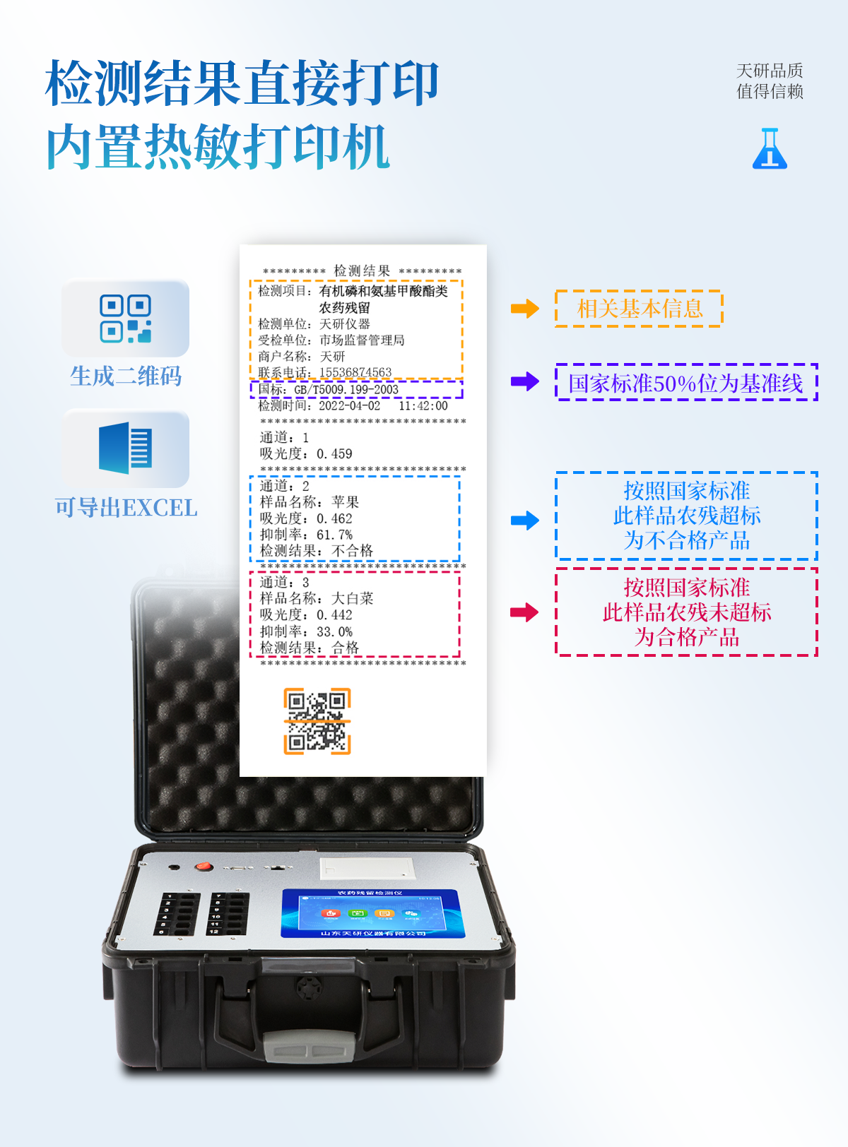 | 隨著人民生活水平的不斷提升,市場對茶葉的把控愈加嚴格。針對現狀,我司專門研發生產--茶葉專用的農藥殘留速測儀;定位茶農、茶商、茶葉企業使用。 此外還可用于果蔬茶生產基地和農貿批發銷售市場現場檢測,餐館、學校、食堂、家庭果蔬加工前的安全速測等。 | 檢測通道: 5個檢測通道,可以同時測試多個樣品,每個樣品由程序控制分別獨立工作,不會互相干擾。 | 顯示方式:≥5英寸液晶觸摸屏顯示,人性化中文操作界面,讀數直觀、簡單。 | 配備嵌入式高速熱敏打印機,可選擇手動打印或者自動打印,三分鐘出打印結果。 | 光源采用進口超高亮發光二極管,具有低功耗、穩定性強、高靈敏度,高檢測精度,高重復性精度,光源可控、響應速度快等優點。 | 采用標準USB接口設計,免驅動安裝,方便數據的存貯和移動,并可隨時與計算機直接相連,并且可用計算機控制儀器。實現數據查詢、瀏覽、分析、統計、打印等。 | 智能化程度高,儀器具有自檢功能:具有開機自檢和調零功能,具有自動檢測重復性功能 | 內置強大的數據庫,可在儀器上直接選擇樣品名稱、檢測指標、送檢單位等信息,也可在儀器上直接編輯錄入樣品名稱、檢測指標、送檢單位等信息并保存進樣品數據庫。 | 支持Wifi網絡,數據可局域網和互聯網數據上傳,檢測結果直接傳至食品安全監管平臺。進行區域食品安全監管及大數據分析處理,檢測區域食品安全長短期動態,達到食品安全問題預估、預警 |