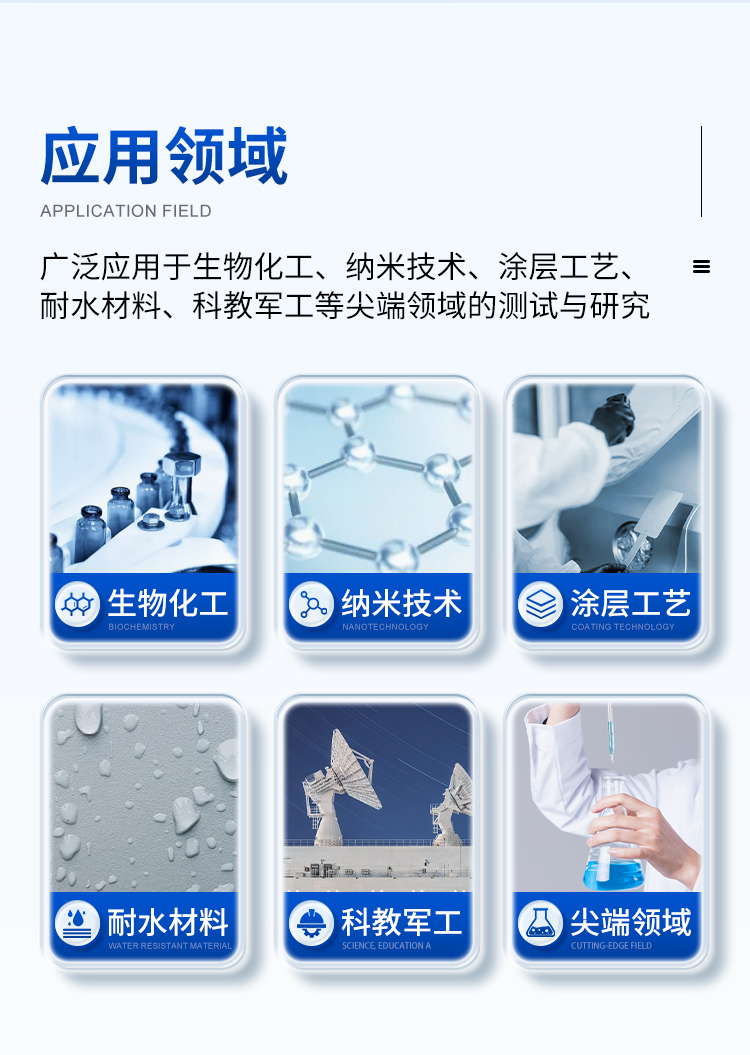 本機(jī)用于測(cè)試和分析液體在固體表面的接觸角、液體的表面張力、固體的表面能等。實(shí)現(xiàn)對(duì)固體表面的親/疏水性分析、潤(rùn)濕性分析、潔凈度檢測(cè)、處理工藝效果評(píng)估,以及液體被競(jìng)爭(zhēng)、吸附、吸收和鋪展等過(guò)程分析。廣泛應(yīng)用于化工、醫(yī)藥、食品、電子、印染、噴涂、軍工和科教等眾多領(lǐng)域的測(cè)試與研究。