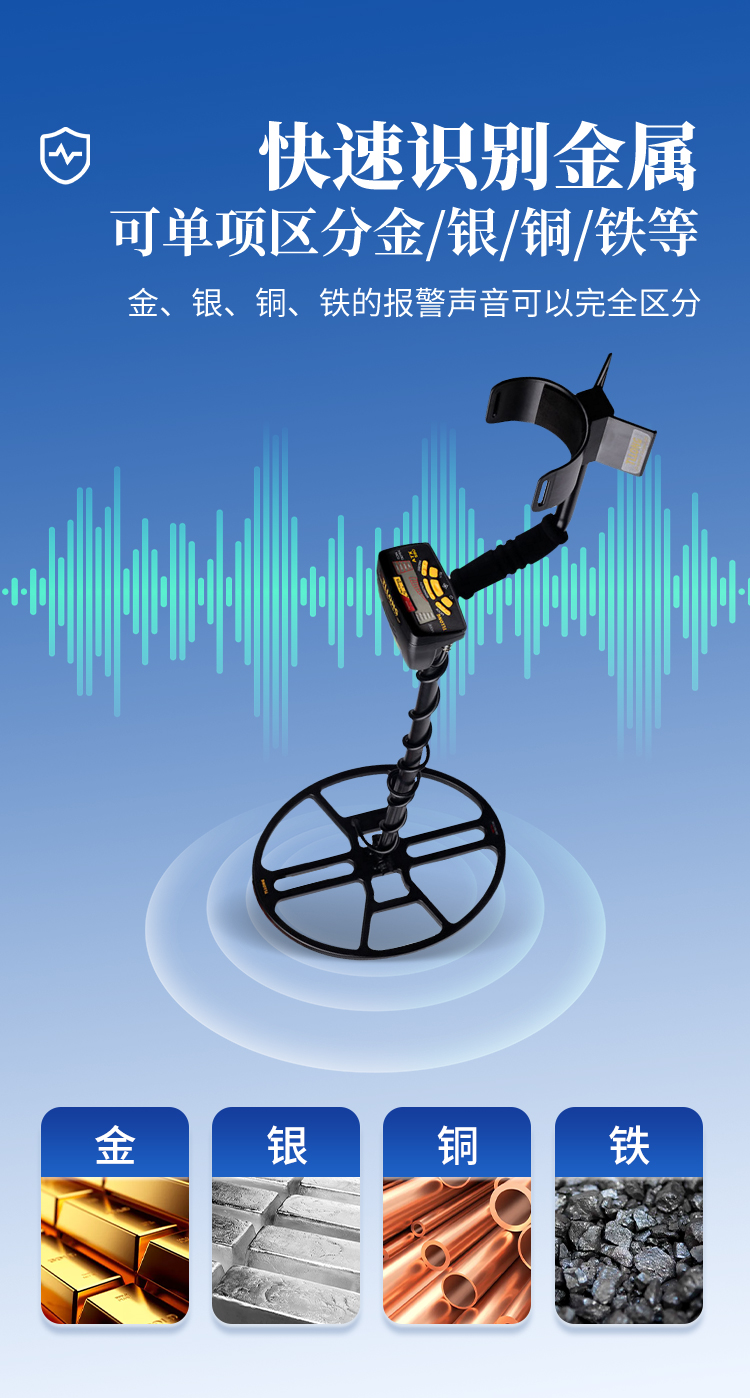 | ●探測盤:全新配置一款15存“DD”防水探測盤,可以擴(kuò)大該儀器的探測范圍 | ●識別能力:可以單項(xiàng)區(qū)分金,銀,銅,鐵等 | ●聲音識別能力:金、銀、銅、鐵的報(bào)警聲音可以完全區(qū)分 | ●高靈敏度:提高了更強(qiáng)的探測靈敏度,增加機(jī)器的探測深度 | ●耳機(jī):配置一個(gè)原廠配置的高清耳機(jī) | ●定位: 可以快速的定位地下金屬的準(zhǔn)確位置 | ●接收/拒絕:通過識別按鈕可以進(jìn)行單項(xiàng)選擇探測,例如:選擇黃金,該儀器只對黃金進(jìn)行報(bào)警 | ●硬幣深度顯示:在主機(jī)的右側(cè)有個(gè)顯示小金屬的深度 | ●電量狀況顯示: 可以顯示電源現(xiàn)有的電量 | ●定位按鈕: 可以精準(zhǔn)定位金屬的位置 | ●五種探測模式: 可以選擇默認(rèn)探測模式,也可以自定義探測模式 | 珠寶模式(可以刪除鐵,找到細(xì)小的金屬,比如戒指,耳環(huán),項(xiàng)鏈等) | 自定義模式(可以單項(xiàng)選擇性探測,選擇自己想要探測的金屬類型) | 遺跡模式(可以將鐵刪除,只探測有色金屬提高地下金屬探測效率) | 硬幣模式(這種識別模式的目的是排除酸性垃圾,許多拉環(huán)和標(biāo)簽紙檢) | 全金屬模式(可以探測所有的金屬、金、銀、銅、鐵等) |