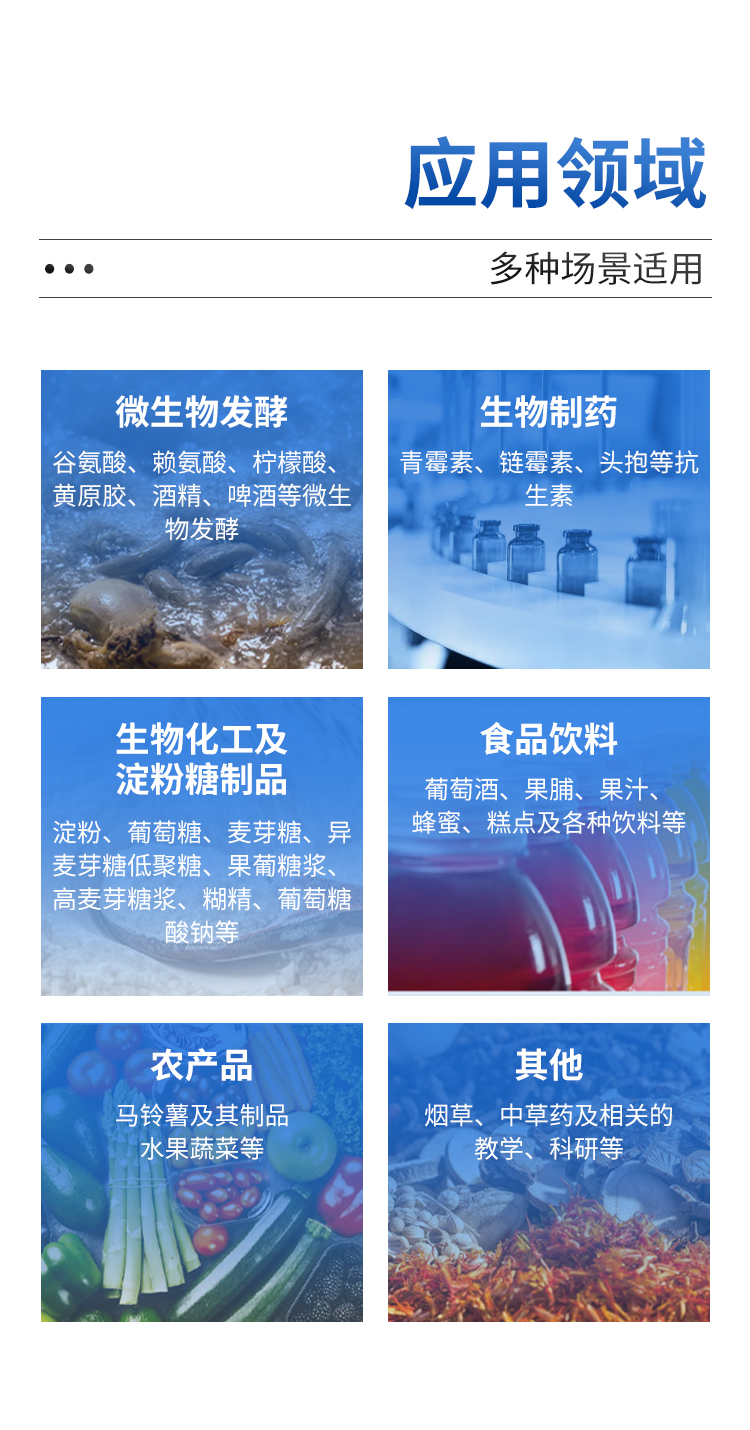 | 微生物發酵:谷氨酸、賴氨酸、檸檬酸、黃原膠、酒精、啤酒等微生物發酵 | 生物制藥:青霉素、鏈霉素、頭抱等抗生素 。生物化工及淀粉糖制品: | 淀粉、葡萄糖、麥芽糖、異麥芽糖低聚糖、果葡糖漿、高麥芽糖漿、糊精、葡萄糖酸鈉等。 | 食品飲料:葡萄酒、果脯、果汁、蜂蜜、糕點及各種飲料等。馬鈴薯及其制品、水果 | 蔬菜等農產品 | 其他:煙草、中草藥及相關的教學、科研等 |