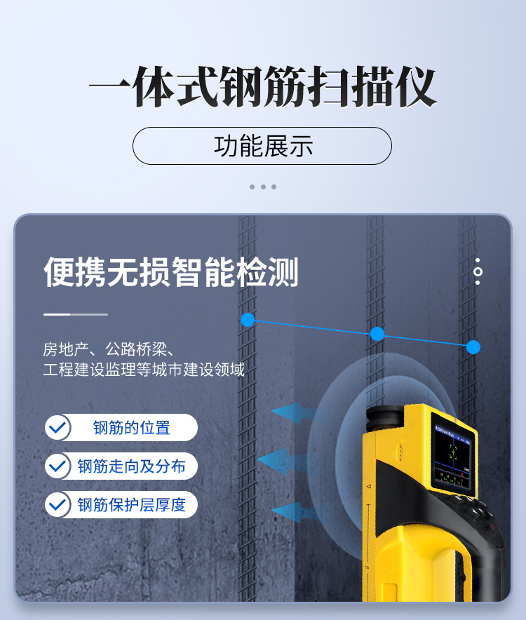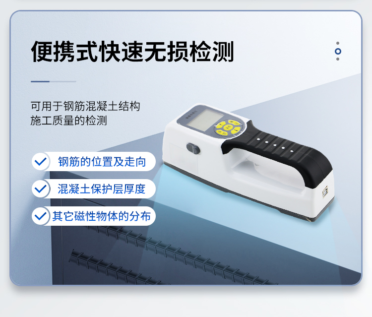 產(chǎn)品簡介:該機為內(nèi)置一體式探頭,無須連接引線,可手持直接操作是一種便攜式無損鋼筋保護(hù)層厚度檢測儀器。可用于鋼筋混凝土結(jié)構(gòu)施工質(zhì)量的檢測。能夠在混凝土表面確定鋼筋的位置、布筋情況,測量混凝土保護(hù)層厚度,此外也可對混凝土結(jié)構(gòu)中的磁性體及導(dǎo)電體的位置進(jìn)行檢測,如墻體內(nèi)的電纜、水暖管道等,施工前的探測可以有效