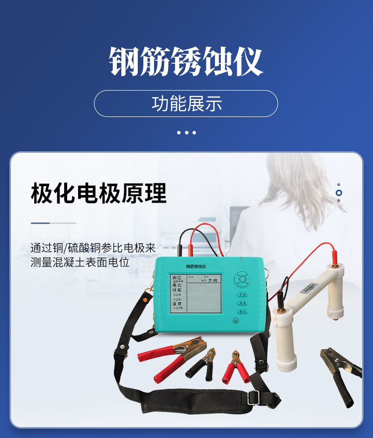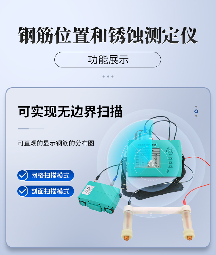 | TY-XS100鋼筋銹蝕檢測儀,采用極化電極原理,通過銅/硫酸銅參比電極來測量混凝土表面電位,根據(jù)鋼筋銹蝕生產(chǎn)的電位大小或形成的電位梯度大小判斷鋼筋是否銹蝕或銹蝕程度。 | 測量混凝土表面電位從而達(dá)到無損檢測混凝土中鋼筋的銹蝕程度。 | 儲存每個測區(qū)對應(yīng)位置的電位值,并用圖形顯示。并將數(shù)據(jù)傳輸?shù)缴衔粰C軟件中,并對其進(jìn)行操作。 |