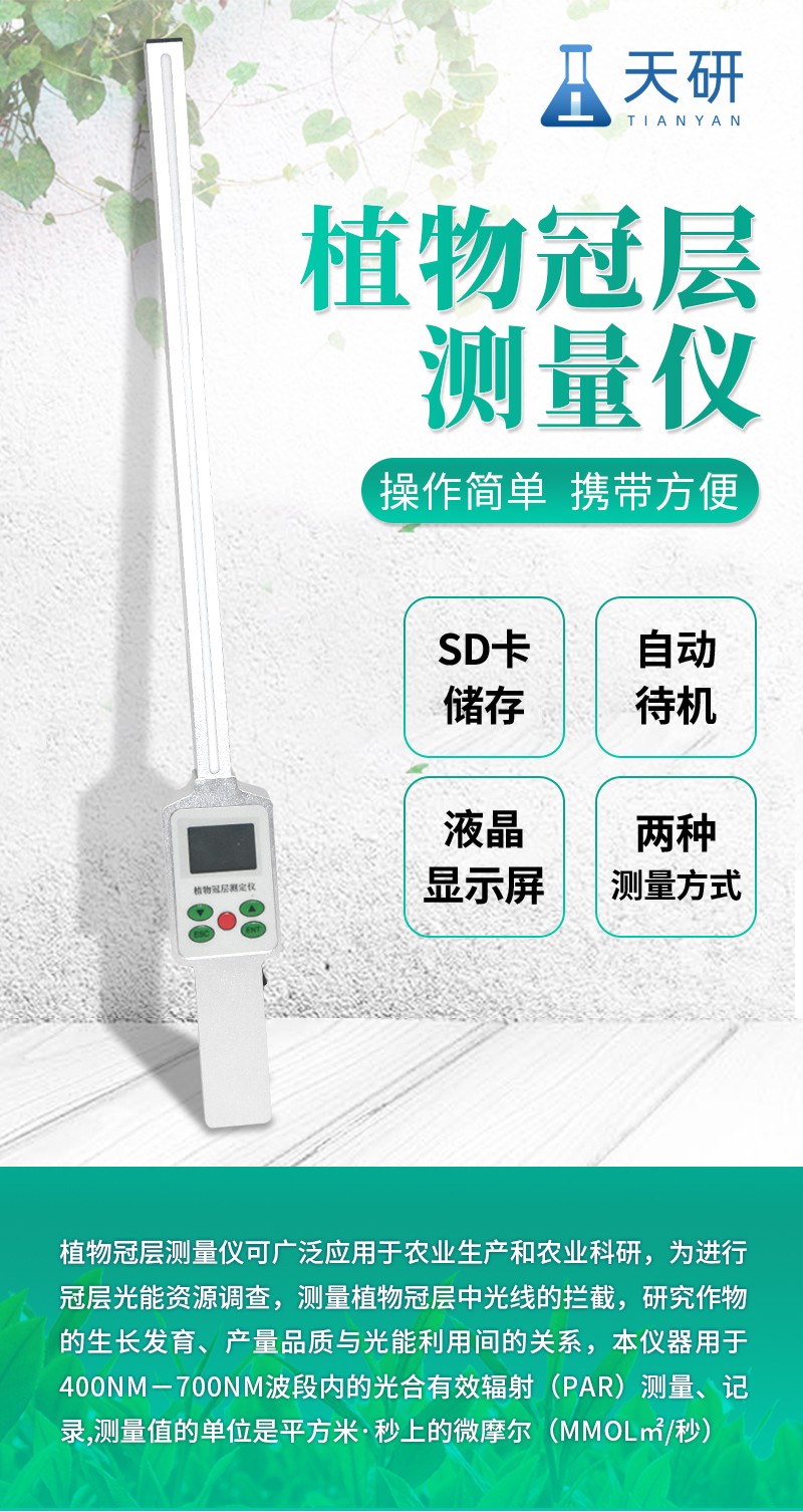 廣泛應(yīng)用于農(nóng)業(yè)生產(chǎn)和農(nóng)業(yè)科研,為進(jìn)行冠層光能資源調(diào)查,研究作物的生長(zhǎng)發(fā)育、產(chǎn)量品質(zhì)與光能利用間的關(guān)系, 本儀器用于400-帶700n m寬內(nèi)的光合有效輻射(PAR)自動(dòng)或手動(dòng)測(cè)量、記錄,測(cè)量值的單位是平方米·秒上的微摩爾(μmols-1m-2)。