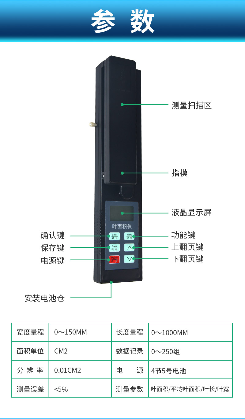 | (1)面積單位:cm2 | (2)分辨率:0.01cm2 | (3)測量誤差:<5% | (4)寬度量程:0~150mm | (5)長度量程:0~1000mm | (6)數據記錄:0~250組 | (7)電源:4節5號電池 |