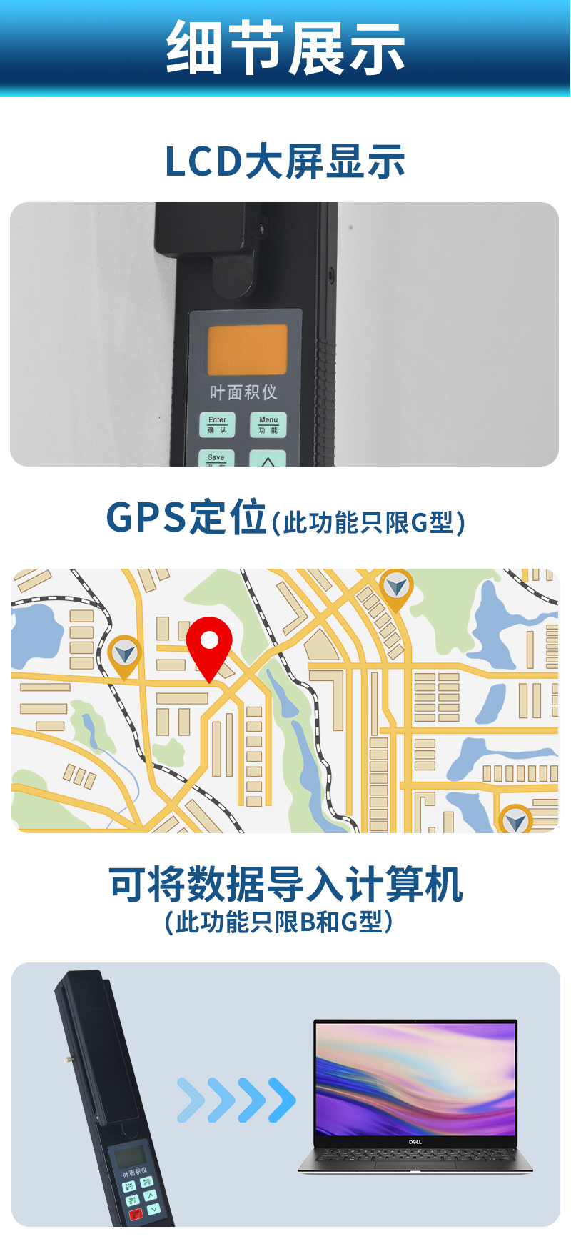 儀器可以直接測量葉片長度、寬度和面積,并集成了GPS定位系統,增加了RS232接口,可將測量數據和定位信息同時導入計算機,方便廣大科研者對數據的進一步處理。