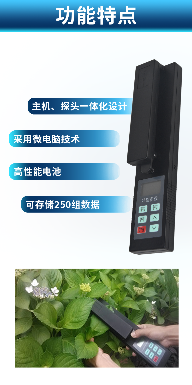 | 1)主機、探頭一體化設計,更方便操作。 | 2)采用微電腦技術,LCD大液晶顯示。 | 3)高性能電池,無需外部供電,低電壓顯示,更適用于野外測量。 | 4)一次性可測量較大葉片面積(1000*155mm2) | 5)可存儲250組數據(葉面積、葉長、葉寬)。 | 6)可測量葉片的多種參數:葉面積、平均葉面積、葉長、葉寬。 | 7)通訊接口:RSR232接口,可將數據導入計算機。(此功能只限B和G型) | 8)GPS定位:集成高速GPS定位模塊,上傳數據都自帶時間、經緯度信息,方便更有效的 |