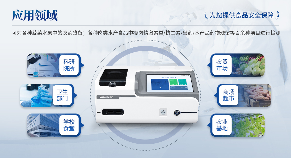 全自動農獸藥殘留檢測儀可對各種蔬菜水果中有機磷和氨基甲酸酯類農藥殘留;各種肉類水產食品中瘦肉精激素類殘留,抗生素殘留,獸藥殘留,水產品藥物殘留等百余種項目進行快速檢測。該設備廣泛應用于蔬菜批發市場、超市、商場、食藥監等部門的蔬菜和水果中的農藥殘留檢測。