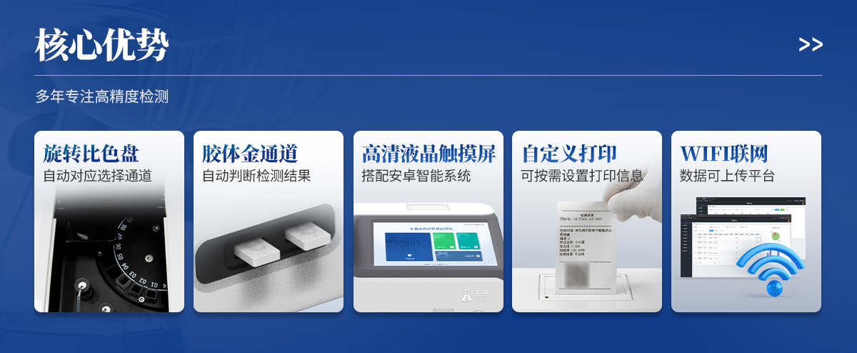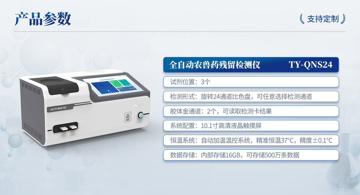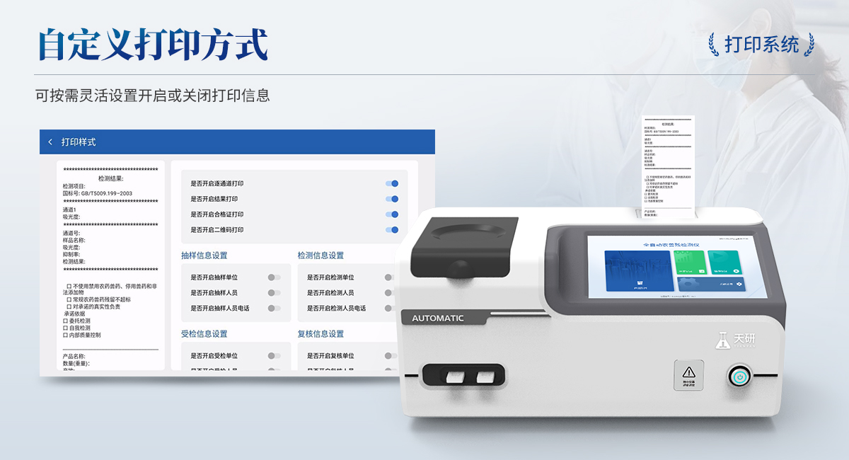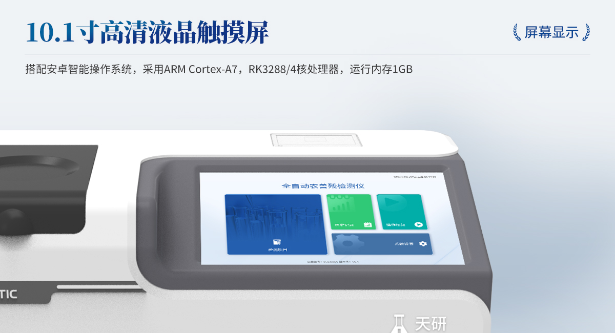 | 1. 試劑位置:3個 | 2. 農殘檢測盤:旋轉24通道比色盤,可任意選擇檢測通道,自動對應選擇通道。 | 3. 膠體金通道:2個,可讀取檢測卡結果,自動采集、處理分析,自動判斷檢測結果,并具備自動判空功能。 | 4.系統配置:10.1寸高清液晶觸摸屏,采用ARM Cortex?-A7,RK3288/4核處理器,運行內存1GB。Android7.1.1 系統分辨率1280×800。 | 5.恒溫系統:具有自動加溫溫控系統,精準恒溫37℃,精度±0.1℃。 | 6.添加系統:儀器按照試劑要求自動、按時、按量加入試劑,并且自動對未正常放置的樣本或異常的樣本進行檢查并提示。 | 7.清洗功能:儀器具備回流及自動清洗管路功能,避免試劑污染。 | 8.混勻功能:設備具備自動混勻功能。 | 9.光源校準:設備可自動校準,確保檢測準確度。 | 10.實時監控:儀器測試過程中屏幕顯示運行狀態,可實時查看。 | 11.數據存儲:內部存儲16GB,可存儲500萬條數據。 | 12.樣品多選功能:設備具備樣品一鍵多選功能,選擇樣品自動匹配檢測通道。 | 13.項目預設:可提前設置單個及多個相同或不相同的檢測任務,可單次或者多次調取,減少檢測時間。 | 14.自定義打印系統:內置自定義打印系統,可按需靈活設置開啟或關閉:產品合格證(國家農業部標準),二維碼,抽樣信息、檢測信息,受檢信息等信息的打印。 | 15.A4版本報告打印功能:設備可自動生成A4版報告,A4報告帶二維碼,可掃描二維碼生成電子版,并可識別真偽。 | 16.傳輸方式:儀器配備無線通信模塊: 4G(APN)通訊模塊、Wifi模塊,藍牙傳輸模塊,同時具有USB接口以及RJ45接口能以多種方式實現數據保存和數據傳輸功能,設備數據可以同步上傳至平臺。 | 17.系統17.數據監管系統:設備自帶監管平臺,并可同步對接監管平臺,數據可局域網和互聯網數據上傳,檢測結果可直接傳至食品安全監管平臺。達到食品安全問題預估、預警。 | 18.系統遠程更新功能:無需設備返廠,即可遠程實時升級全新系統,節省時間成本及避免運輸造成設備損。 |