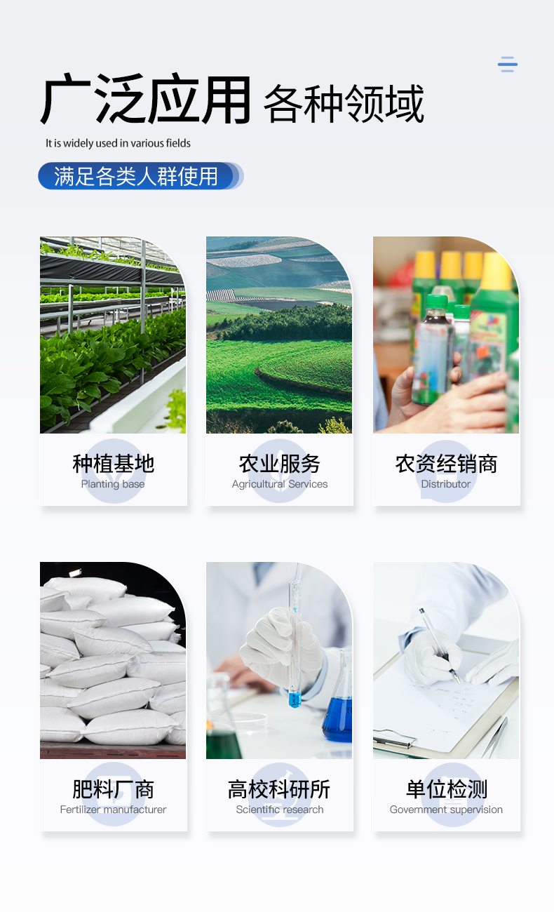●土壤銨態(tài)氮、土壤有效磷、土壤速效鉀、土壤硝態(tài)氮、土壤水解氮、土壤全氮、土壤全磷、土壤全鉀、土壤有機質(zhì)(丘林法)、土壤有機質(zhì)(浸提法)、土壤總有機碳、土壤碳氮比、PH值、含鹽量、水分。 ●土壤中微量元素:土壤鈣、土壤鎂、土壤硫、土壤硅、土壤硼、土壤鐵、土壤銅、土壤錳、土壤鋅、土壤氯、土壤鉬; ●土壤重金屬:土壤鉛、土壤砷、土壤鎘、土壤鉻、土壤汞、土壤鎳、土壤鋁、土壤氟、土壤鈦、土壤硒。 |