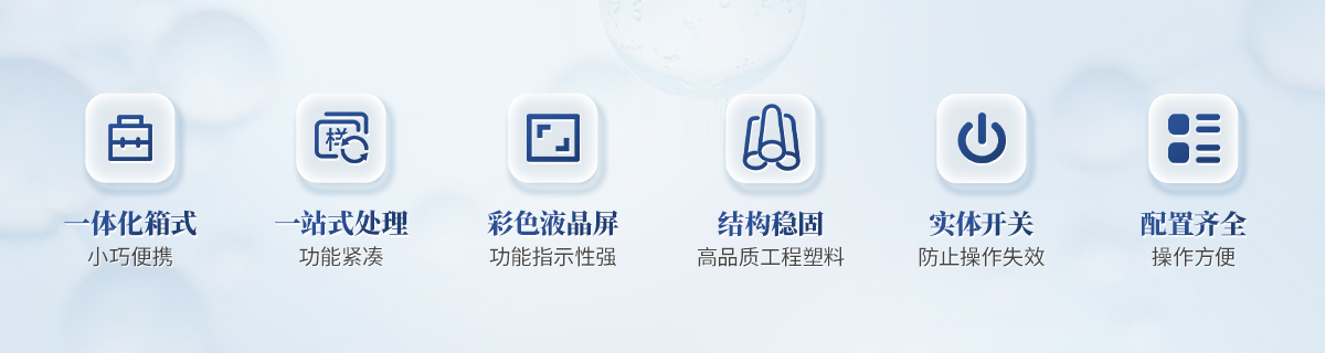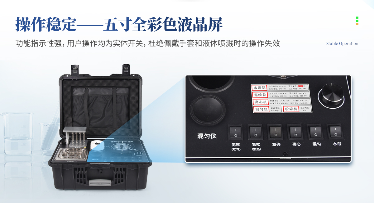 | 1、功能緊湊,集成五種樣品前處理常用的功能,完成樣品一站式處理。 | 2、結構穩固,機箱采用***工程塑料,具備**的抗沖擊性、耐腐蝕性、便攜性。 | 3、操作穩定,機器采用五寸全彩色液晶屏,功能指示性強,用戶操作均為實體開關,杜絕佩戴手套和液體噴濺時的操作失效。 |