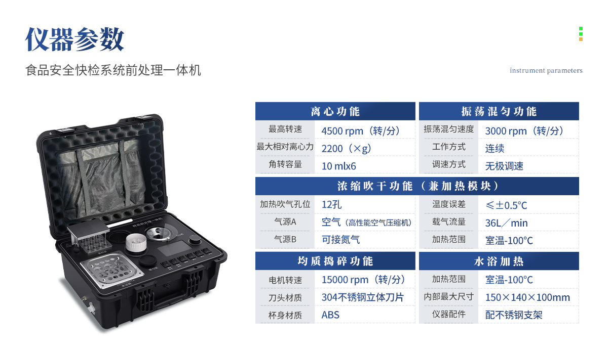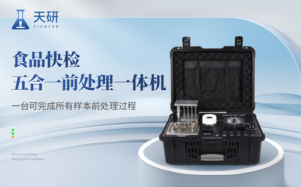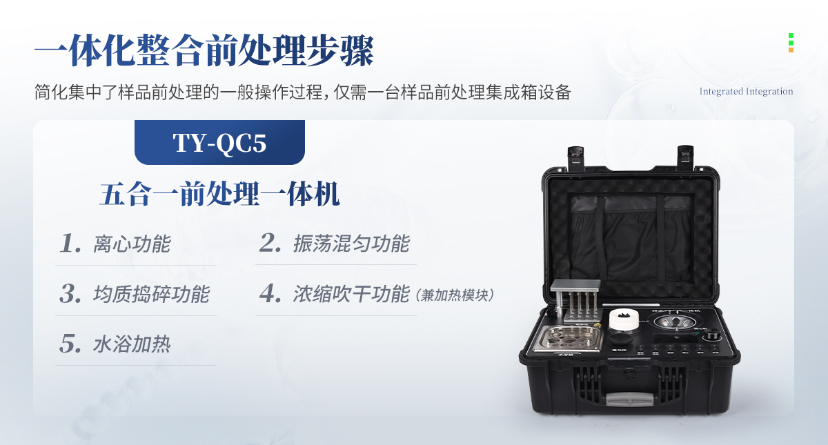 應國內用戶的實際需求,自行研制開發的新型儀器——QC05型樣品前處理一體機。樣品前處理集成箱將樣本前處理過程中樣品濃縮、水浴恒溫、離心分層、均質、振蕩混勻等步驟所需設備進行集成,僅需一臺樣品前處理集成箱設備即可完成所有樣本前處理過程,并且方便攜帶,不僅適用于現場檢測使用,還可用于色譜、質譜等分析樣品的純化和制備。