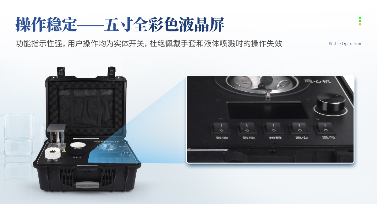 | 1、功能緊湊,集成四種樣品前處理常用的功能,完成樣品一站式處理。 | 2、結構穩固,機箱采用***工程塑料,具備**的抗沖擊性、耐腐蝕性、便攜性。 | 3、操作穩定,機器采用五寸全彩色液晶屏,功能指示性強,用戶操作均為實體開關,杜絕佩戴手套和液體噴濺時的操作失效。 |