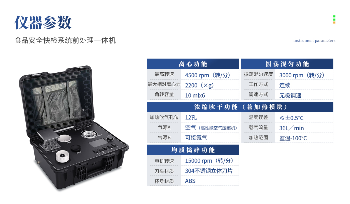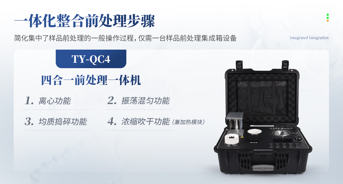 QC4型四合一樣品檢測前處理一體機(箱)是集吹干、離心、均質、混勻功能的一體化整合,極大的簡化和集中樣品前處理的一般操作過程,結合移動便攜的工程塑料箱體,特別適合農獸藥殘留畜禽水產品質量安全現場快速檢測。
