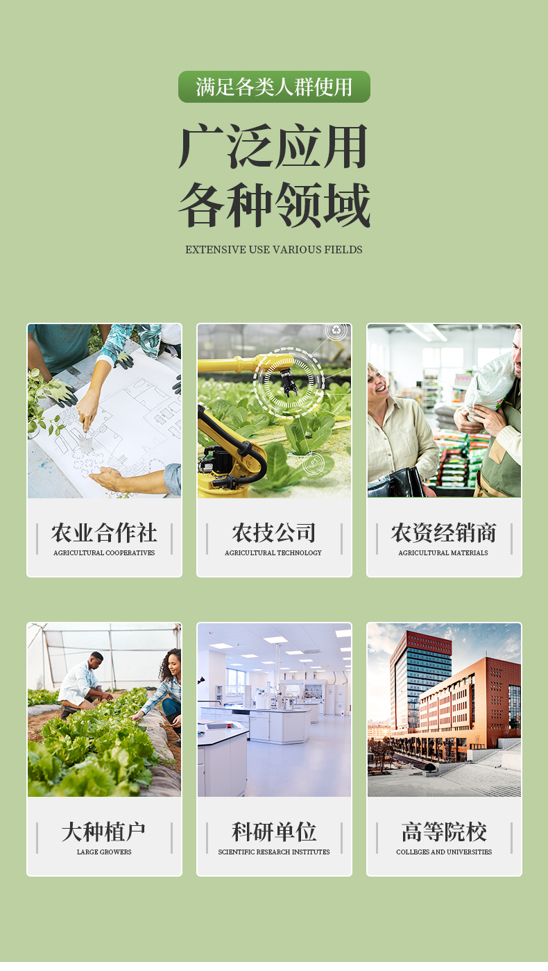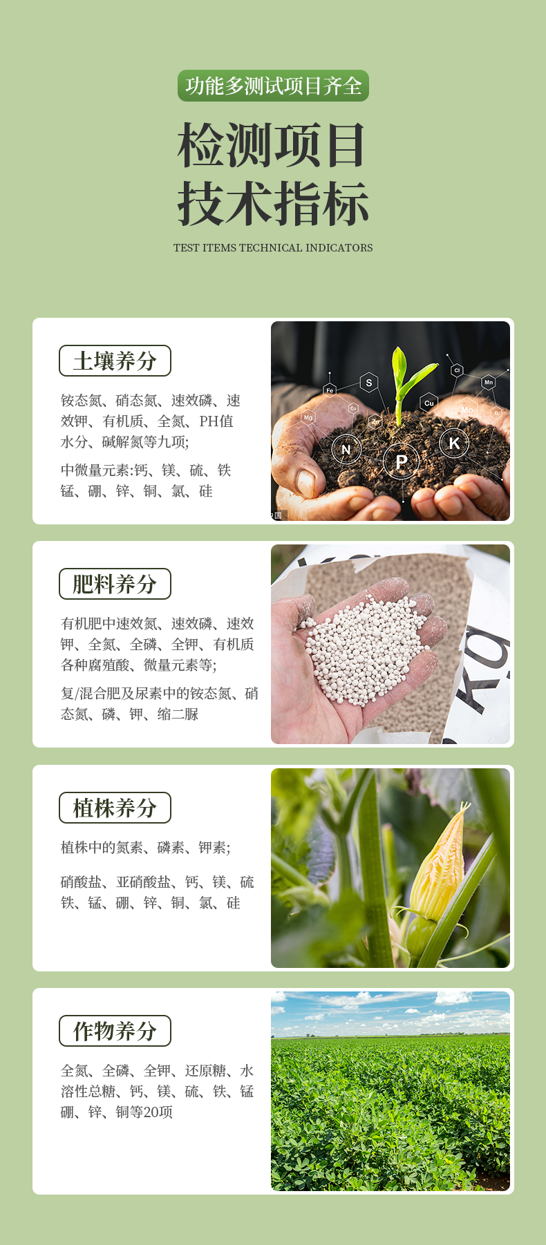 | 土壤養分:● 銨態氮、速效磷、速效鉀、水份、有機質、酸堿度(pH試紙法)等項; | 肥料養分:● 單質化肥中的氮、磷、鉀; ● 復(混)合肥及尿素中的銨態氮、磷、鉀; ● 有機肥中速效氮、速效磷、速效鉀、全氮、全磷、全鉀、pH、有機質等。 |