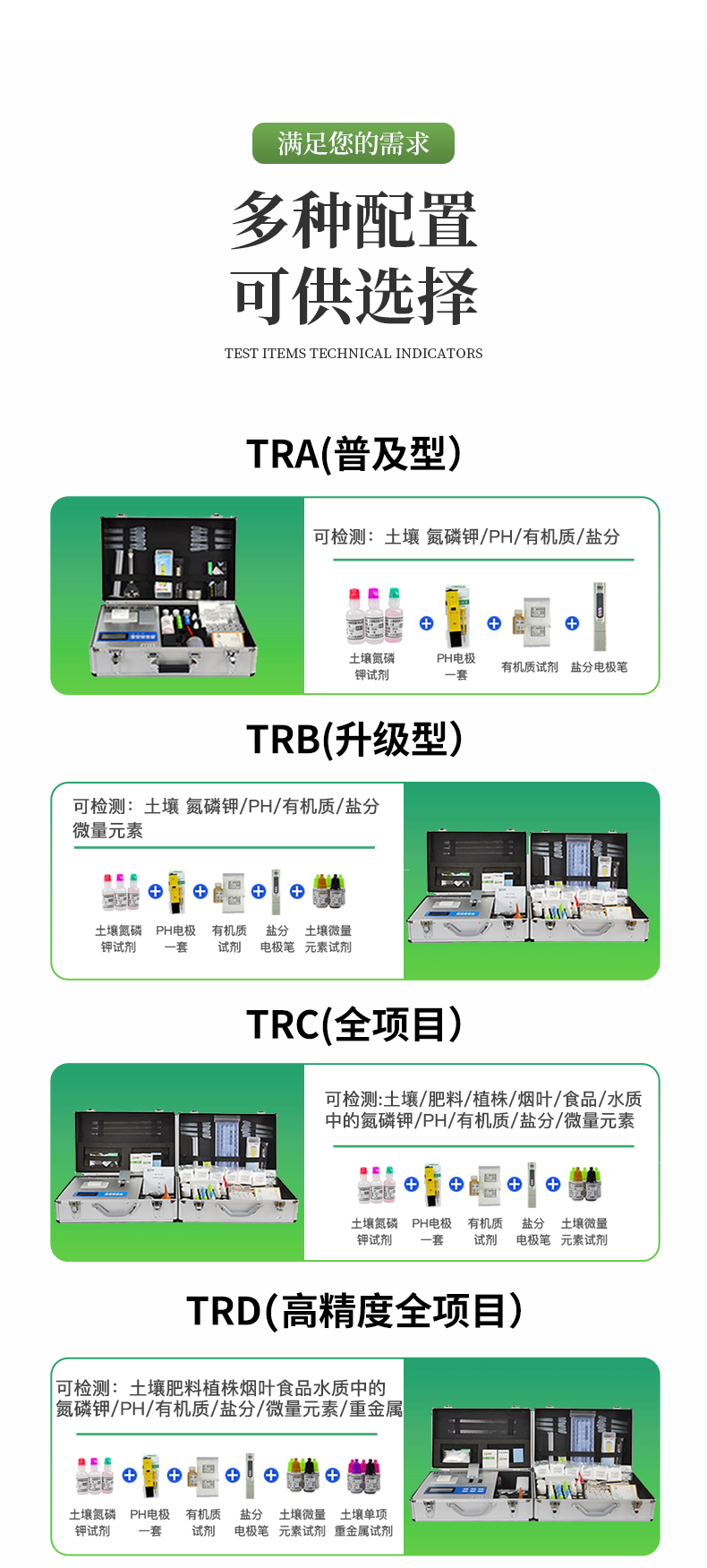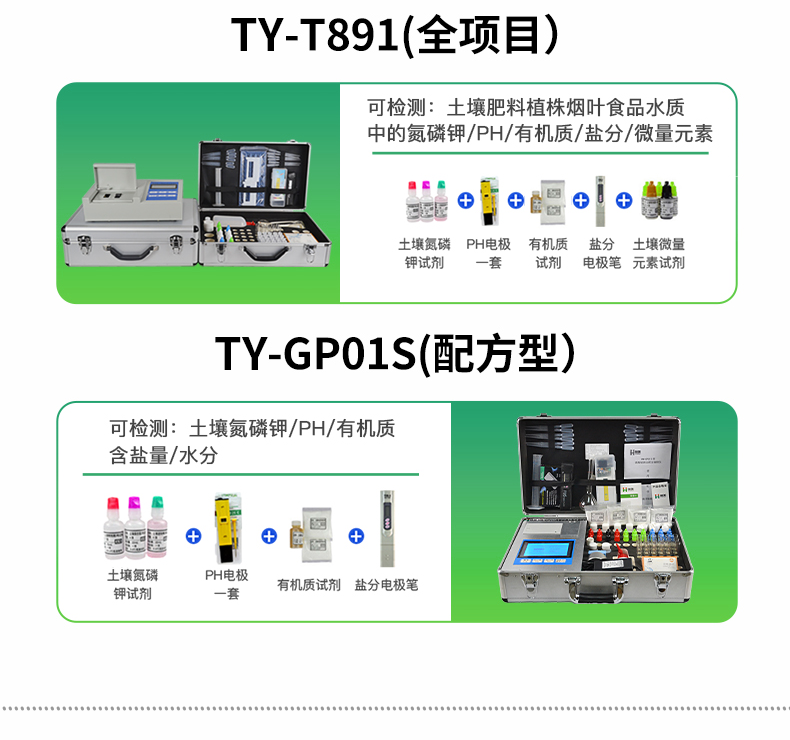 | 土壤養分:● 銨態氮、速效磷、速效鉀、水份、有機質、酸堿度、以及鈣、鎂、硫、硼、氯、硅等各種中微量元素; | 肥料養分:● 單質化肥中的氮、磷、鉀; ● 復(混)合肥及尿素中的銨態氮、磷、鉀; ● 有機肥中速效氮、速效磷、速效鉀、全氮、全磷、全鉀、pH、有機質等。 |
