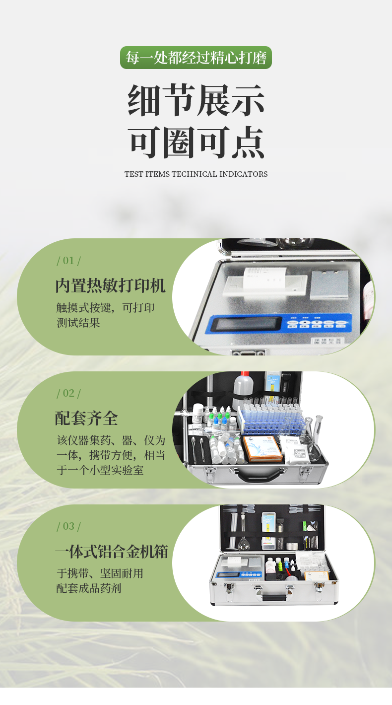 | 儀器整機質保五年,終身免費維修服務,免費郵寄儀器、免費培訓、免費提供檢測試劑。 | 終身免費提供土肥等農業相關技術支持! | 配置清單(兩個鋁合金箱子): |