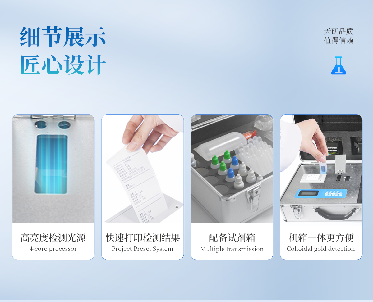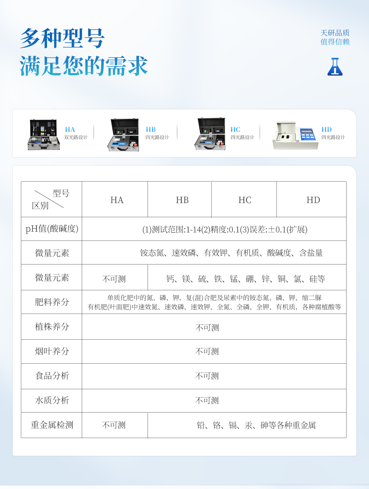| 全國獨家《機箱/藥劑一體式鋁合金機箱》**設(shè)計,便于攜帶、堅固耐用,配套檢測方法及成品藥劑。 | 微電腦控制,數(shù)字化線路、程序化設(shè)計,液晶顯示,交直流兩用,測試數(shù)據(jù)可存儲查詢,可野外流動測試,**程度降低操作者的失誤和勞動強度。 | 分辨率:0.001,觸摸式按鍵,內(nèi)置新一代熱敏打印機,可打印測試結(jié)果。 | 復(fù)合肥養(yǎng)分含量檢測儀可檢測化肥、有機肥(含葉面肥、水溶肥、噴施肥)生物肥等中的速效氮、速效磷、有效鉀、全氮、全磷、全鉀、有機質(zhì)、酸堿度,鈣、鎂、硫、鐵、錳、硼、鋅、銅、氯、硅、鉬等各種中微量元素以及鉛、鉻、鎘、汞、砷、鎳、鋁、氟、鈦、硒等各種重金屬含量。 | 采用高亮LED光源,濾光式處理,保證光源波長穩(wěn)定, 硅半導(dǎo)體作為信號接收系統(tǒng), 壽命長達10萬小時級別。光源穩(wěn)定,重現(xiàn)性好,準確度高。 | 比色槽部分采用單通道設(shè)計,無機械位移及磨損,光路測試定位**,保證測定結(jié)果精度。 |