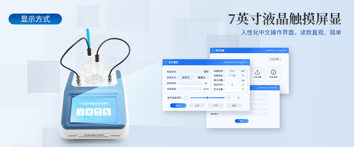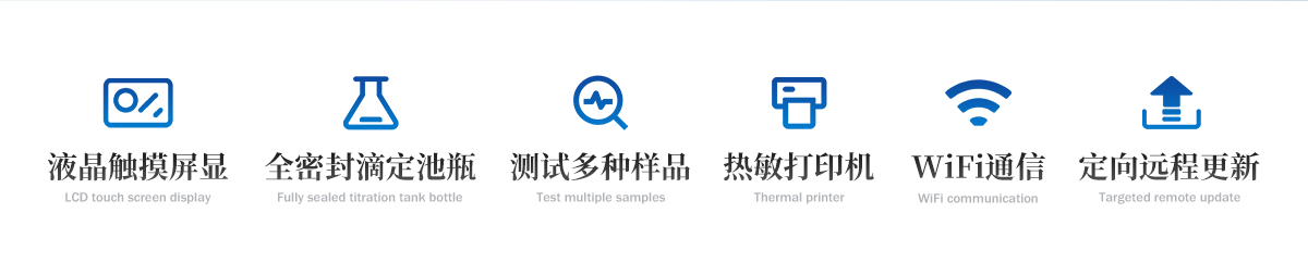 儀器特點:1.儀器主控芯片采用ARM Cortex-A7,RK3288/4核處理器,主頻1.88Ghz,運轉速度更快速,穩定性更強。2.顯示方式:7英寸液晶觸摸屏顯示,人性化中文操作界面,讀數直觀、簡單。3.儀器采用全密封滴定池瓶,避免試劑與人接觸,杜絕環境濕度對檢測的影響;檢測過程中儀器自動控制,攪拌、測定60秒左右完成,可直接顯示測