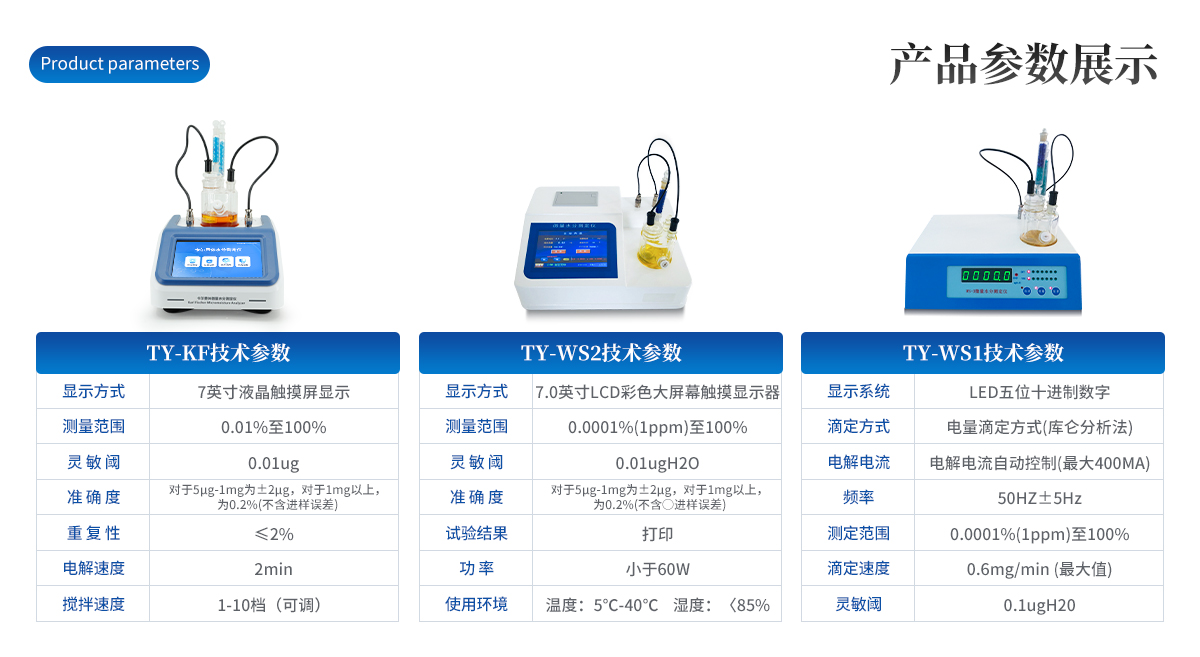 | 1.GB/T7600《運行中變壓器油水分含量測定法(庫侖法)》 | 2.GB6283《化工產品中水分含量的測定卡爾費休法(通用方法)》 | 3.SH/T0246《輕質石油產品中水含量測定法(電量法)》 | 4.SH/T0255《添加劑和含添加劑潤滑油水分測定法(電量法)》 | 5.GB/T11133《液體石油產品中水含量測定方法(卡爾費休法)》 | 6.GB/T7380《表面活性劑含水量量的測定(卡爾費休法)》 | 7.GB10670《工業用氟代甲烷類中微量水分的測定卡爾費休法》 | 8.GB/T606化學試劑水分測定通用方法卡爾費休法》 | 9.GB/T8350《變性燃料乙醇》 | 10.GB/T8351《車用乙醇汽油》 | 11.GB/T3776.1《農藥乳化劑水分測定法》 | 12.GB/T6023工業用丁二烯中微量水分的測定卡爾費休庫侖法》 | 13.GB/T3727工業用乙烯、丙烯中微量水的測定 | 14.GB/T7376工業用氟代烷烴中微量水分的測定 | 15.GB/T18619.1天然氣中水含量的測定卡爾費休-庫侖法 | 16.GB/T1600-農藥水分測定方法》 | 17.GB/T11146《原油水含量測定法(卡爾費休庫侖法)》 | 18.GB/T12717《工業用乙酸酯類試驗方法》 | 19.GB/T18826工業用1,1,2-四氟乙烷(HFC-134a) | 20.符合國家藥典中關于卡爾費休法測定藥品中水分含量的技術要求。 |