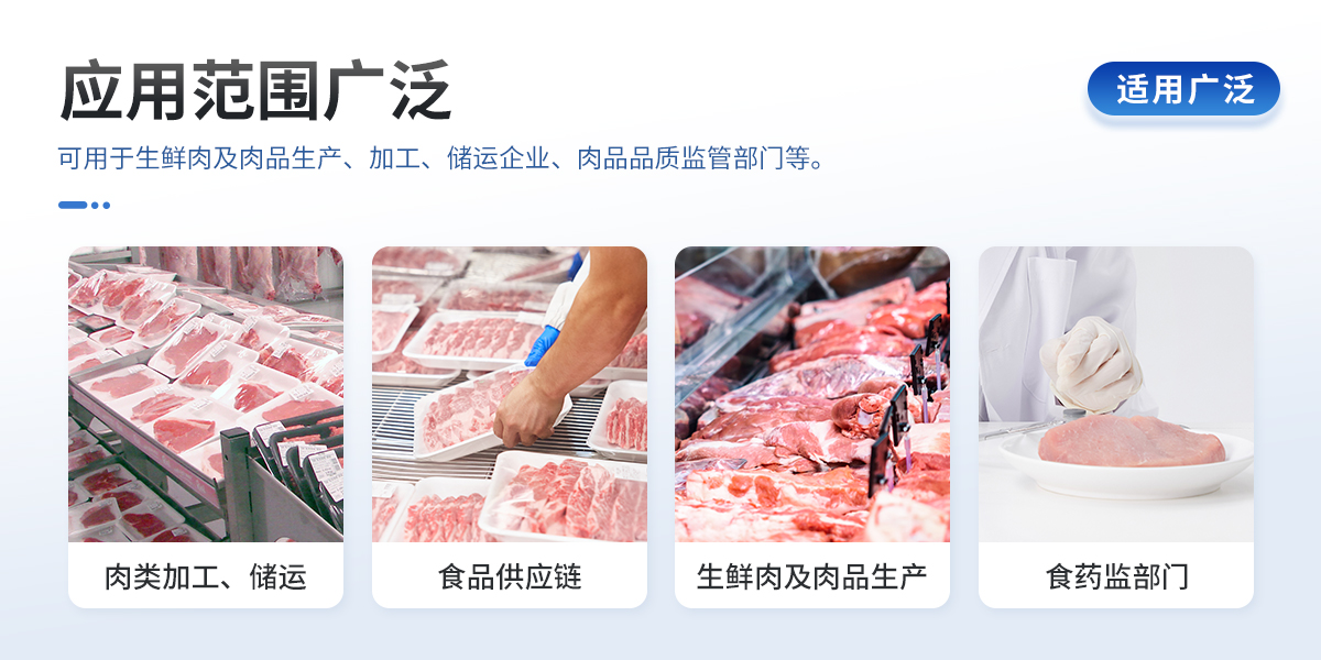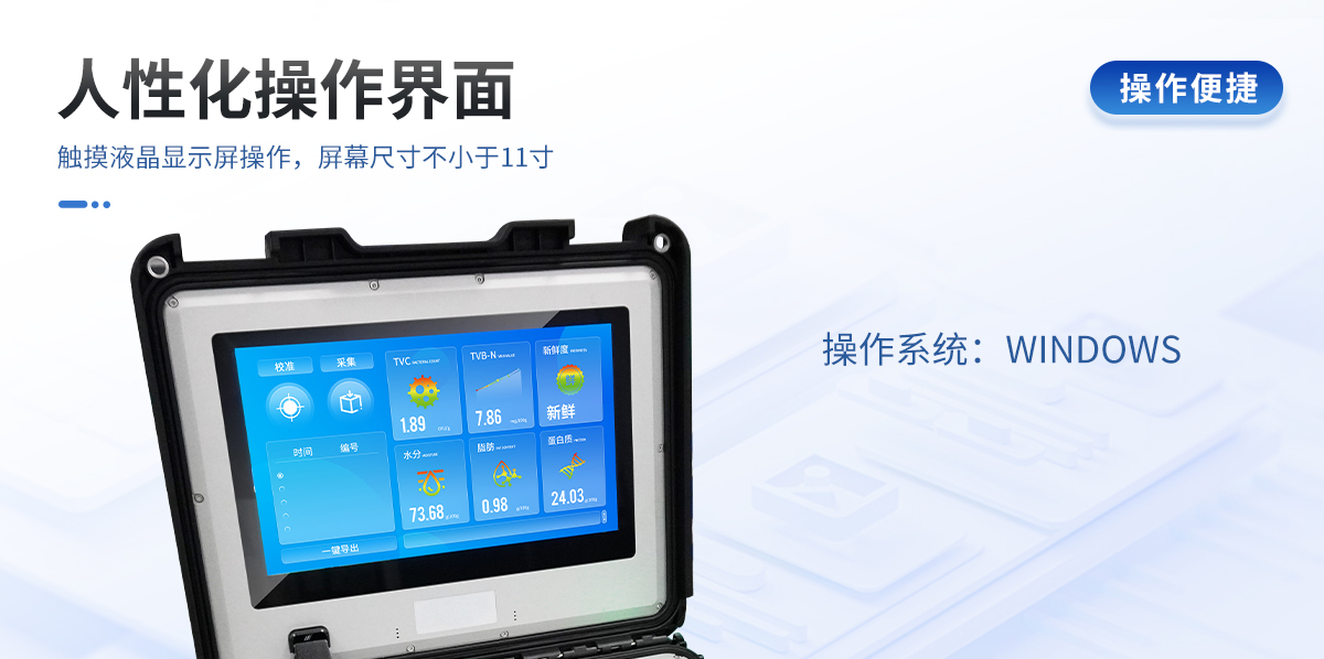 可用于檢測生鮮肉的蛋白質、脂肪、水分、pH、TVC、TVB-N、新鮮度、L*、A*、B*等品質參數(shù)。配備手提箱式防水減震外殼、大尺寸觸控屏幕并內置大容量電池,可一鍵自動校準,是一款適合移動作業(yè)場景的高精度生鮮肉品質檢測儀,其可用于生鮮肉及肉品生產、加工、儲運企業(yè)、肉品品質監(jiān)管部門等。