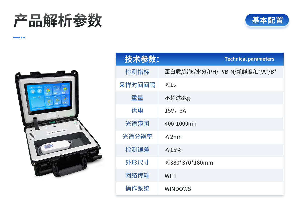 | 1. ※檢測指標:蛋白質、脂肪、水分、PH、TVB-N、新鮮度、L*、A*、B* | 2. 采樣時間間隔:≤1s | 3. 重量:不超過8kg | 4. 供電:15V,3A | 5. 觸摸液晶顯示屏操作,屏幕尺寸不小于11寸 | 6. ※光譜范圍:400-1000nm | 7. ※光譜分辨率:≤2nm | 8. 檢測誤差:≤15% | 9. ※提供模型自動優(yōu)化平臺,用戶可通過設備建立和優(yōu)化算法模型 | 10. 外形尺寸:≤380*370*180mm | 11. 網絡傳輸:WIFI | 12. 操作系統(tǒng):WINDOWS | 13. 采用便攜式手提箱設計,外殼為ABS防沖擊材料,適合在現(xiàn)場快速檢測 |