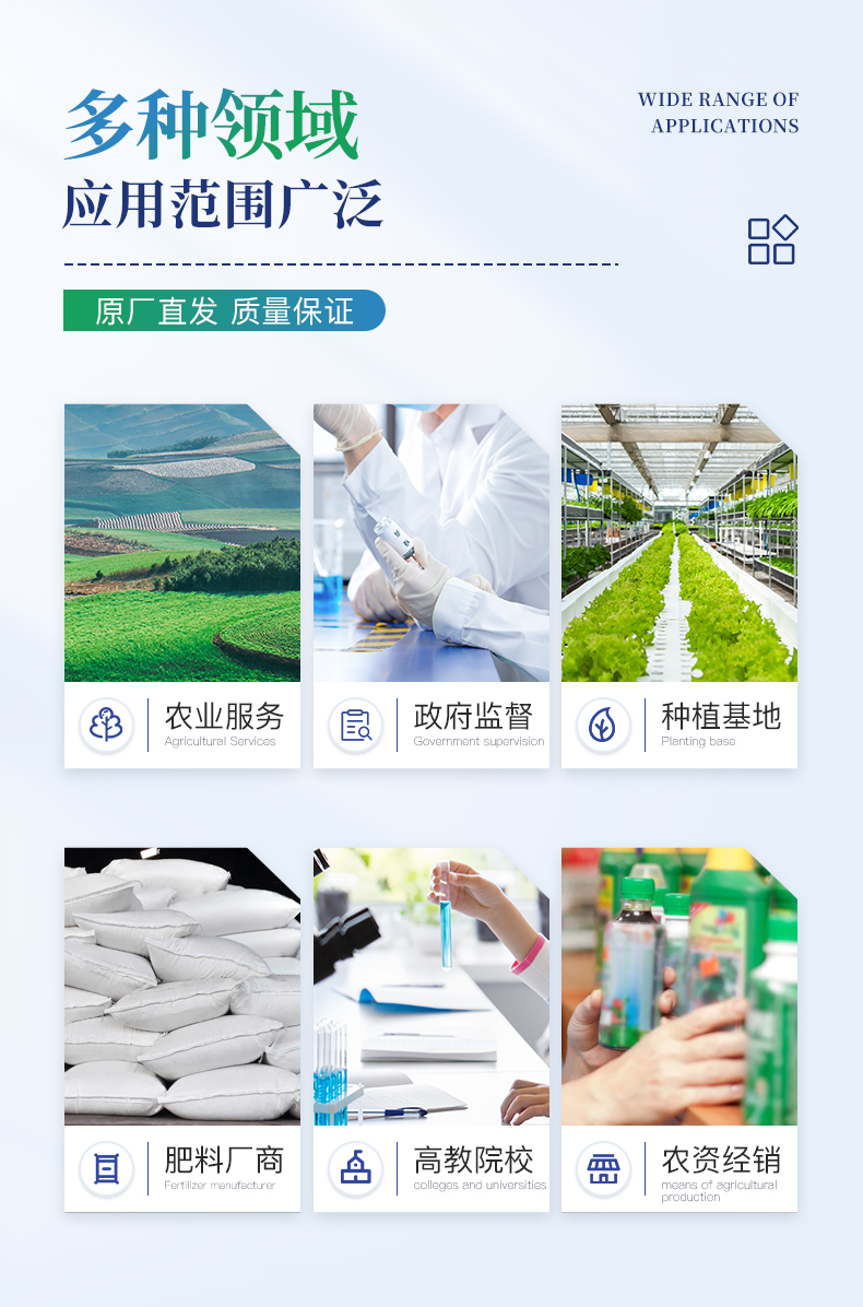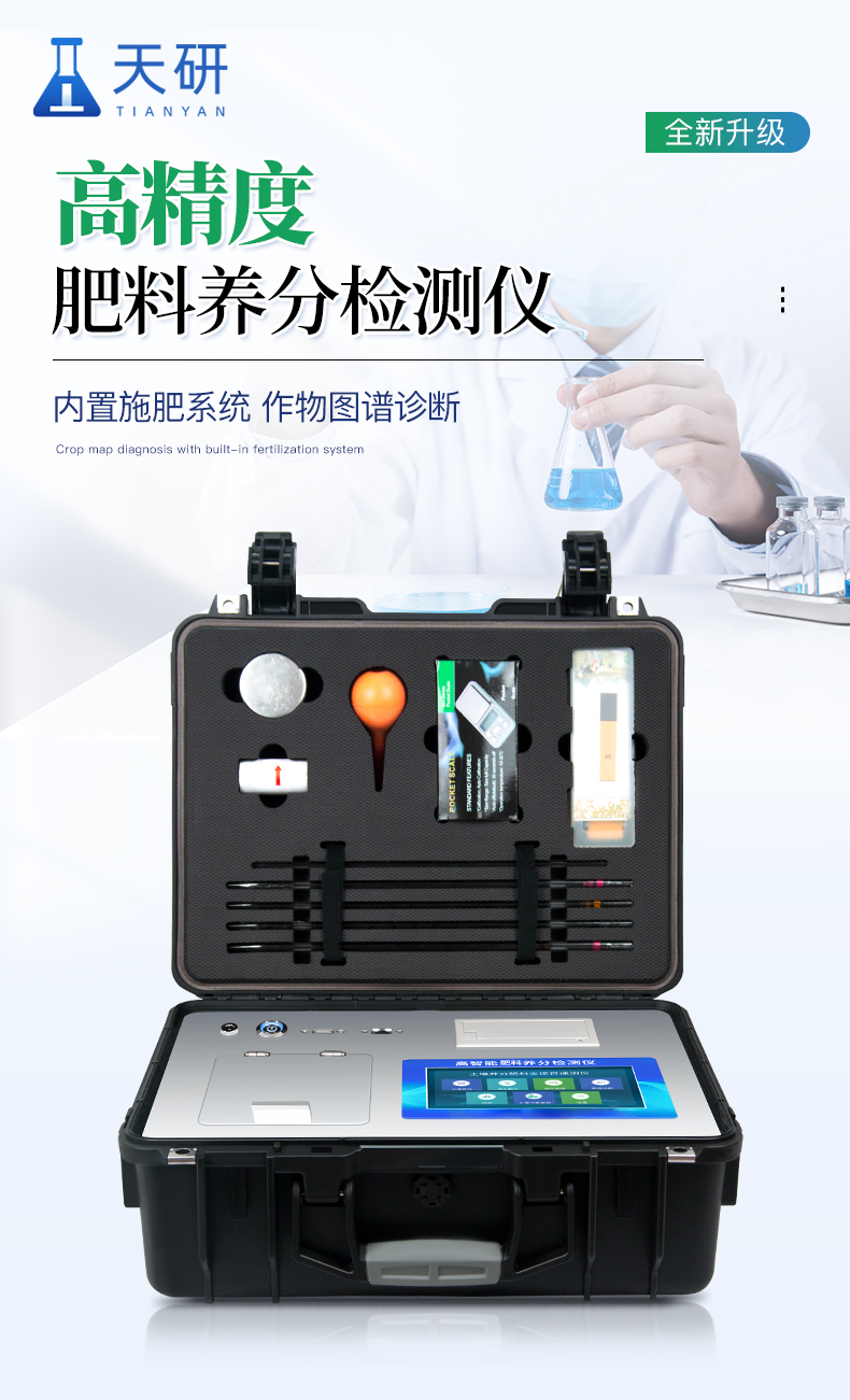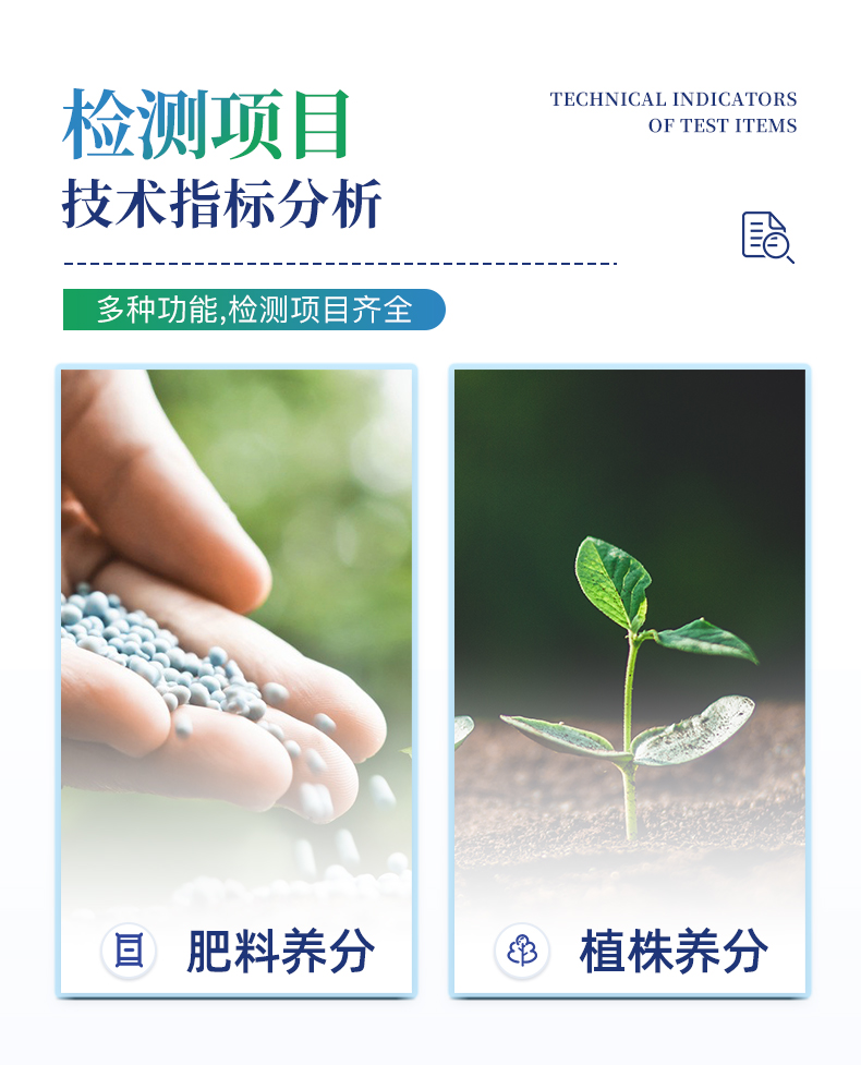 儀器特點: 可檢測化肥、有機肥(含葉面肥、水溶肥、噴施肥等)、植株中的速效氮、速效磷、有效鉀、全氮、全磷、全鉀、有機質、酸堿度,鈣、鎂、硫、鐵、錳、硼、鋅、銅、氯、硅、鉬等各種中微量元素以及鉛、鉻、鎘、汞、砷、鎳、鋁、氟、鈦、硒等各種重金屬含量。