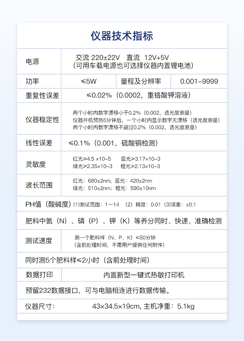 | 電源:交流 220±22V 直流 12V+5V(可用車載電源也可選擇儀器內置鋰電池) | 功率: ≤5W | 量程及分辨率:0.001-9999 | 重復性誤差: ≤0.02%(0.0002,重鉻酸鉀溶液) | 儀器穩定性:兩個小時內數字漂移小于0.2%(0.002,透光度測量)。儀器開機預熱5分鐘后,一個小時內顯示數字無漂移(透光度測量),兩個小時內數字漂移不超過0.2%(0.002,透光度測量)。 | 線性誤差: ≤0.1%(0.001,硫酸銅檢測) | 靈敏度:紅光≥4.5 ×10-5 藍光≥3.17×10-3 綠光≥2.35×10-3 橙光≥2.13×10-3 | 波長范圍 :紅光:680±2nm; 藍光:420±2nm;綠光:510±2nm;橙光:590±10nm | PH值(酸堿度): (1)測試范圍:1~14 (2)精度:0.01 (3)誤差:±0.1 | 肥料中氮(N)、磷(P)、鉀(K)等養分同時、快速、準確檢測 | 測試速度:測一個肥料樣(N、P、K)≤50分鐘(含前處理時間,不需用戶提供任何附件) | 同時測5個肥料樣≤2小時(含前處理時間) | 數據打?。簝戎眯滦鸵绘I式熱敏打印機 | 預留232數據接口,可與電腦相連進行數據傳輸。 | 儀器尺寸:43×34.5×19cm, 主機凈重:5.1kg |